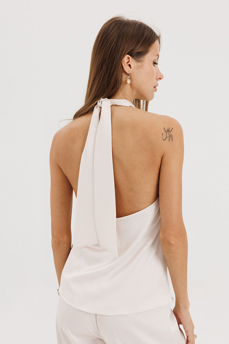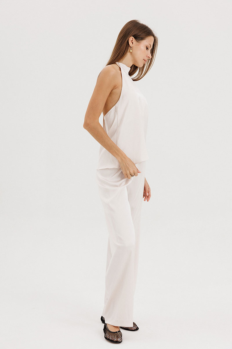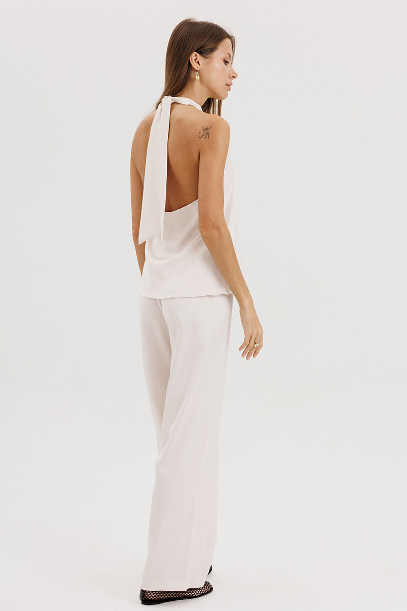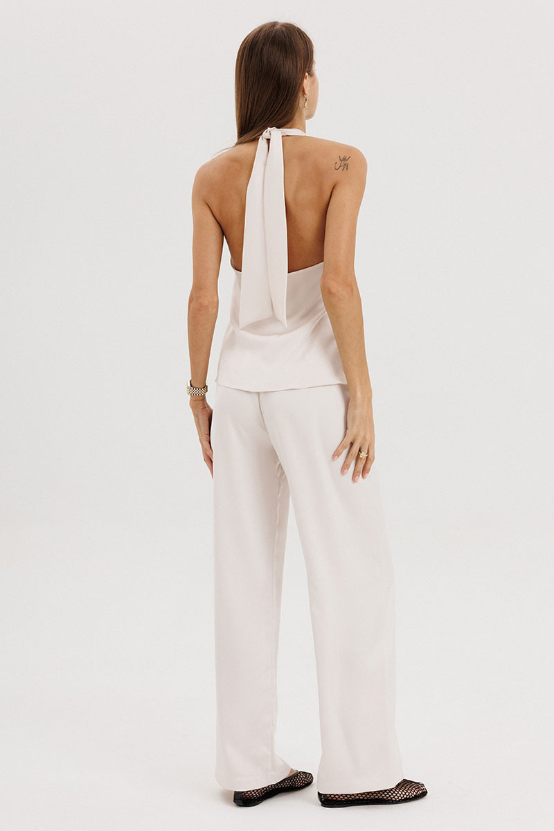 Комплект двухпредметный из топа и брюк. Прямые брюки из струящегося плотного атласа. Талия высокая, на резинке, длина по боковому шву 110 см. Топ свободного кроя выполнен из плотной атласной ткани, топ на обтачке, спинка провисает для эффектности. Топ можно нсить под люой жакет, либо с классическими брюками. Подойдет в качестве праздничного варианта. Завязывается на спине. Рост модели на фото 178 см.