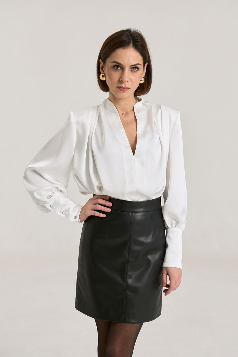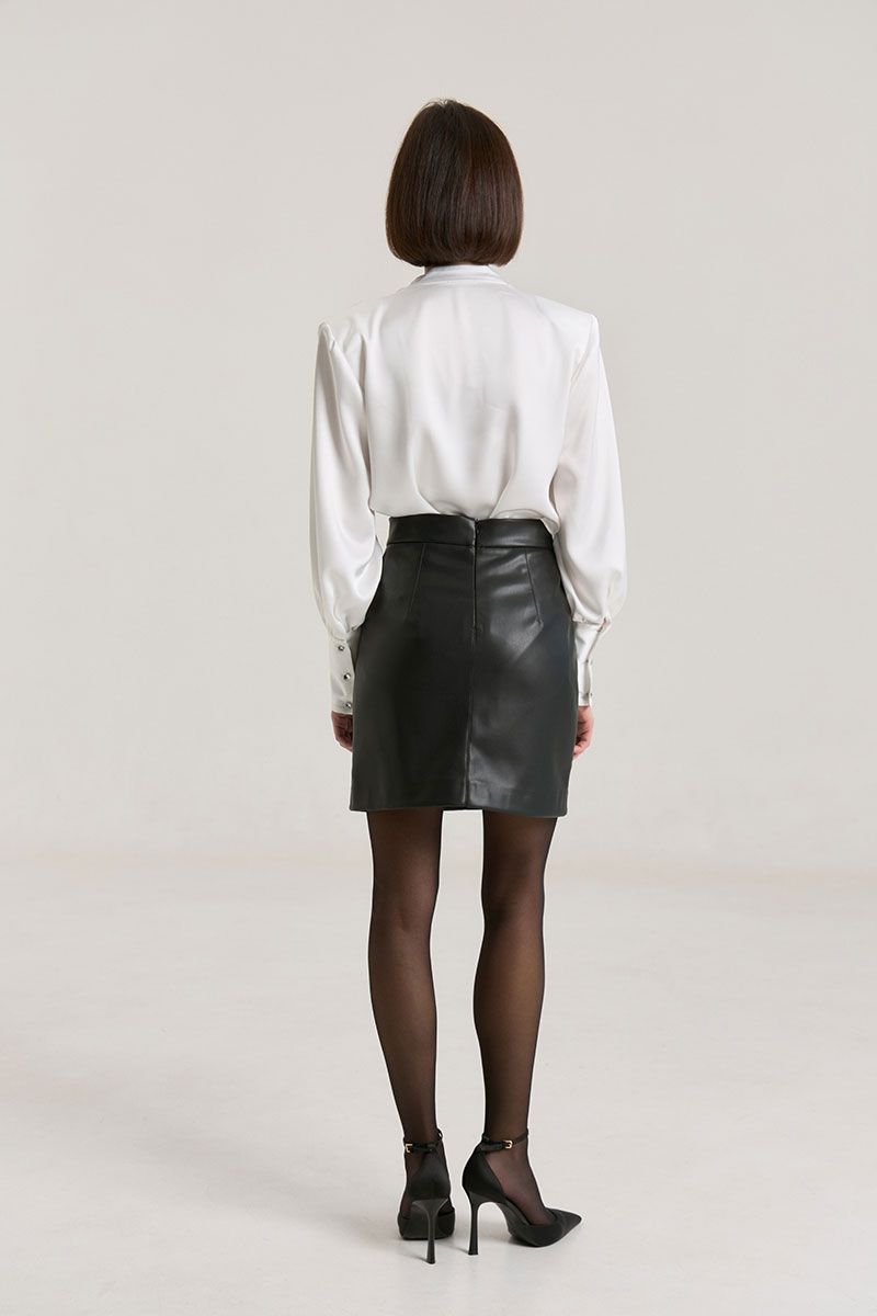 Юбка прилегающего силуэта на притачном поясе, посадка высокая, юбка на подкладке.В среднем шве застежка на потайную молнию. Юбка выполнена из мягкой экокожи, образ можно дополнить жакетом арт. 2332.