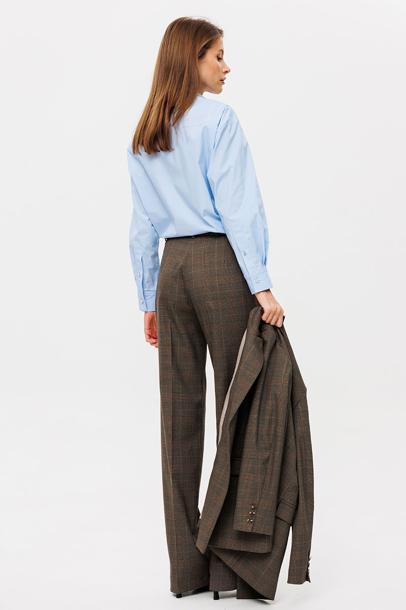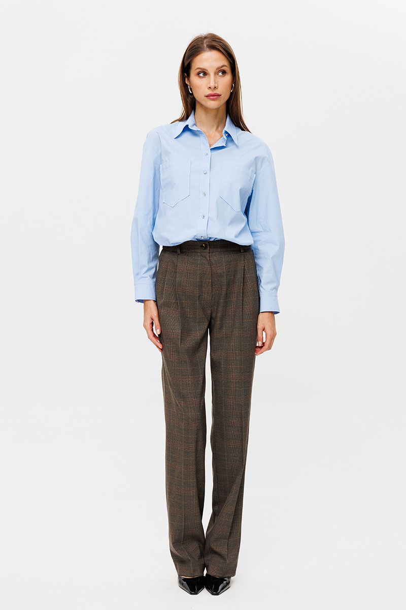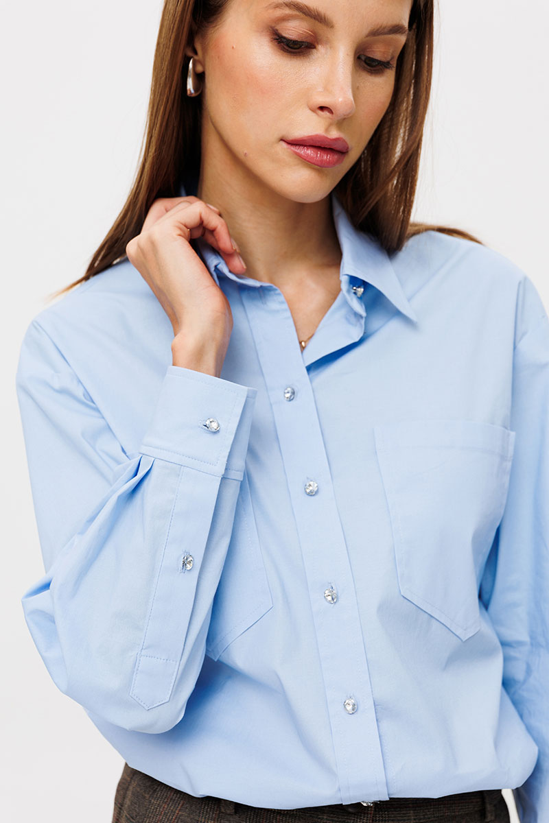 Рубашка свободного кроя с заниженной линией плеча. Рукав рубашечный, длинный с притачной манжетой. Застёжка центральная на петли и пуговицы. Низ блузки фигурной формы. Воротник стояче-отложной с отрезной стойкой.По переду нагрудные карманы. Рубашка - база в гардеробе, сочетать можно с атласными брюками, юбками из кожи, трикотажными изделиями.