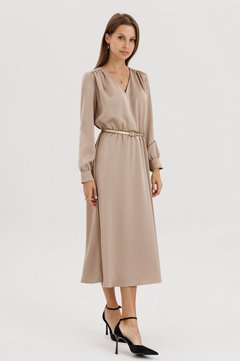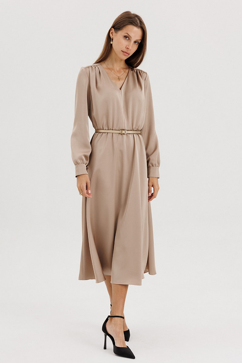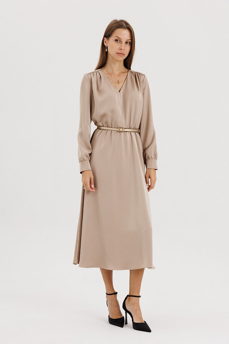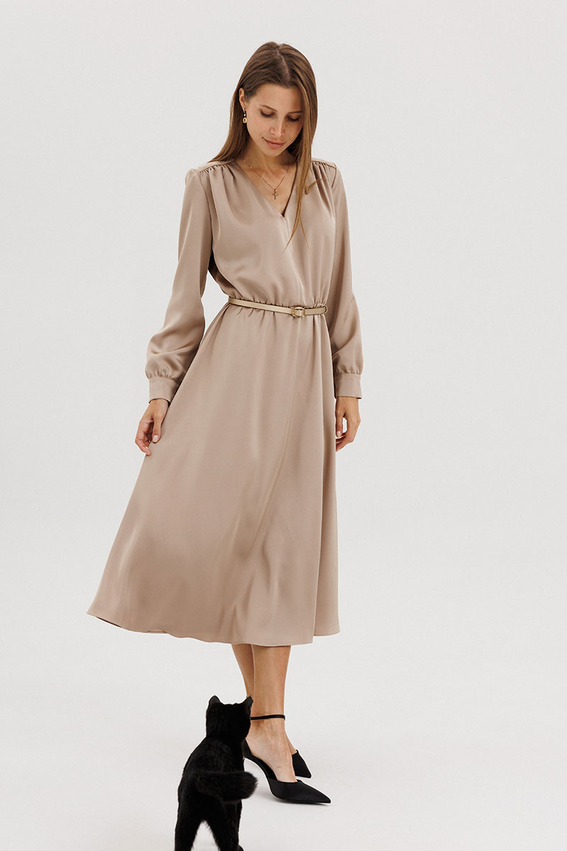Платье из вискозного атласа, в комплекте с декоративным поясом. Платье А-силуэта, отрезное по талии, юбка расширенная к низу со сборкой, платье на резинке, кокетка отрезная, со сборкой по полочке и спинке, горловина V-образная, рукав втачной с манжетой и застежкой на пуговицу. Идет в комплекте с поясом. Платье на трикотажной подкладке по низу. Рост модели на фото 178 см.