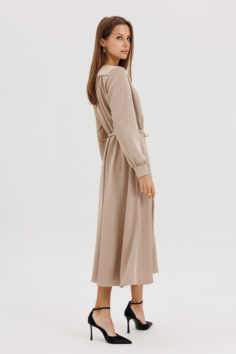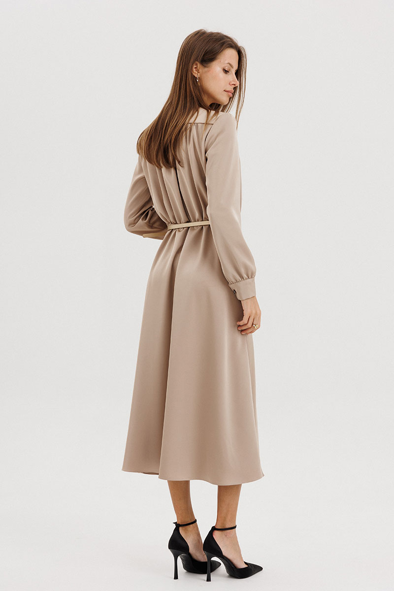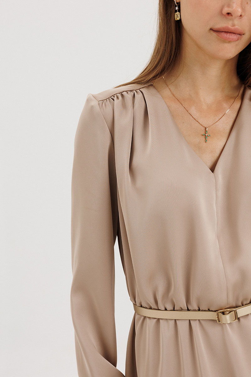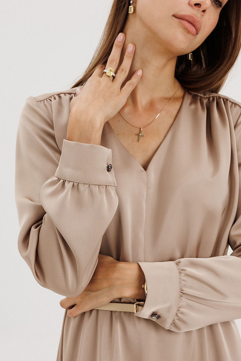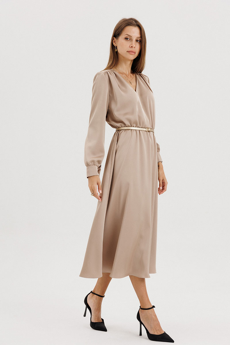 Платье из вискозного атласа, в комплекте с декоративным поясом. Платье А-силуэта, отрезное по талии, юбка расширенная к низу со сборкой, платье на резинке, кокетка отрезная, со сборкой по полочке и спинке, горловина V-образная, рукав втачной с манжетой и застежкой на пуговицу. Идет в комплекте с поясом. Платье на трикотажной подкладке по низу. Рост модели на фото 178 см.