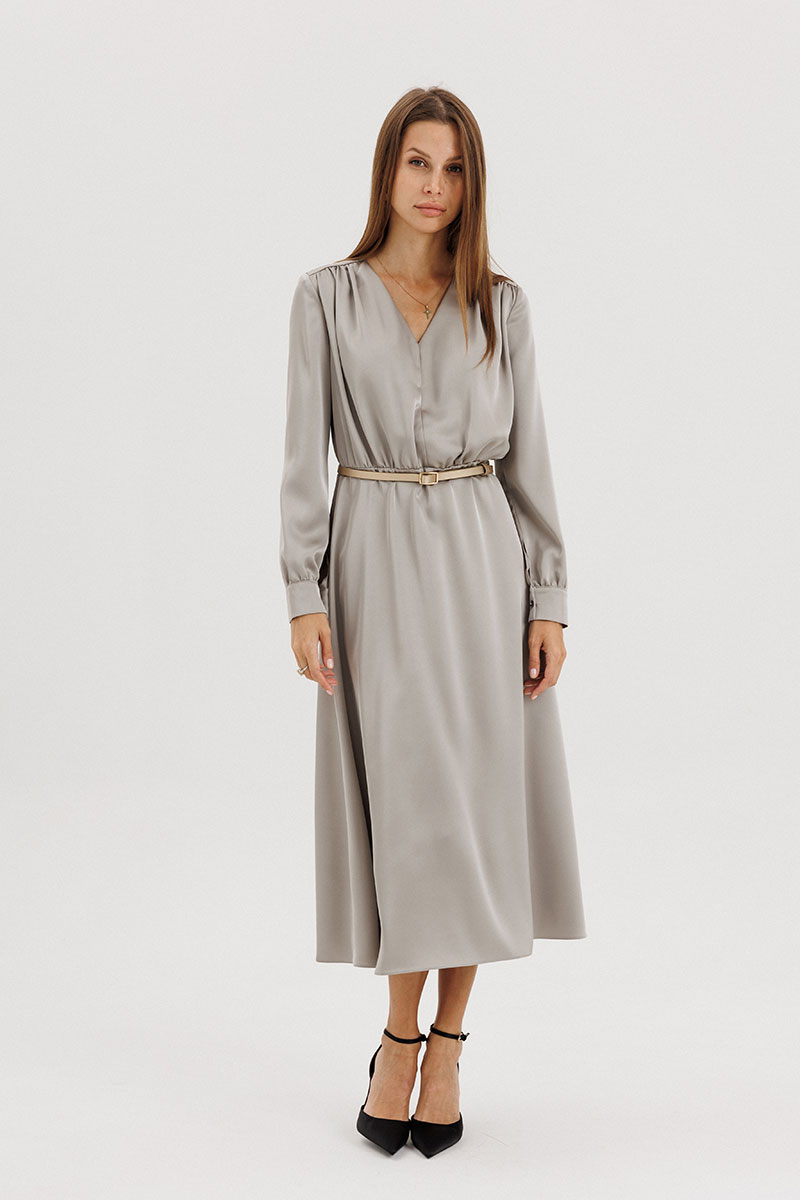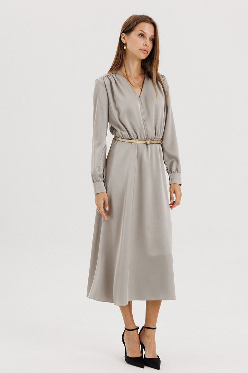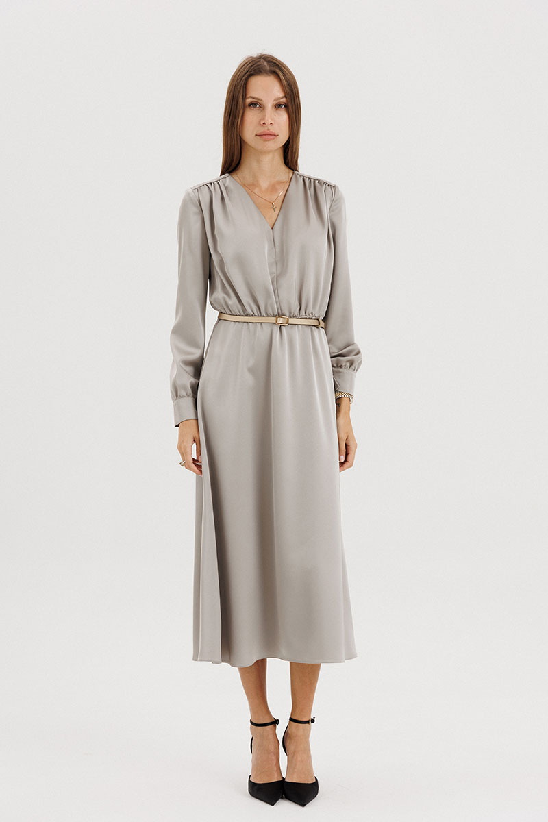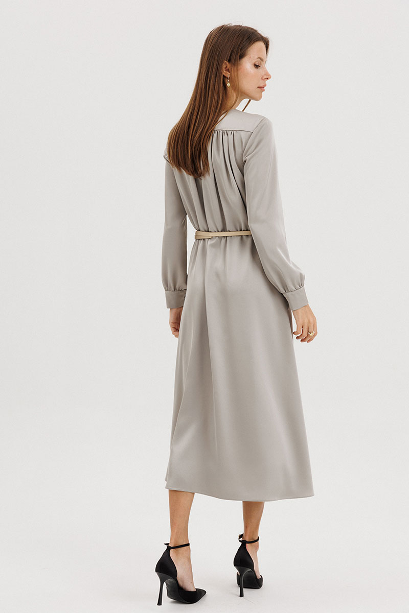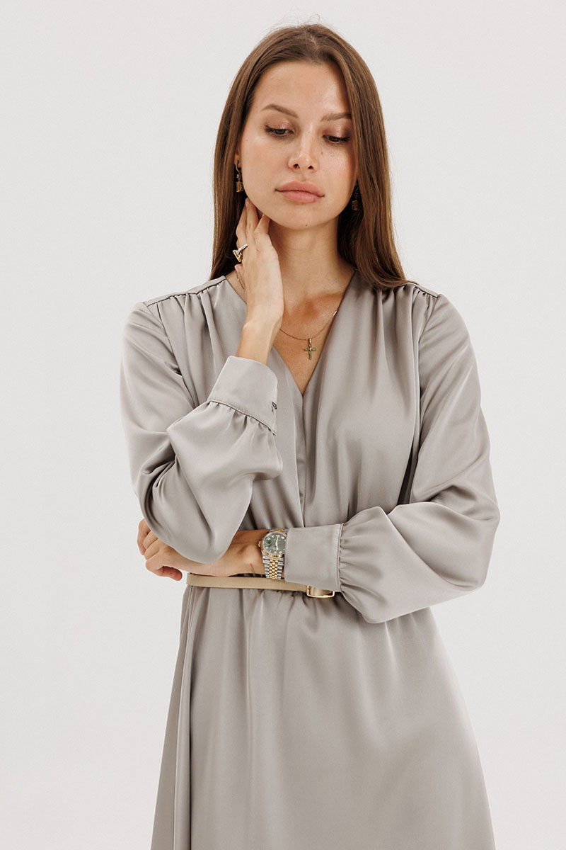 Платье из вискозного атласа, в комплекте с декоративным поясом. Платье А-силуэта, отрезное по талии, юбка расширенная к низу со сборкой, платье на резинке, кокетка отрезная, со сборкой по полочке и спинке, горловина V-образная, рукав втачной с манжетой и застежкой на пуговицу. Идет в комплекте с поясом. Платье на трикотажной подкладке по низу. Рост модели на фото 178 см.