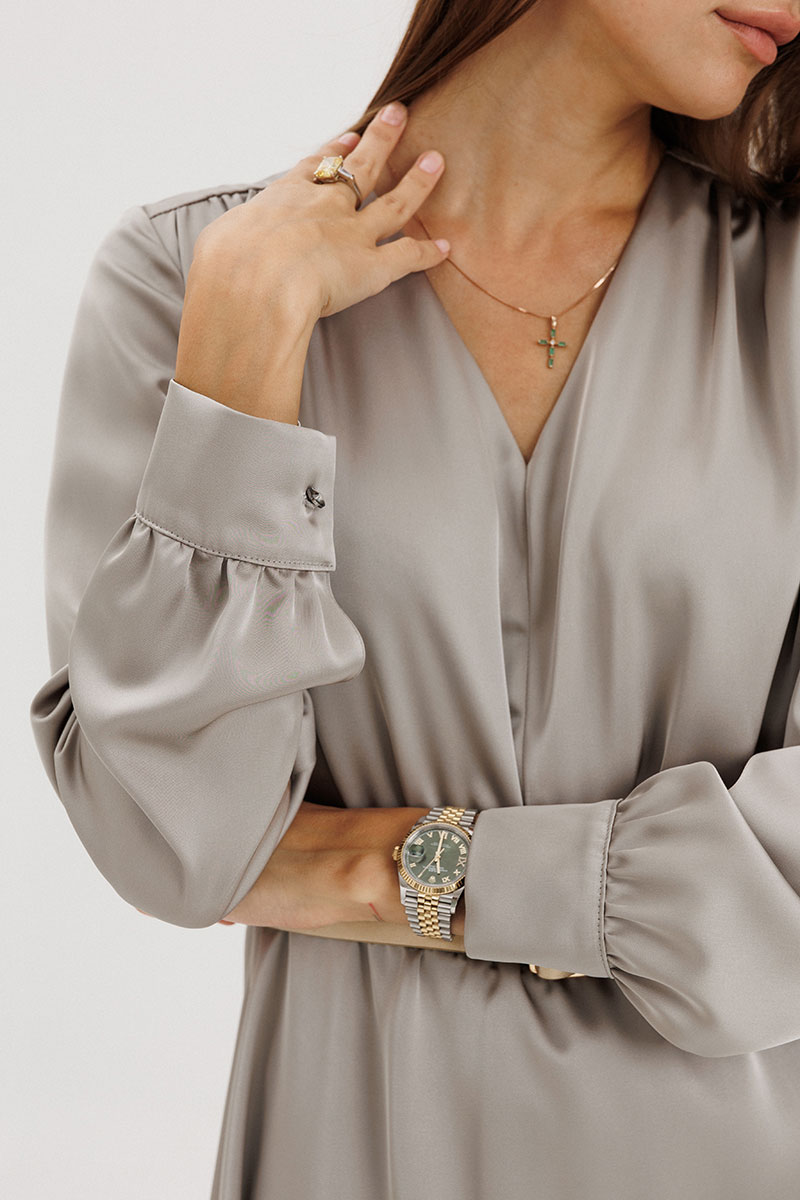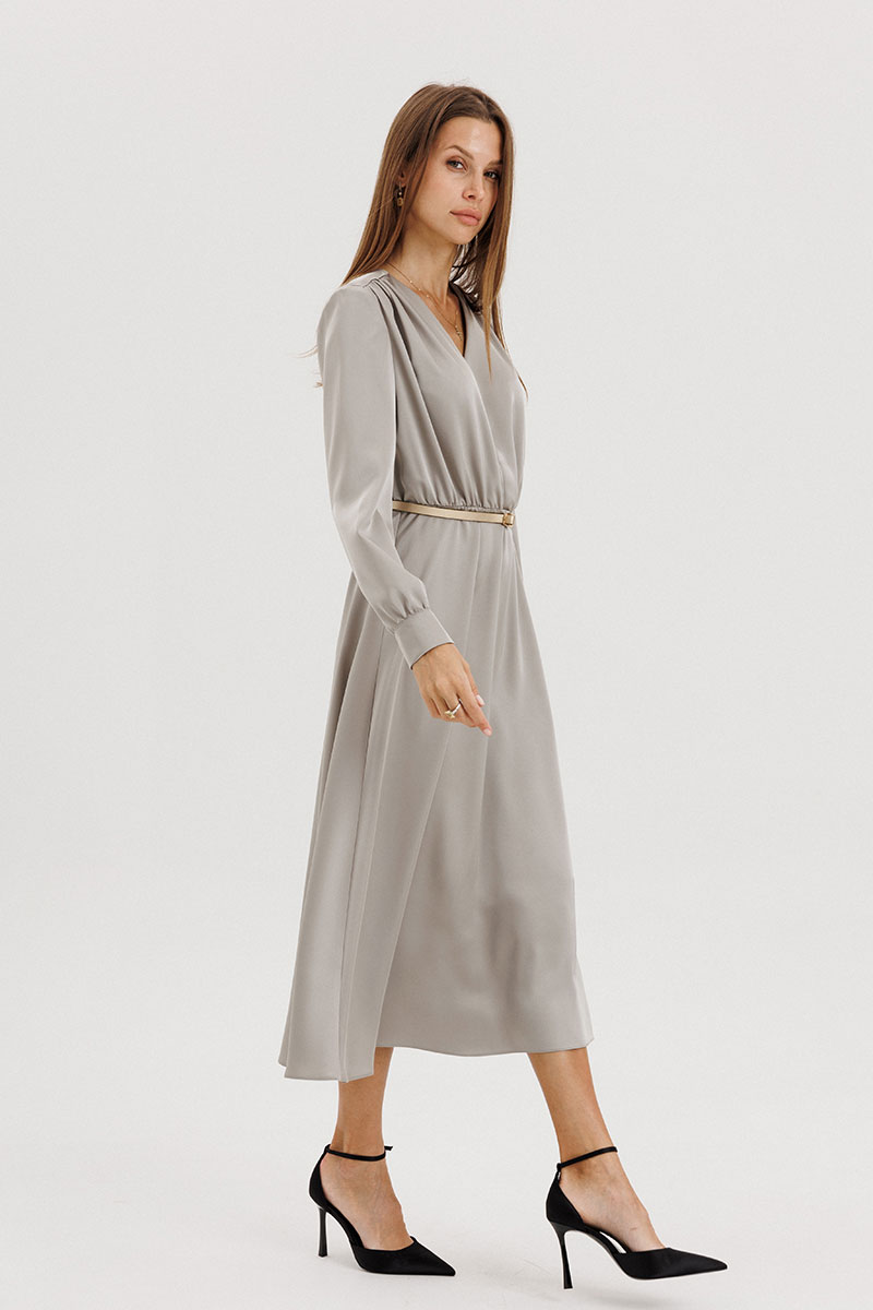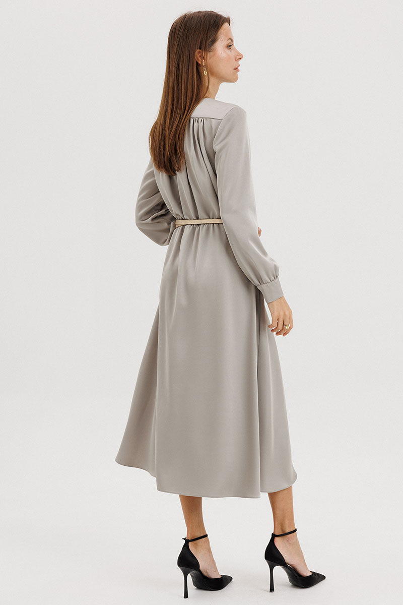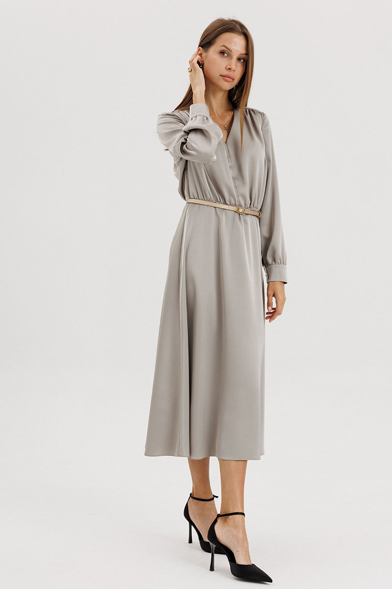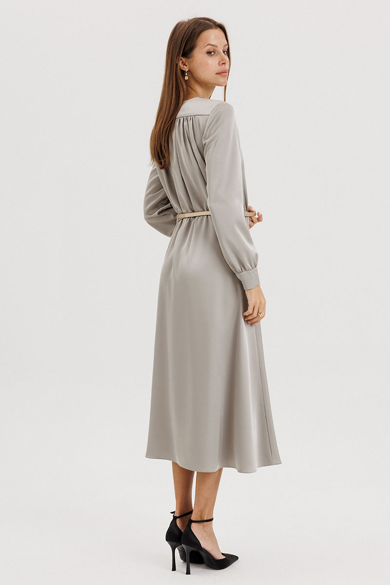 Платье из вискозного атласа, в комплекте с декоративным поясом. Платье А-силуэта, отрезное по талии, юбка расширенная к низу со сборкой, платье на резинке, кокетка отрезная, со сборкой по полочке и спинке, горловина V-образная, рукав втачной с манжетой и застежкой на пуговицу. Идет в комплекте с поясом. Платье на трикотажной подкладке по низу. Рост модели на фото 178 см.