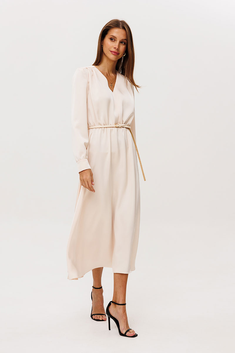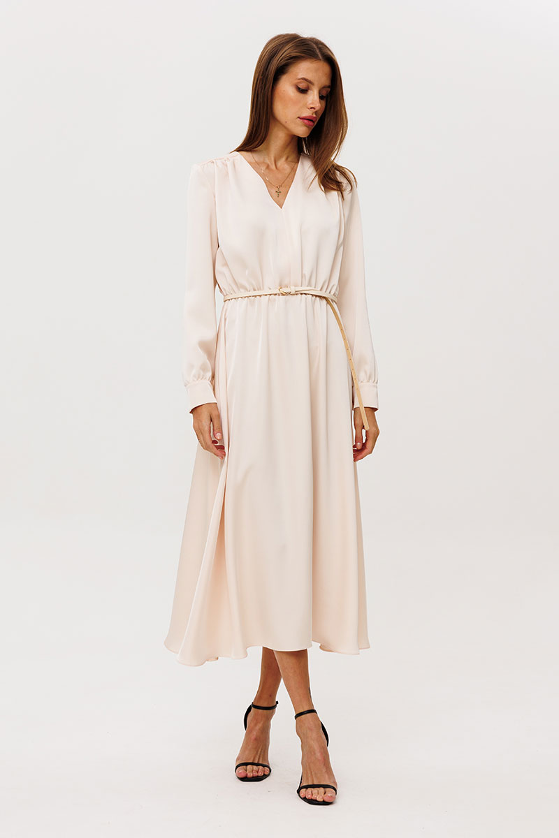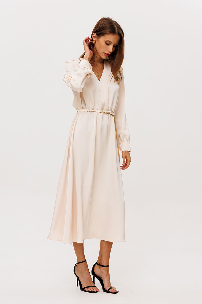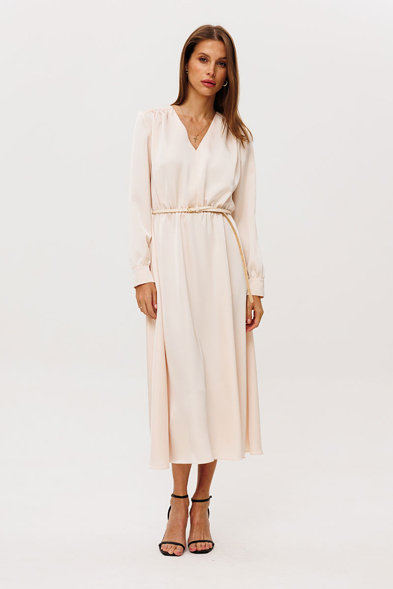 Платье из вискозного атласа, в комплекте с декоративным поясом. Платье А-силуэта, отрезное по талии, юбка расширенная к низу со сборкой, платье на резинке, кокетка отрезная, со сборкой по полочке и спинке, горловина V-образная, рукав втачной с манжетой и застежкой на пуговицу. Идет в комплекте с поясом. Платье на трикотажной подкладке по низу.
