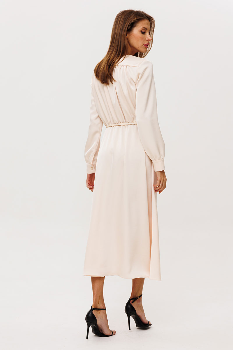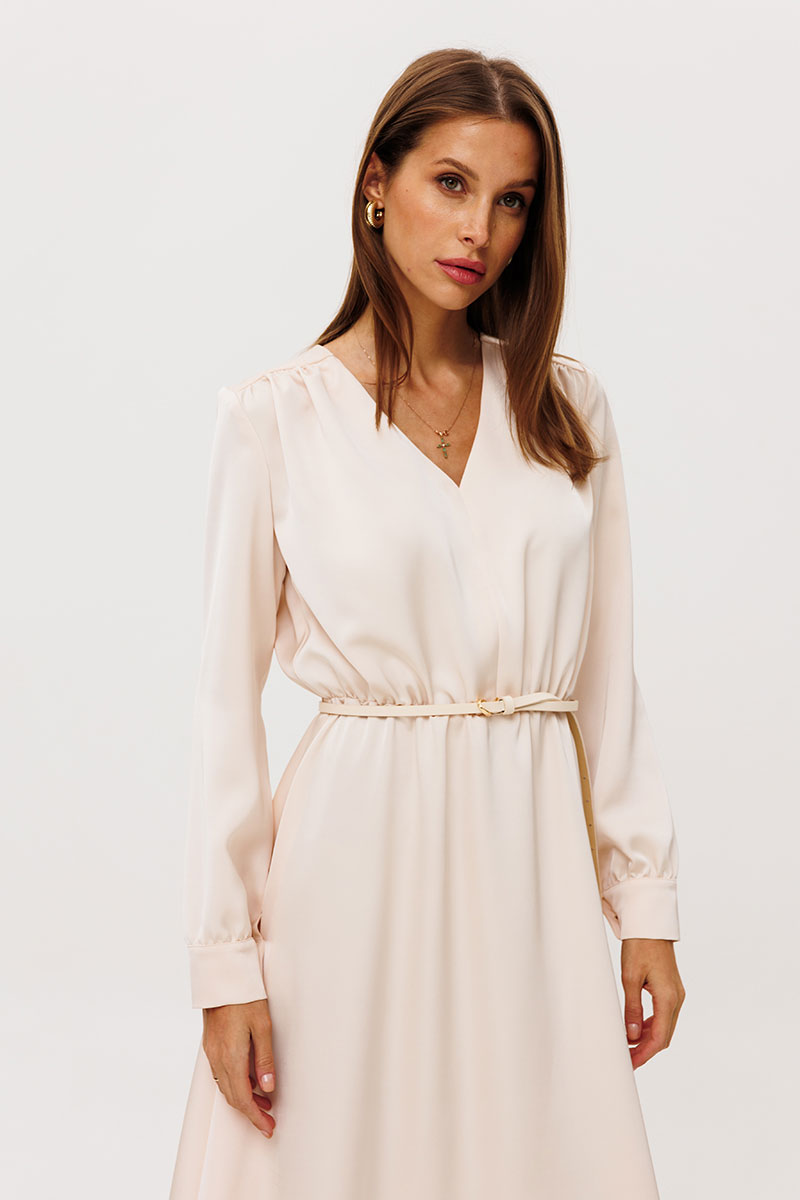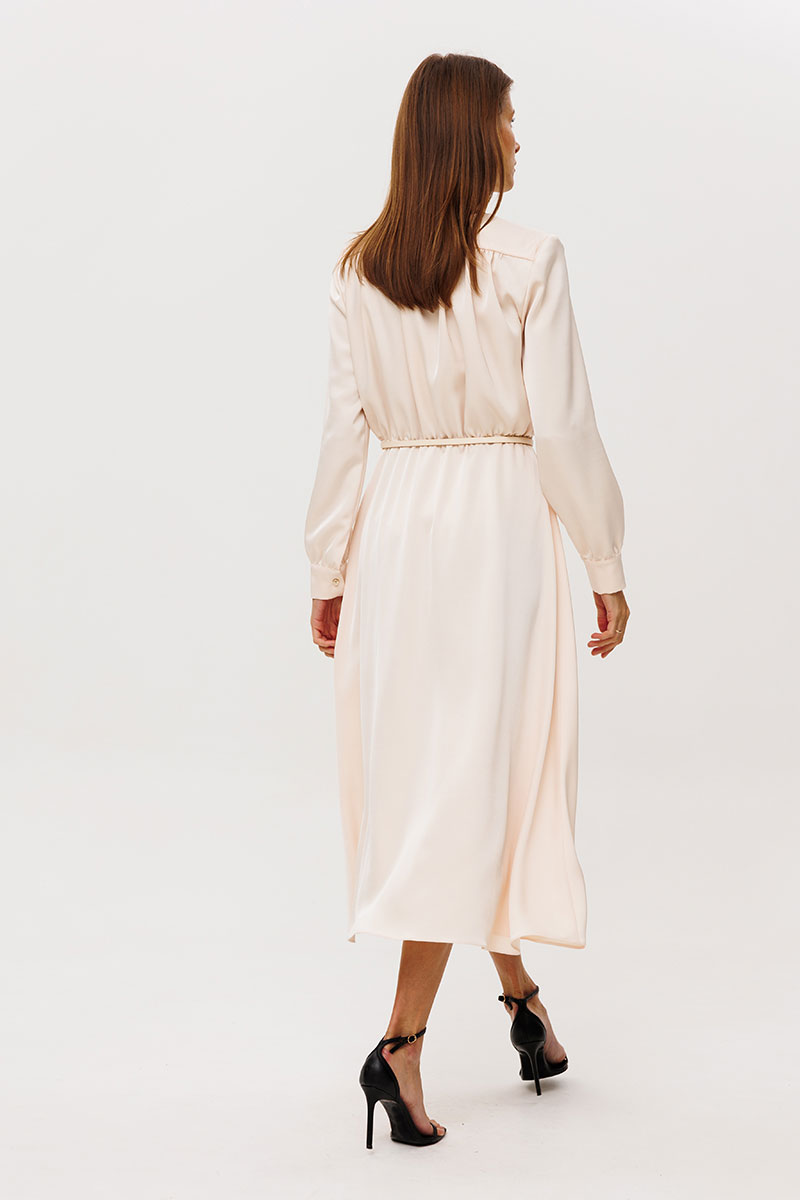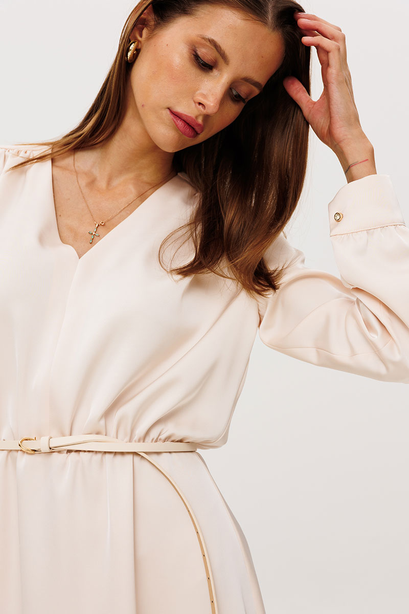 Платье из вискозного атласа, в комплекте с декоративным поясом. Платье А-силуэта, отрезное по талии, юбка расширенная к низу со сборкой, платье на резинке, кокетка отрезная, со сборкой по полочке и спинке, горловина V-образная, рукав втачной с манжетой и застежкой на пуговицу. Идет в комплекте с поясом. Платье на трикотажной подкладке по низу.