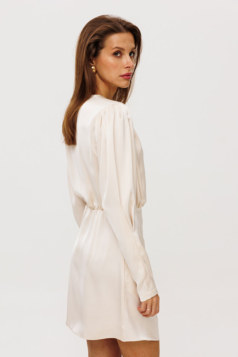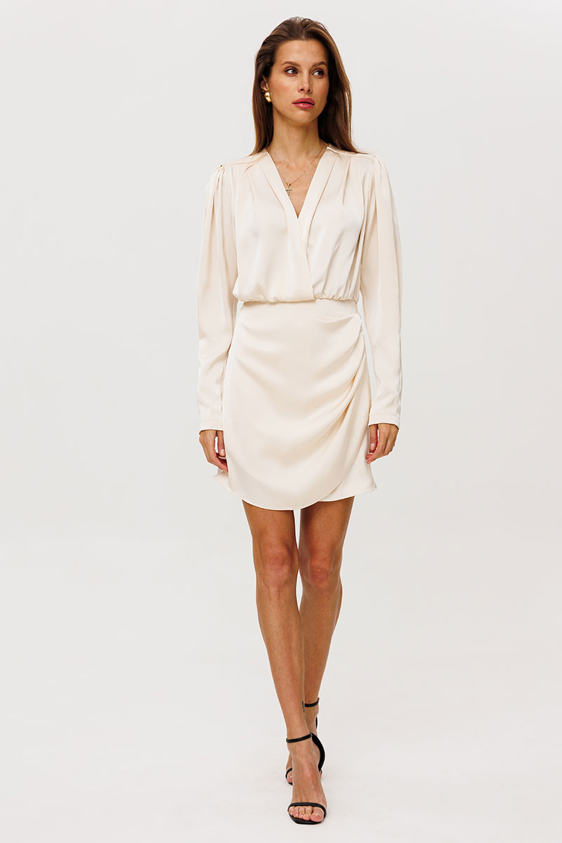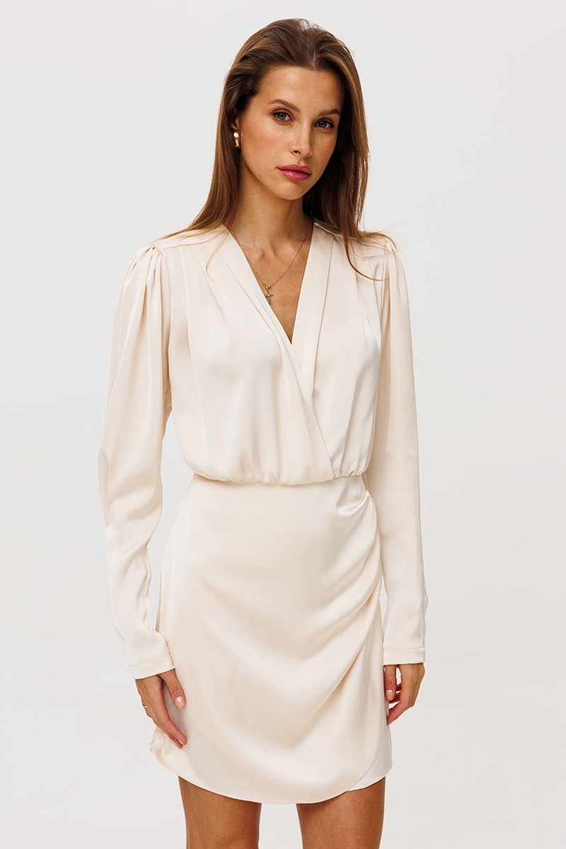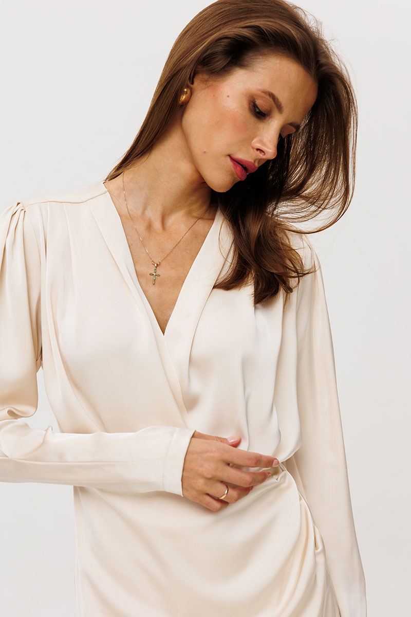Платье на запах из вискозной атласной ткани свободного силуэта ,молния в боковом шве, талия отрезная, на резинке, драпировка по переду, без подкладки. Рукав втачной с драпировкой по окату , зауженный к низу.