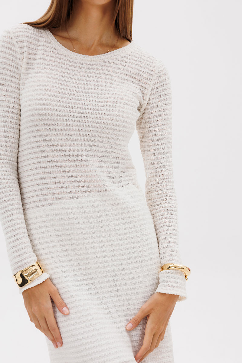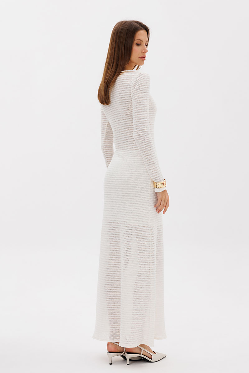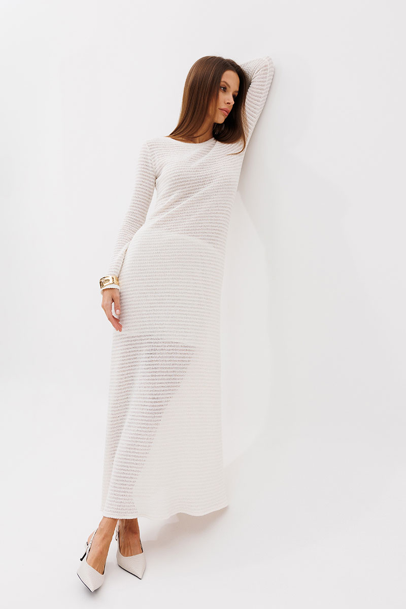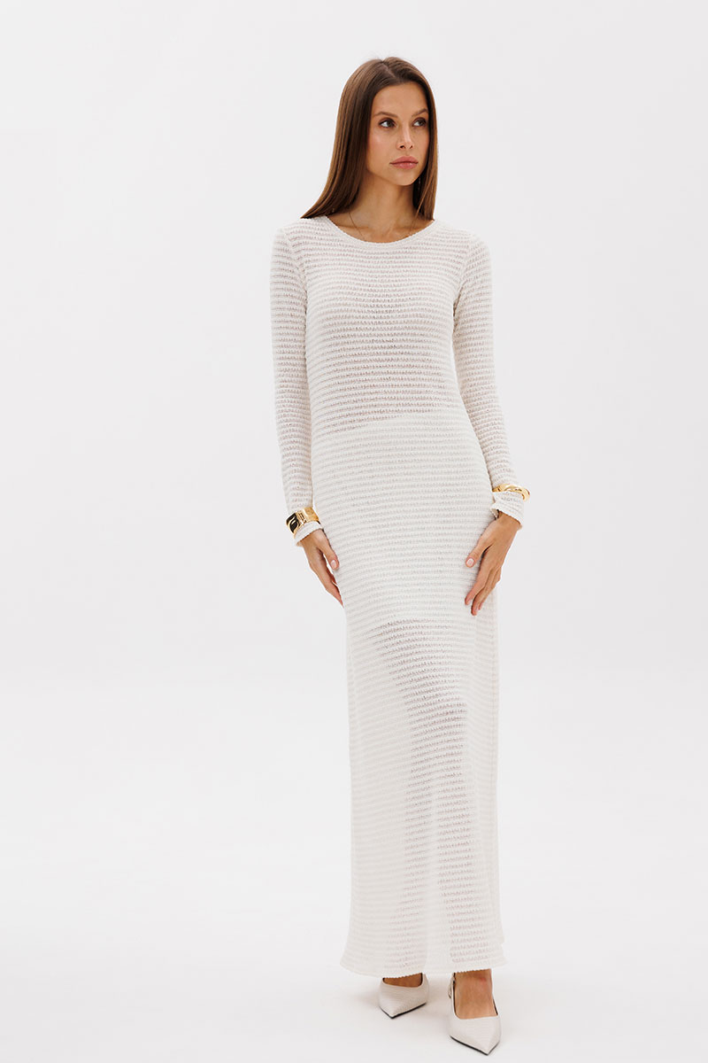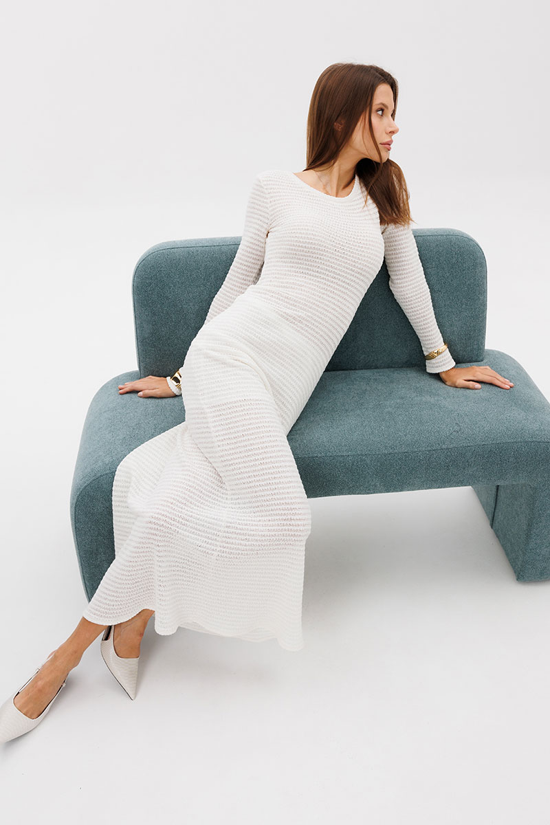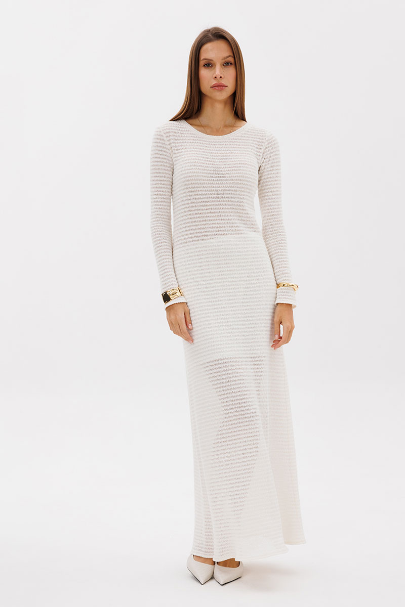 Платье макси выполнено из мягкого кружевного трикотажа премиум-качества в молочном цвете. Рукав втачной, платье прилегающего силуэта. В комплекте идет юбка на резинке. Данное платье можно сочетать с любой обувью, босоножки, сапоги, кеды, модель актуальна на любой сезон, в нем вы будете себя ощущать комфортно и стильно.