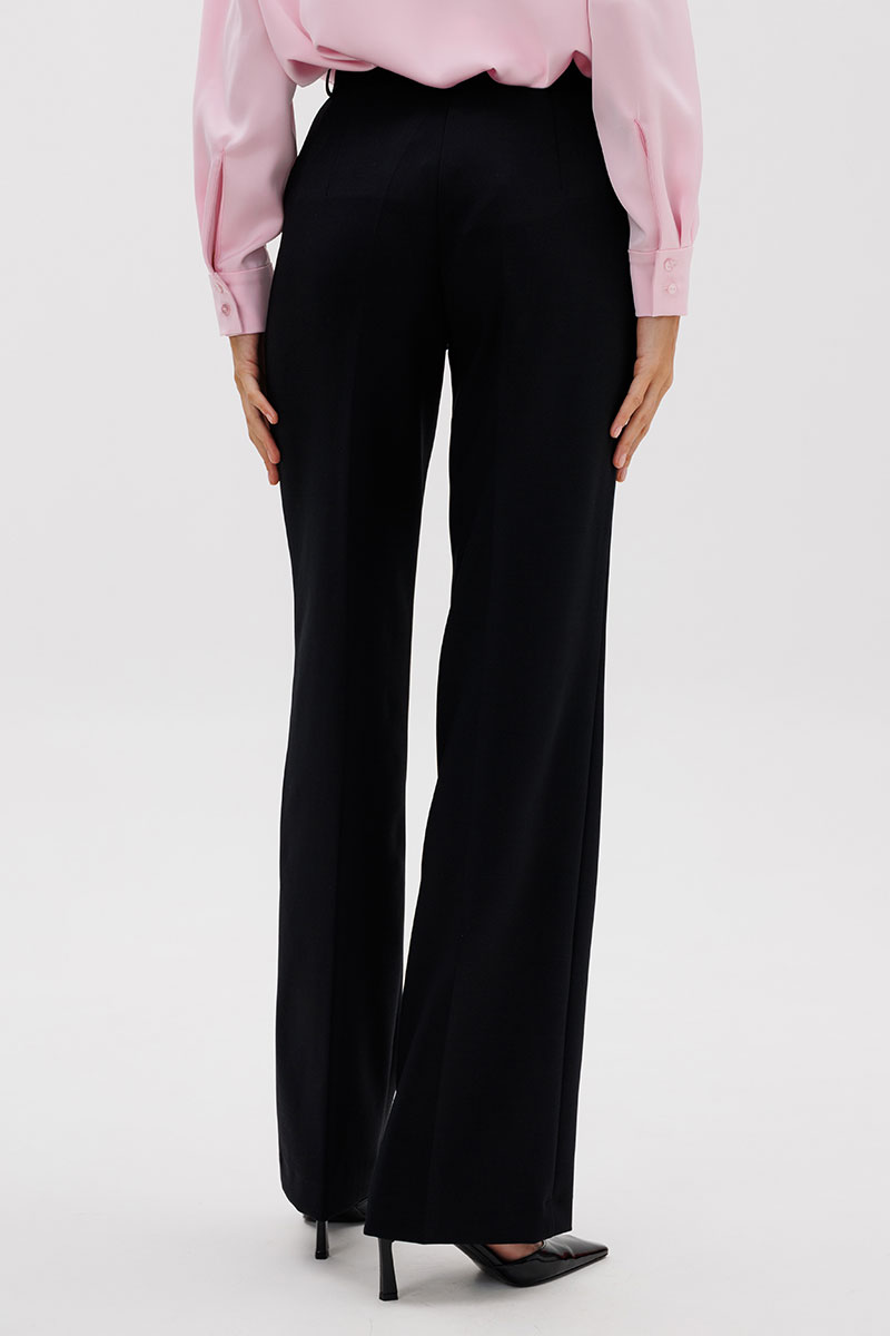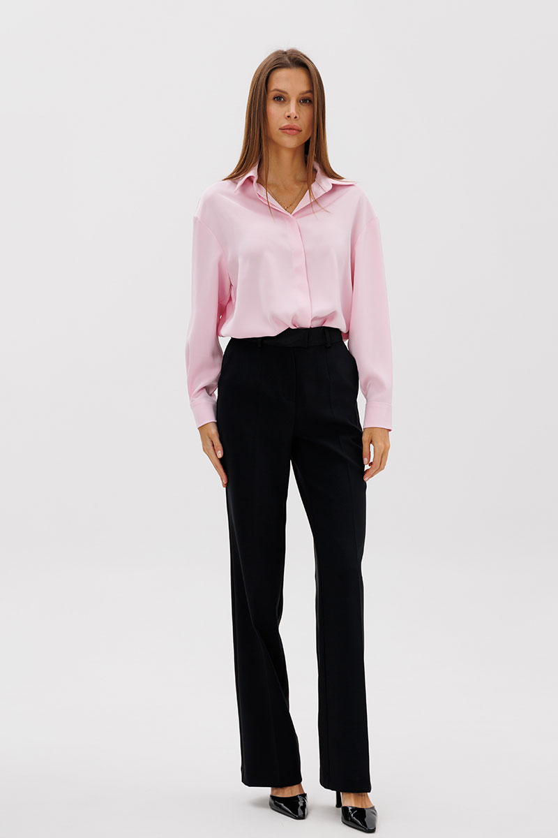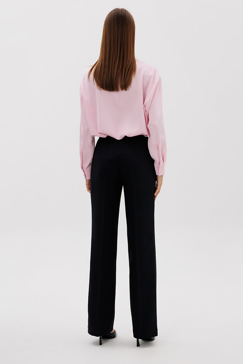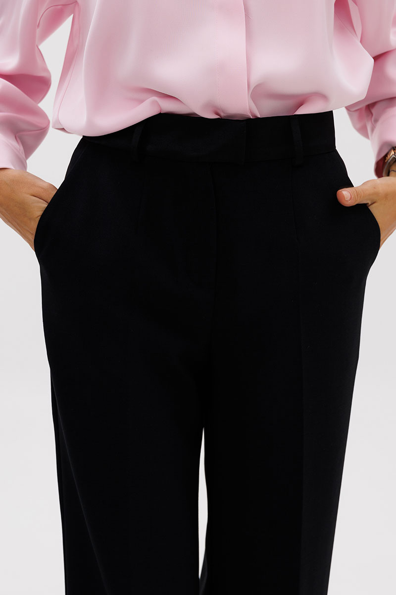 Стильные женские брюки прямого кроя. Пояс притачной, выполнен из плотной матовой, атласной ткани, брюк со шлевками. Застегиваются на молнию и потайной крючок. Карманы - боковые наклонные.