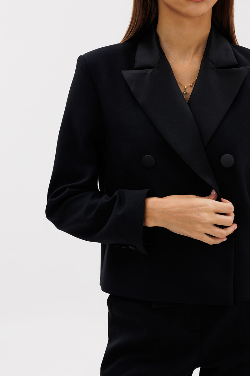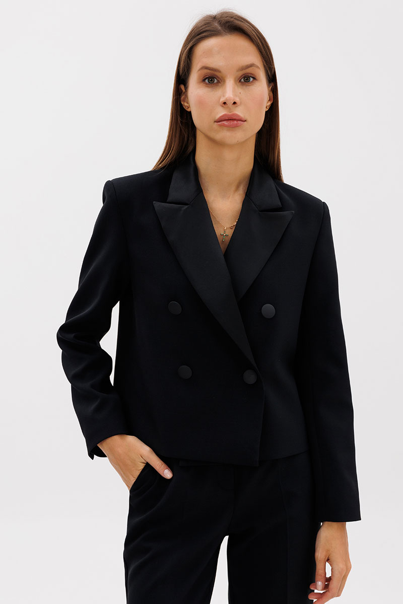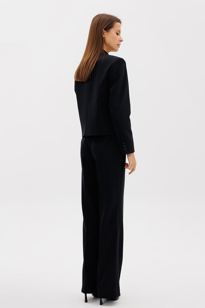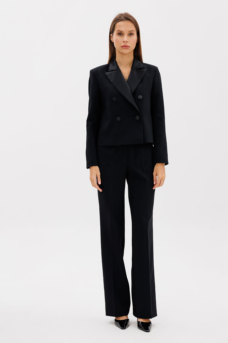 Костюм смотрится очень изысканно и дорого, в нем вас заметят на любом мероприятии. Двубортный жакет, прямого силуэта, на подкладке из вискозы, шлицы на рукавах с декоративными пуговицами, рукав втачной, выполнен из премиальной ткани костюмной группы. Лацканы и воротник жакета выполнены из матового платного атласа черного цвета. Застежка на петли-пуговицы.