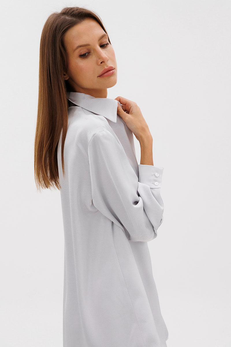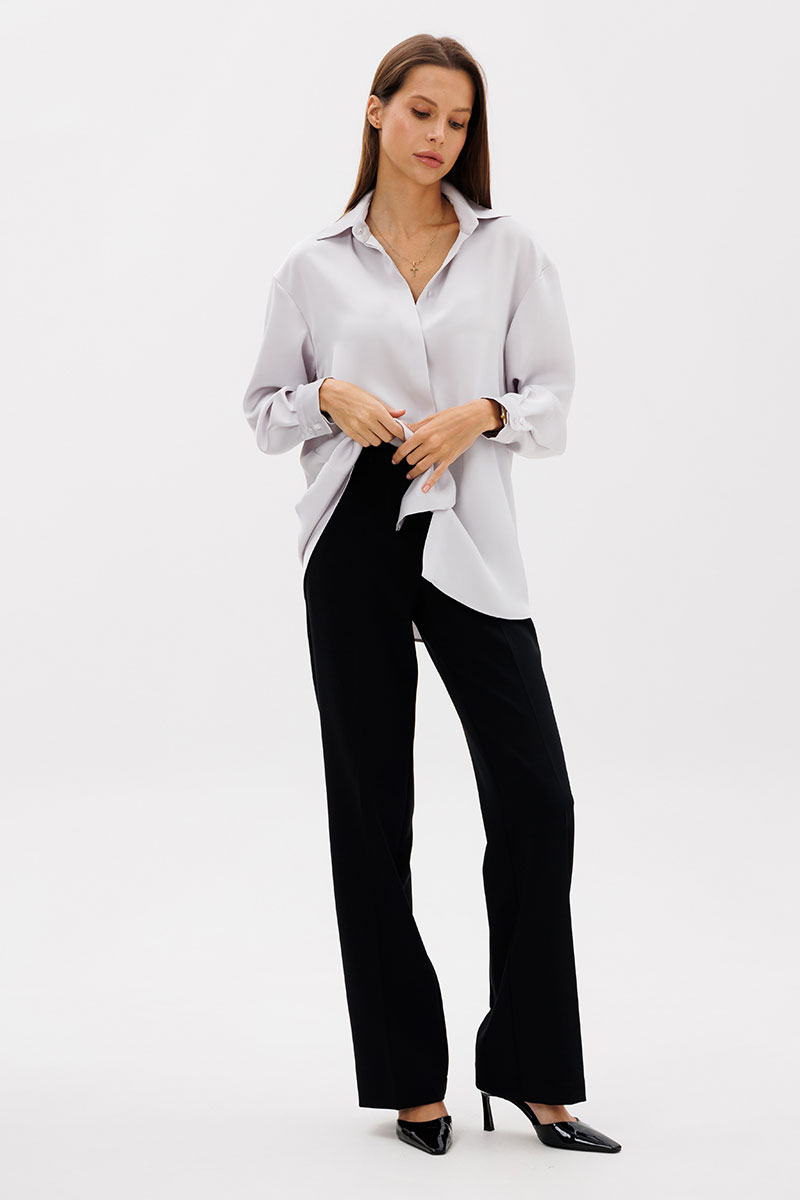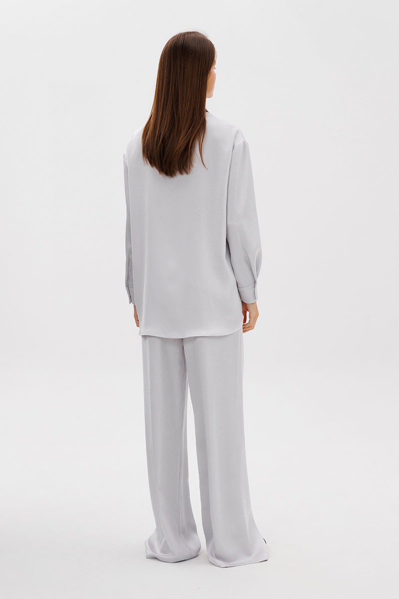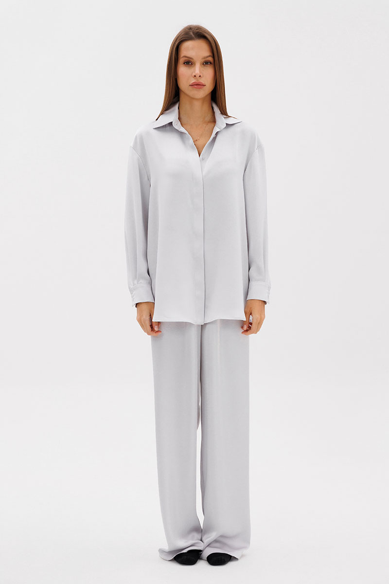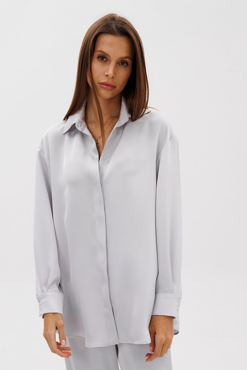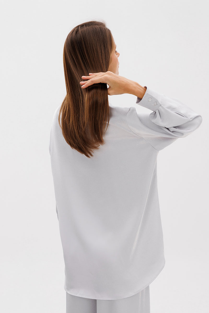 Роскошная блуза из атласной ткани в голубом цвете. Рубашка свободного кроя с заниженной линией плеча. Изделия из атласной ткани - это всегда про изысканность и роскошь, вариантов, как сочетать рубашку - масса. Это могут быть классические черные брюки, белые брюки или джинсы, кружевные брюки или юбка, и всегда вы будете выглядеть неотразимо и дорого. Рукав рубашечный, длинный с притачной манжетой. Застёжка центральная на петли - пуговицы. Можно сочетать с брюками арт. 2295 из нашей коллекции. Низ блузки фигурной формы. Воротник стояче-отложной с отрезной стойкой.