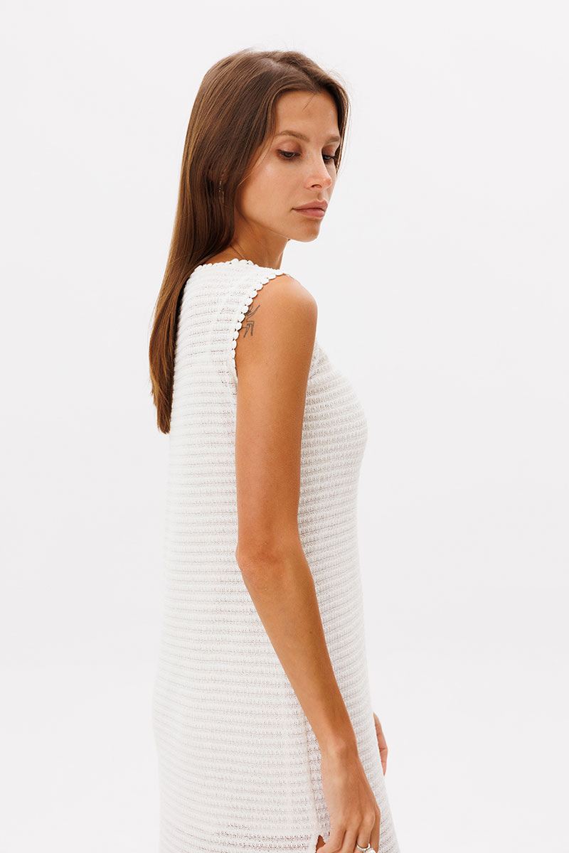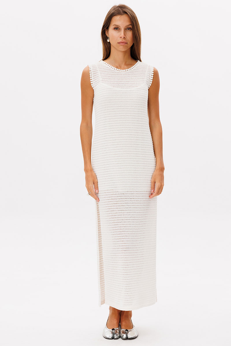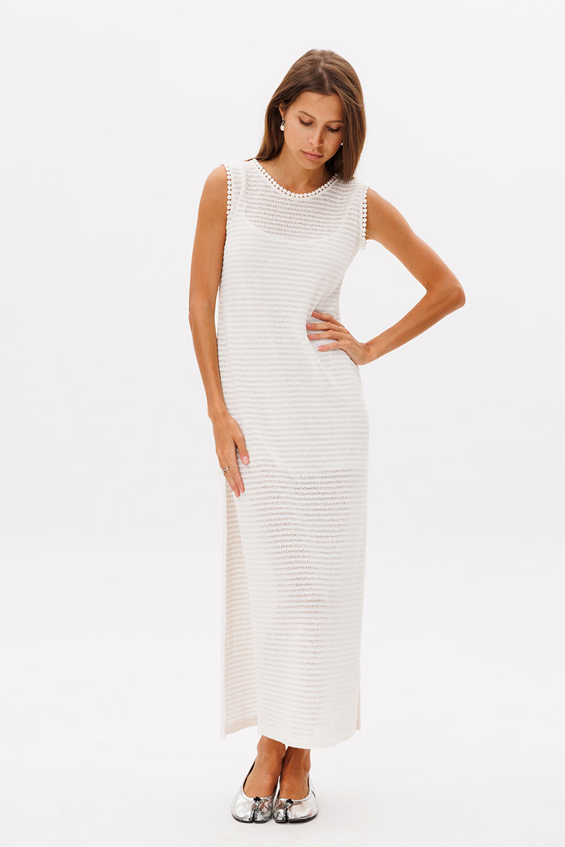 Лаконичное базовое трикотажное платье в молочном цвете, платье состоит из двух изделий в комплекте с комбинацией на бретелях. Платье прямого кроя, по горловине и рукавам отстрочено декоративной лентой, по бокам разрезы.