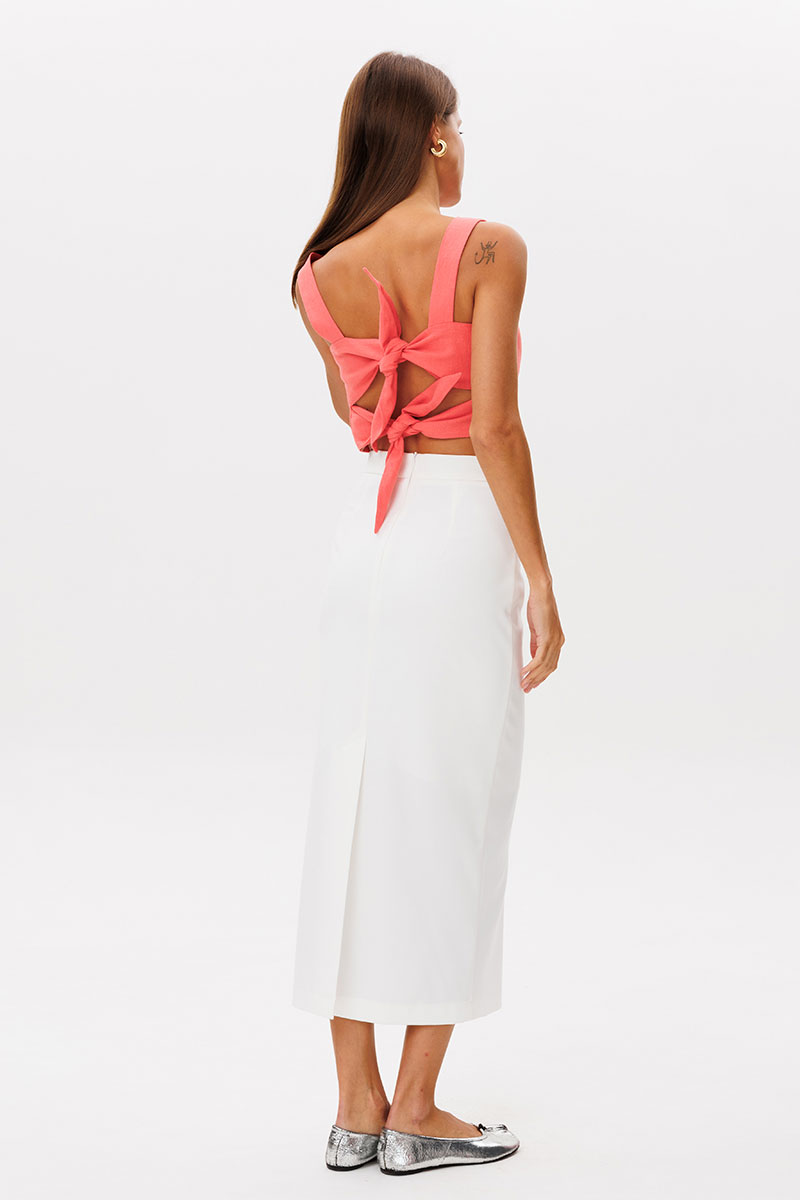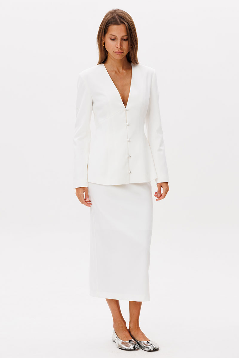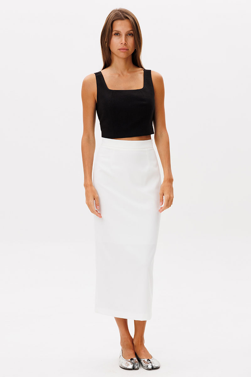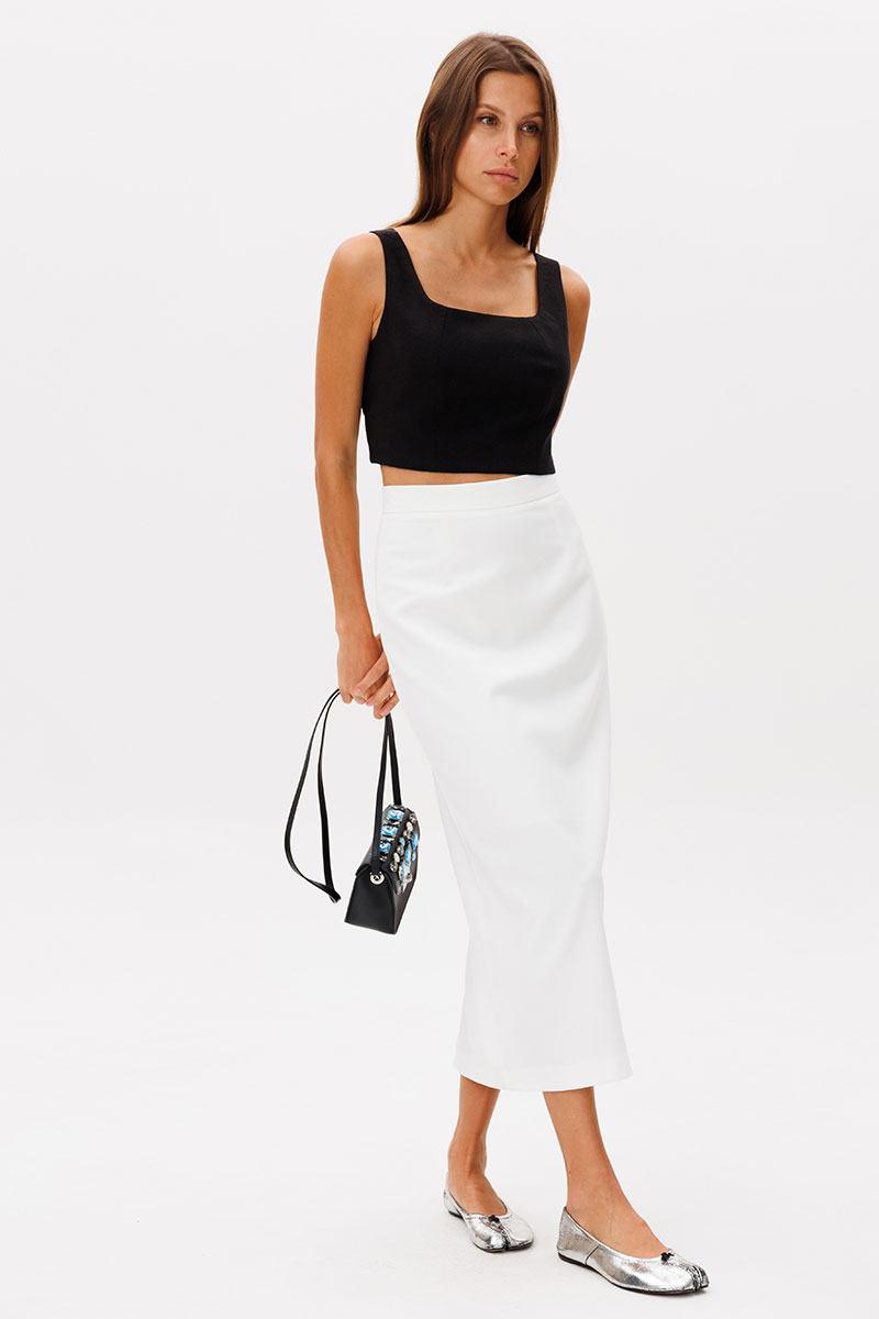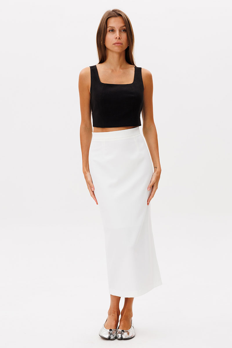 Юбка миди выполнена из молочной поливискозы, юбка на притачном поясе, посадка высокая , юбка на подкладке. В среднем шве застежка на потайную молнию, сзади разрез - высокая шлица. За счет кроя вытягивает фигуру, а образ делает элегантным.