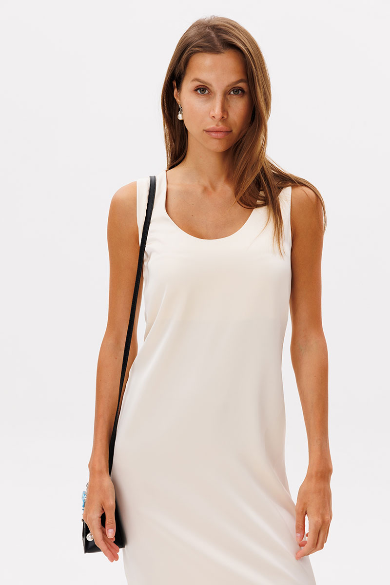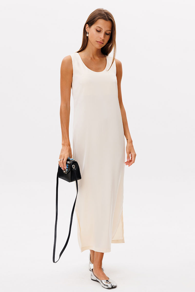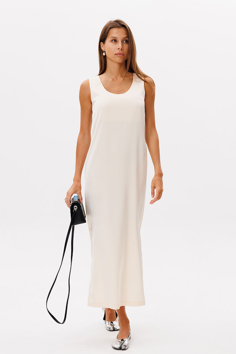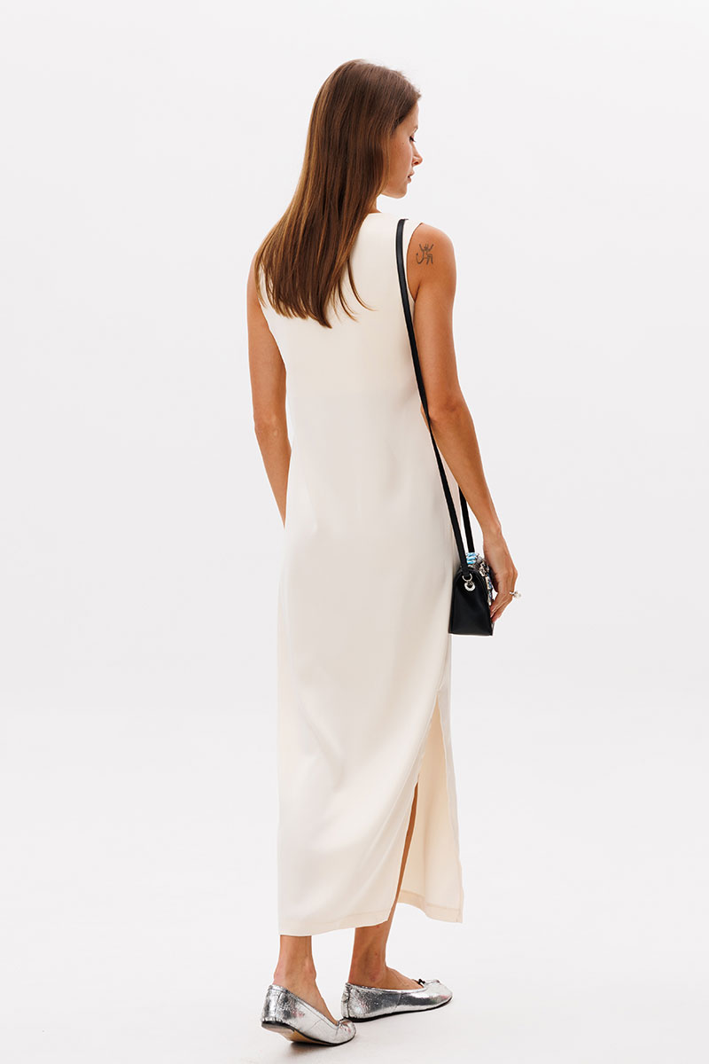 Изысканное атласное платье в невероятном сливочном цвете станет вашим любимым изделием в гардеробе! Платье прямого кроя, на обтачке, платье без подкладки, по бокам разрезы.
