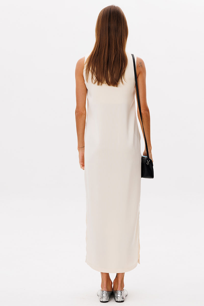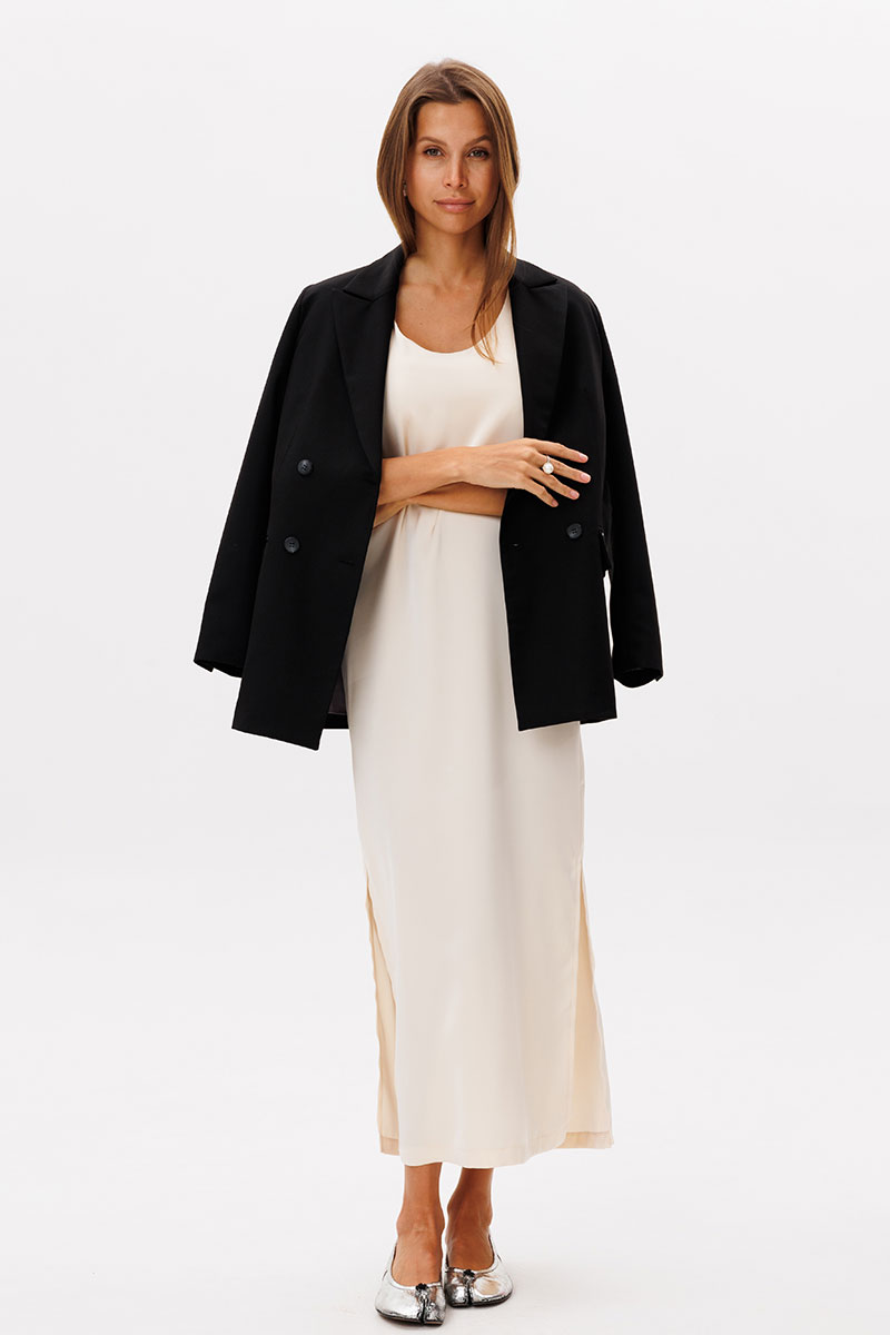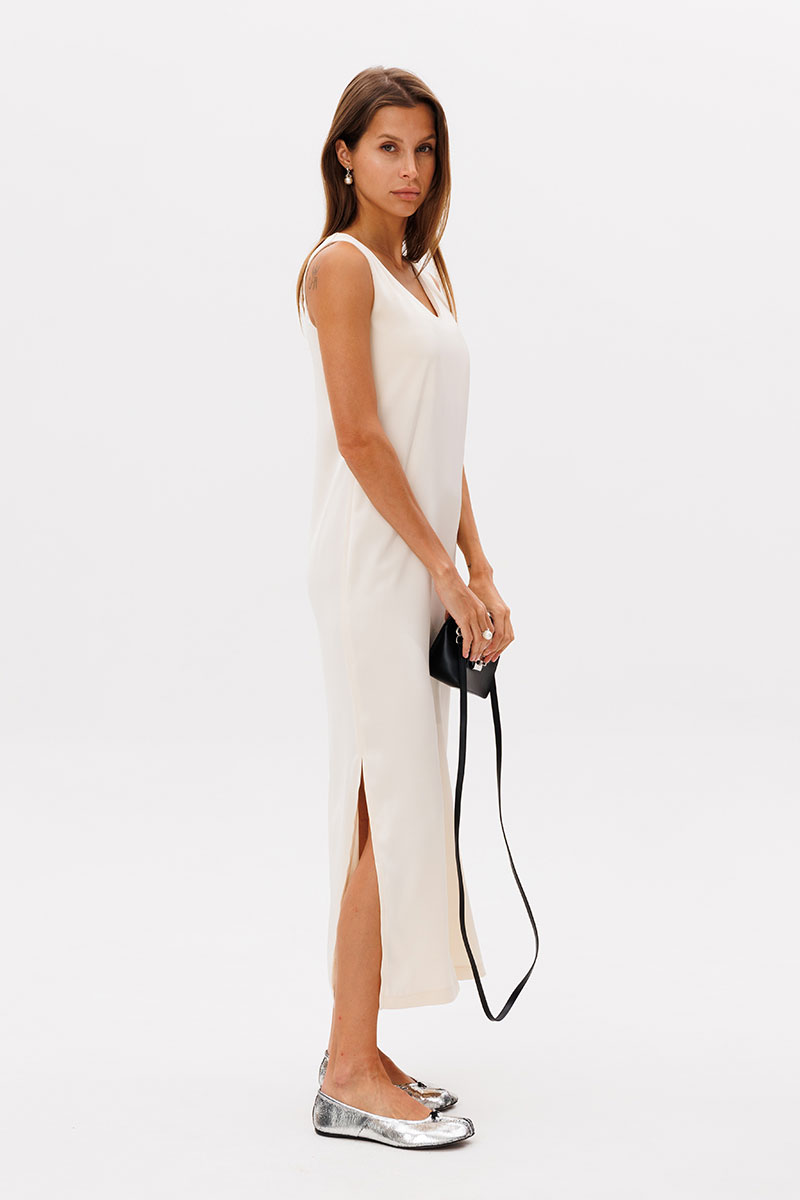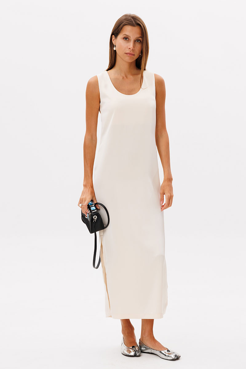 Изысканное атласное платье в невероятном сливочном цвете станет вашим любимым изделием в гардеробе! Платье прямого кроя, на обтачке, платье без подкладки, по бокам разрезы.