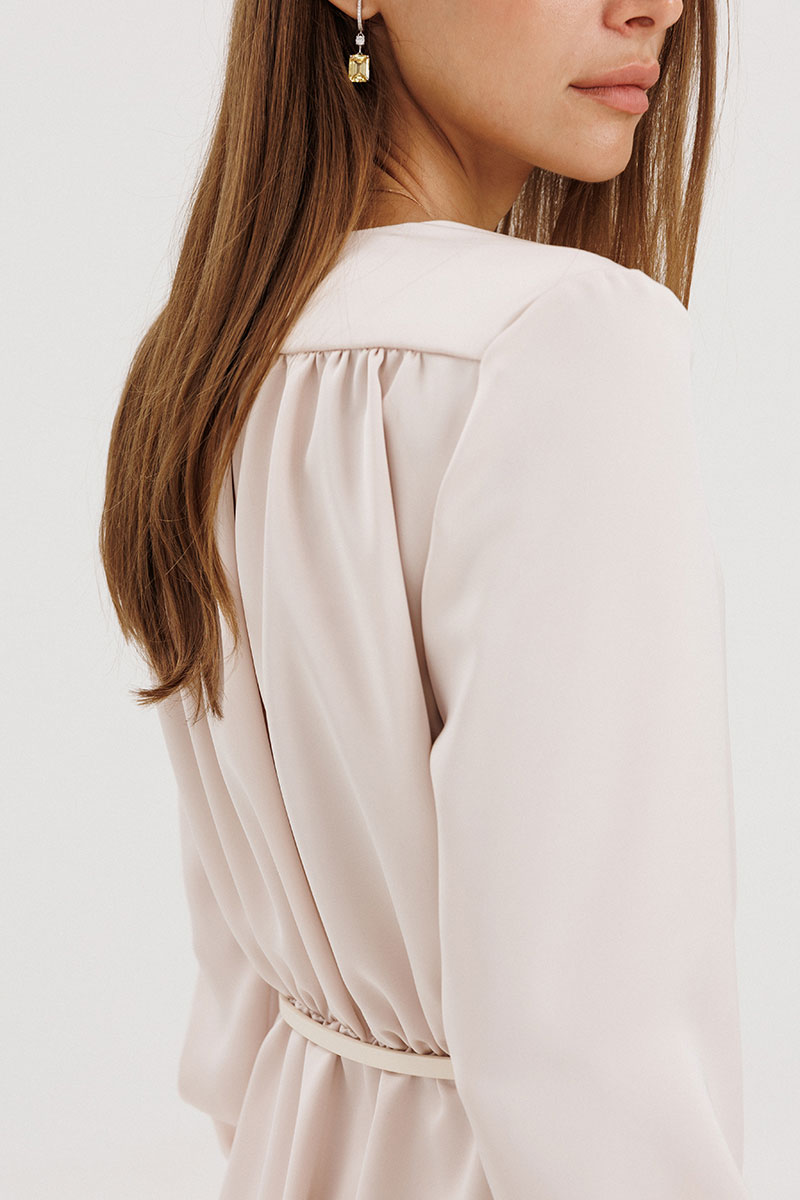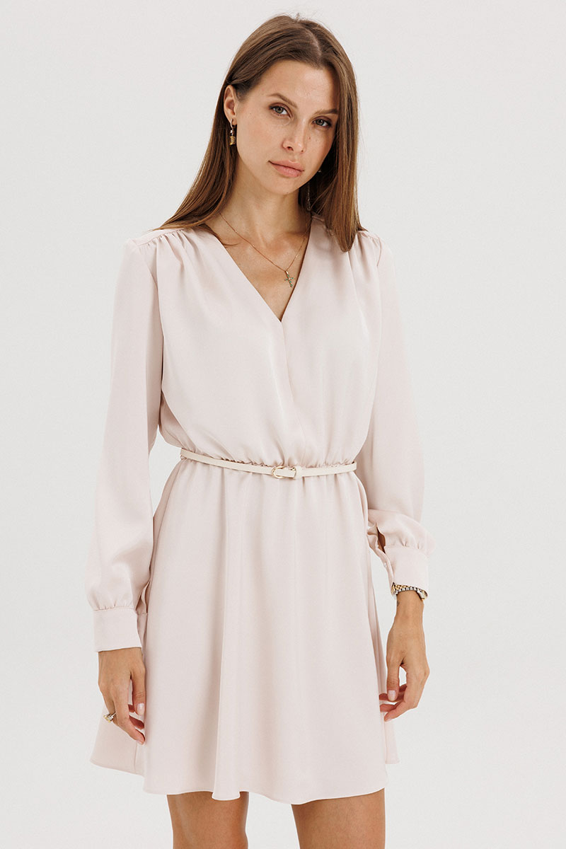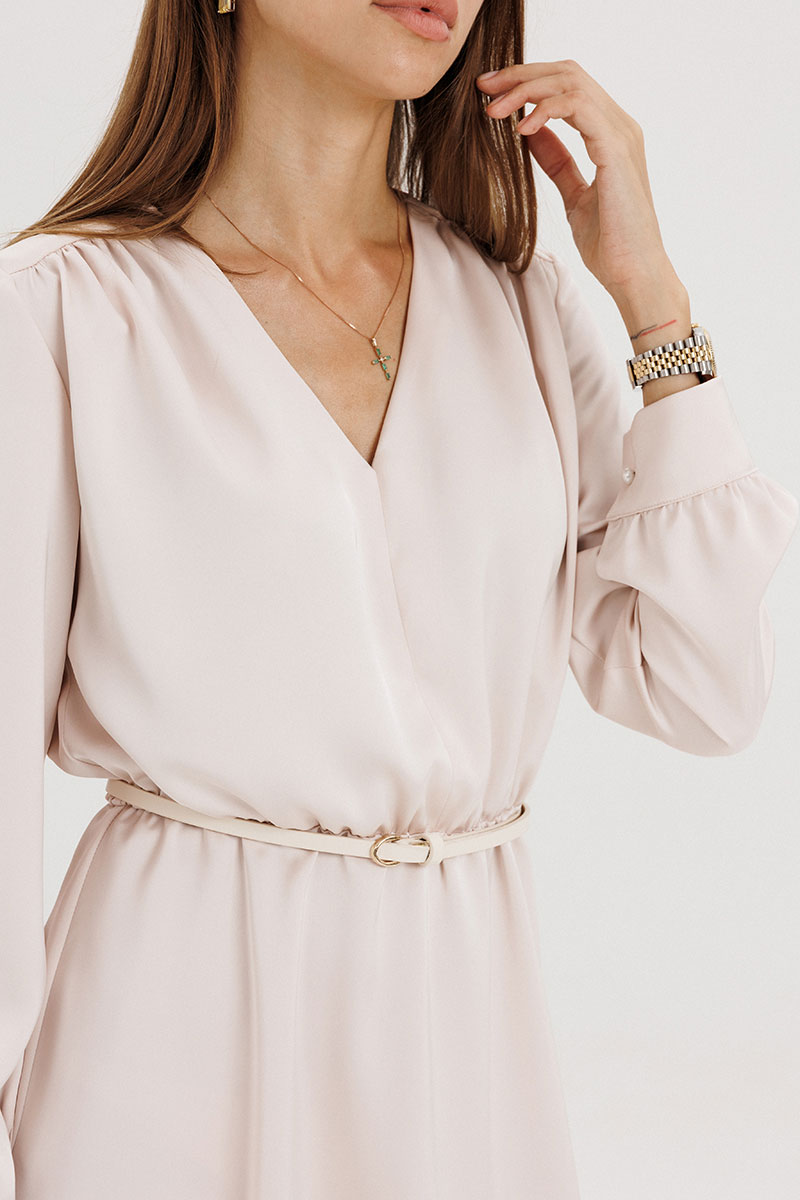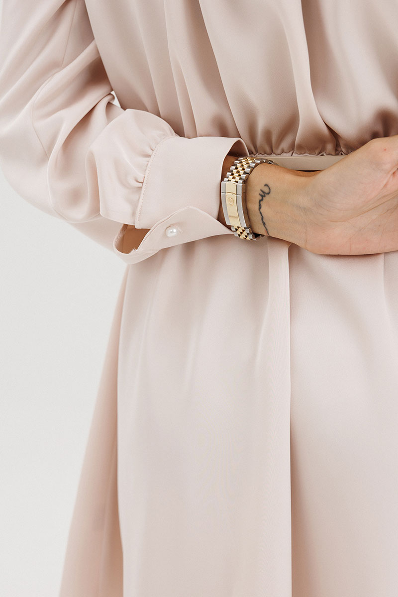 Платье из вискозного атласа, в комплекте с декоративным поясом . Платье А-силуэта, отрезное по талии, юбка расширенная к низу со сборкой, платье на резинке, кокетка отрезная, со сборкой по полочке и спинке , горловина V-образная, рукав втачной с манжетой и застежкой на пуговицу. Платье без подкладки. Рост модели на фото 178 см.