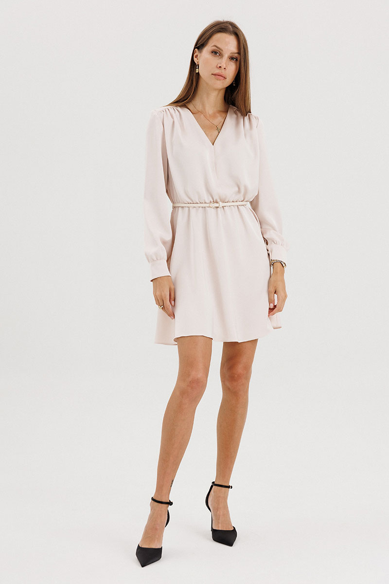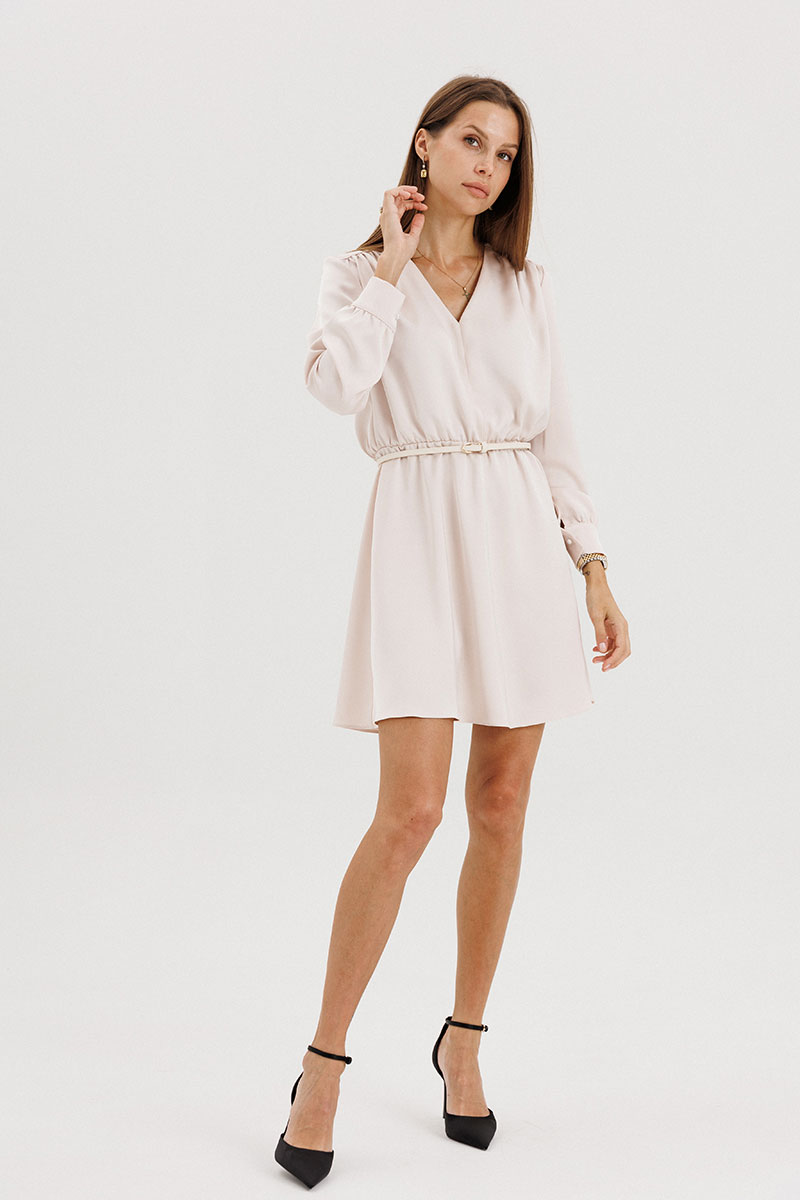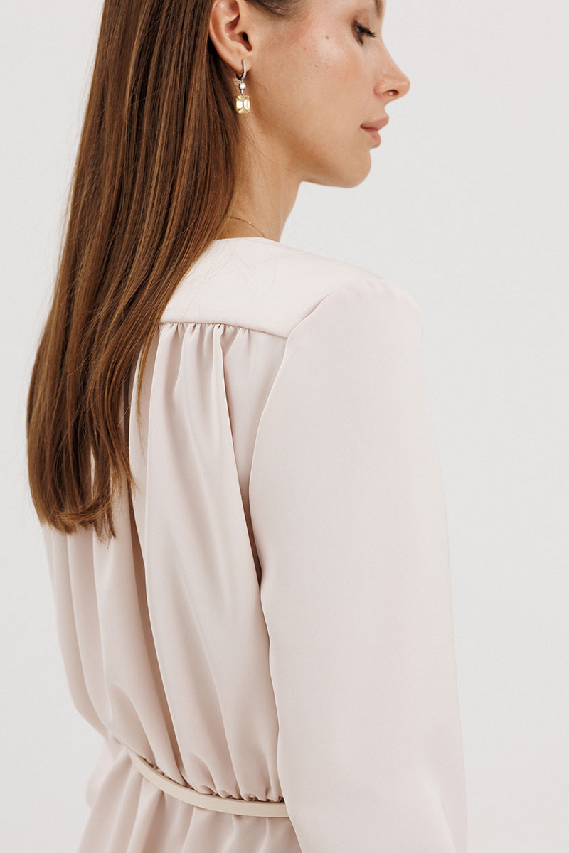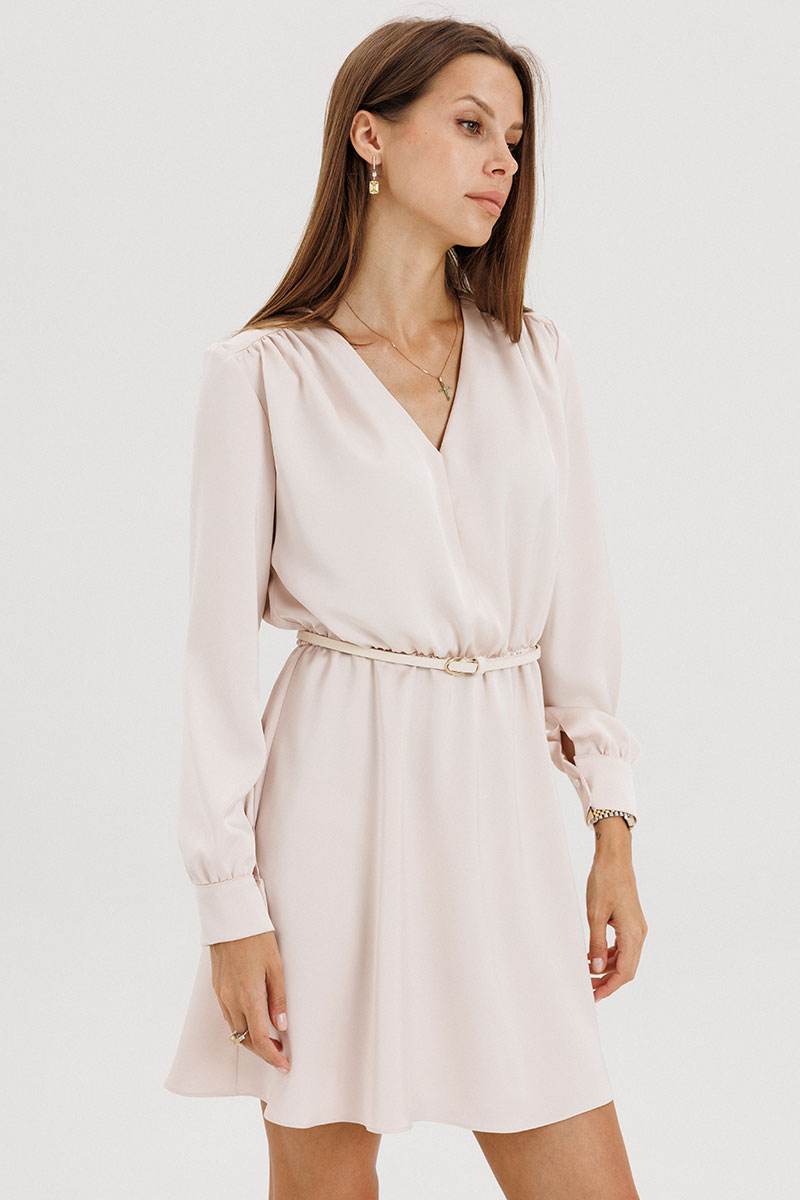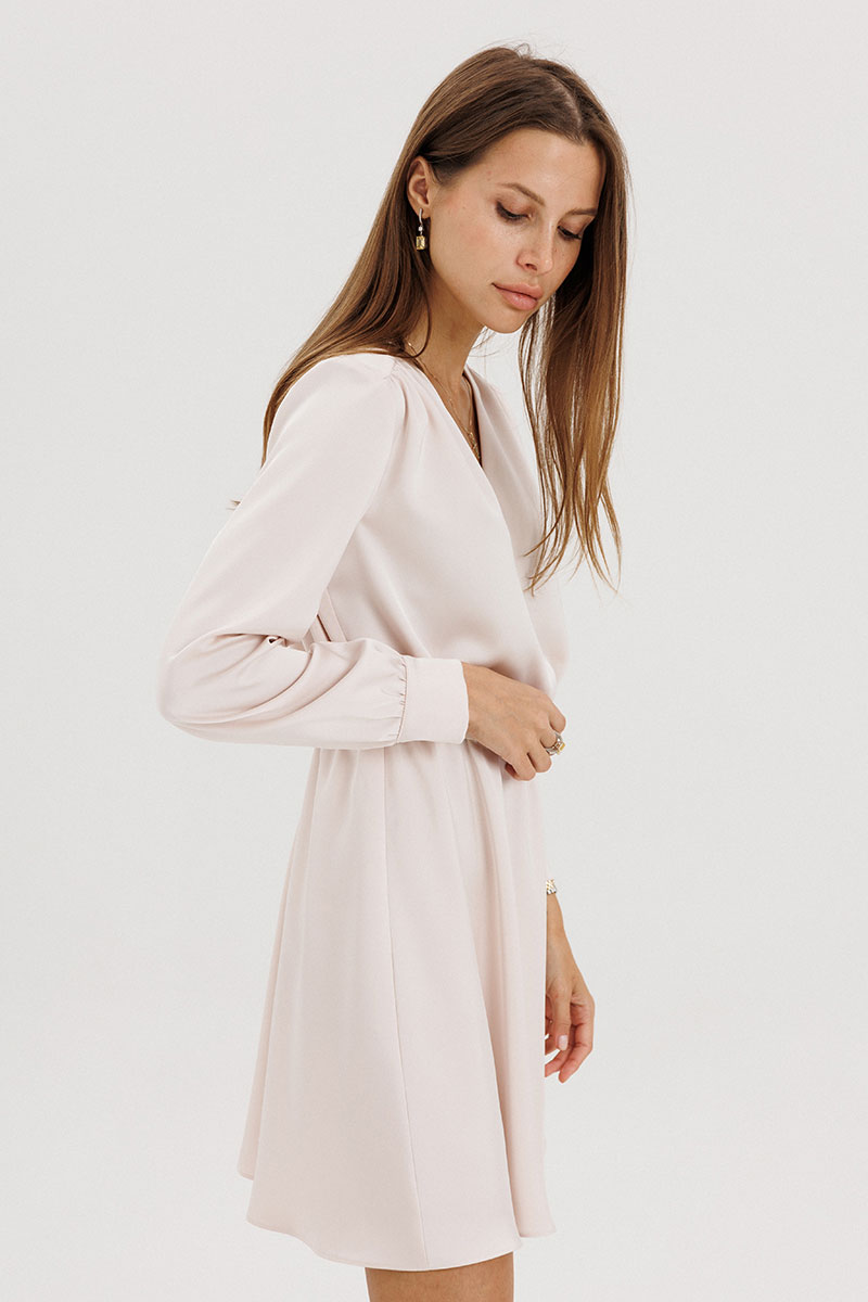 Платье из вискозного атласа, в комплекте с декоративным поясом . Платье А-силуэта, отрезное по талии, юбка расширенная к низу со сборкой, платье на резинке, кокетка отрезная, со сборкой по полочке и спинке , горловина V-образная, рукав втачной с манжетой и застежкой на пуговицу. Платье без подкладки. Рост модели на фото 178 см.