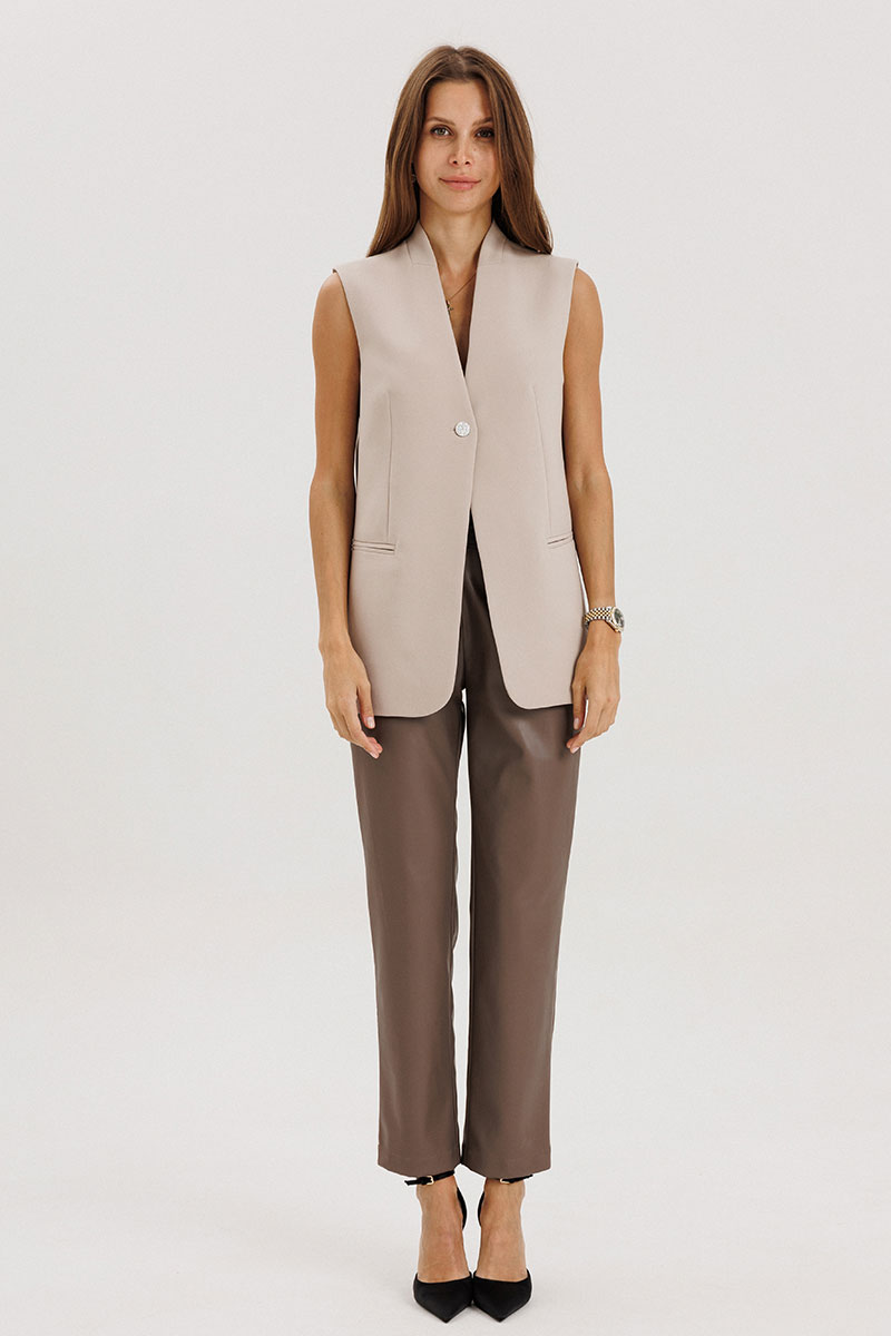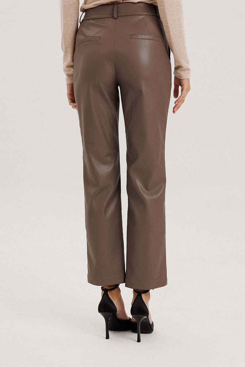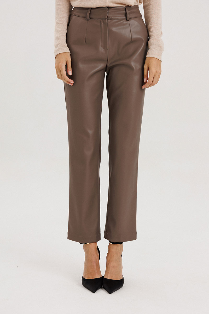 Брюки прямые, пояс притачной со шлевками, застежка на потайной крючок, по переду гульфик с застежкой на молнию, сзади имитация карманов на задних половинках брюк, спереди боковые функциональные карманы, посадка высокая.Классический крой отлично гармонирует с мягкими свитерами и полупрозрачными блузками, выполнены из мягкой экокожи на "замшевой" основе. Рост модели на фото 178 см.