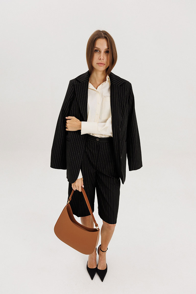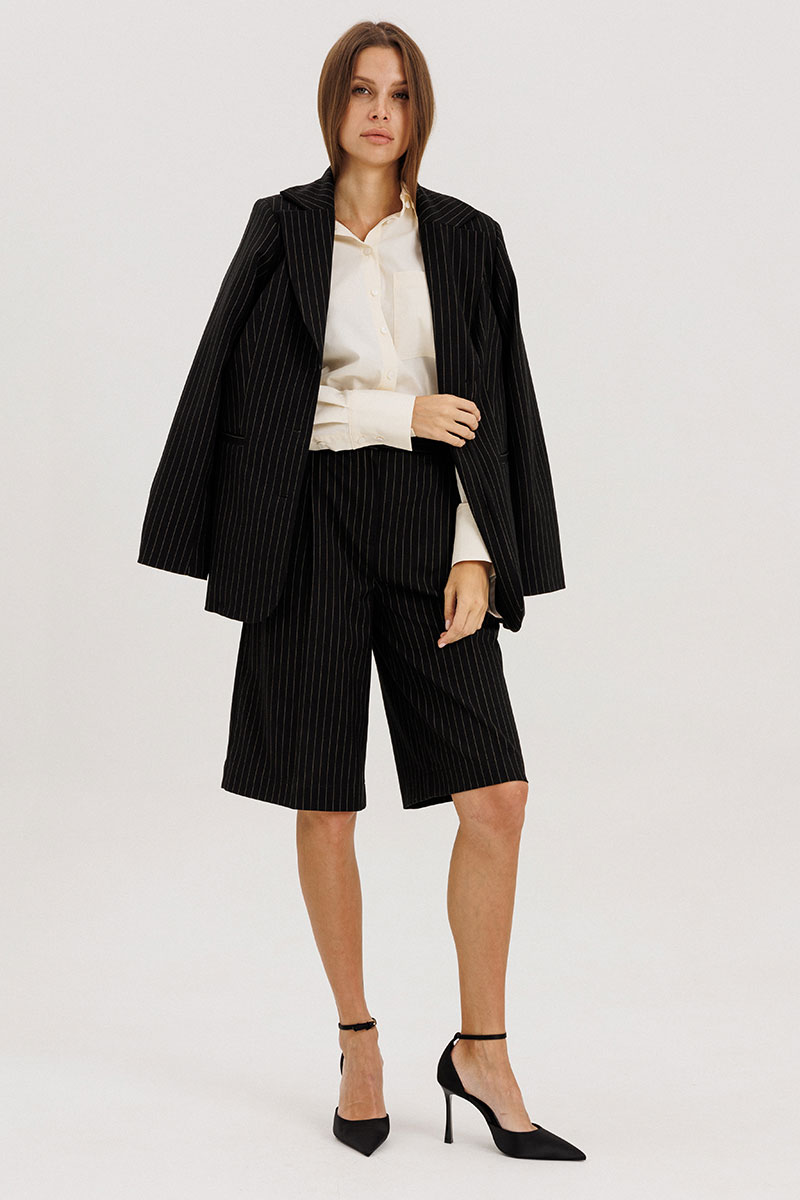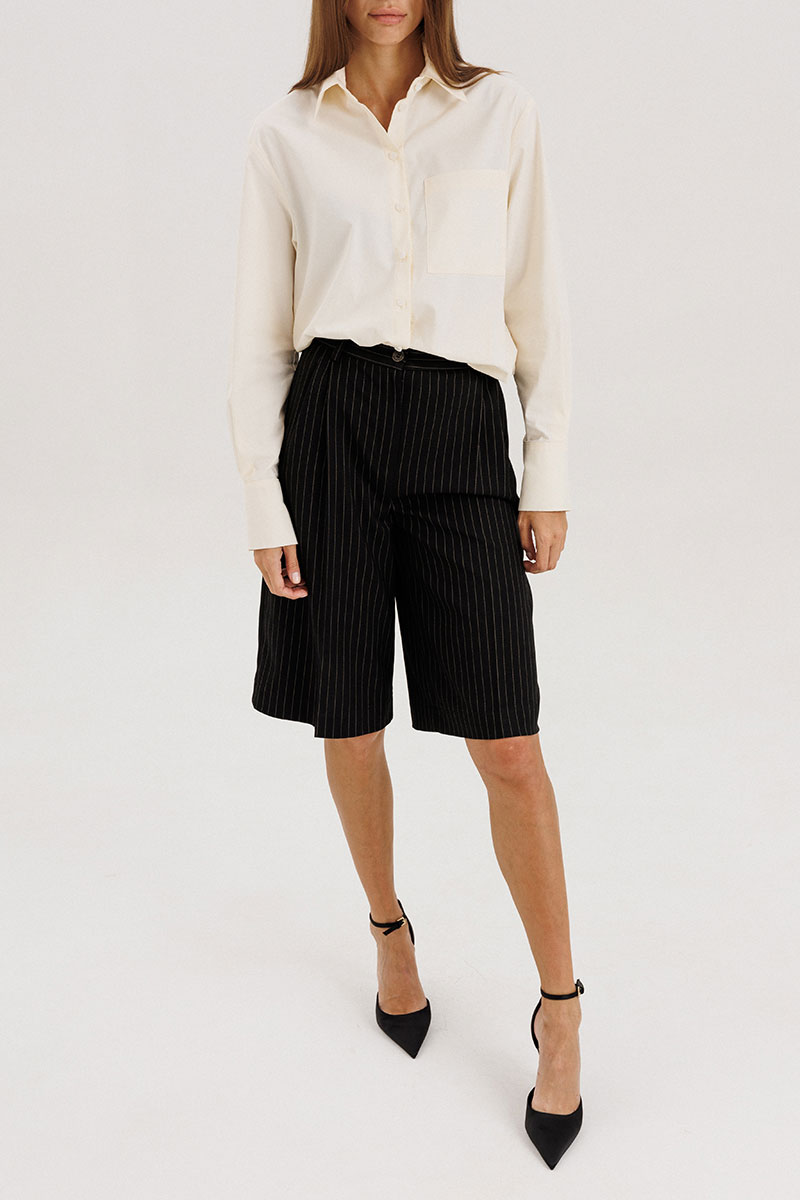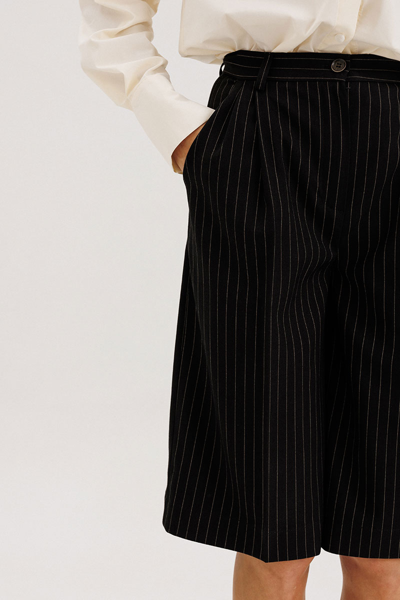 Классические шорты-бермуды на притачном поясе со шлевками, застежка на молнию и петлю-пуговицу. Выполнены из костюмной ткани черного цвета в полоску бежевого цвета. По переду защипы, высокая посадка, карманы боковые. Рост модели на фото 178 см.