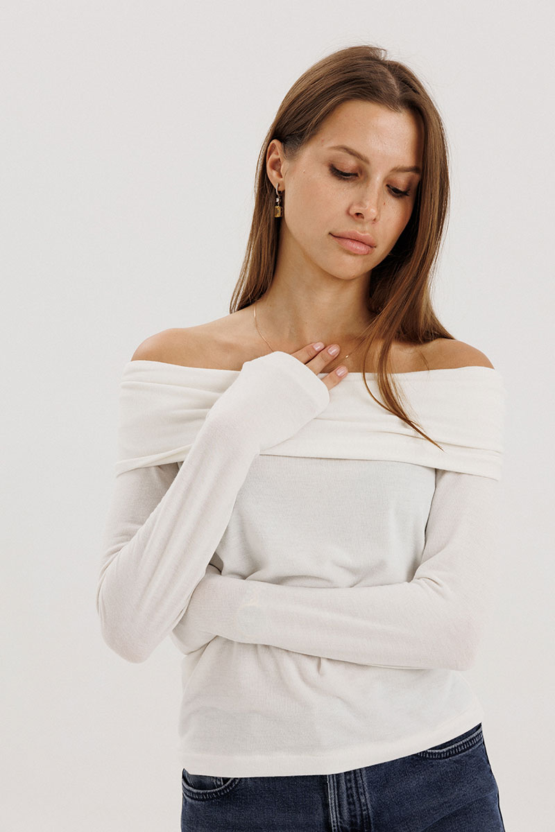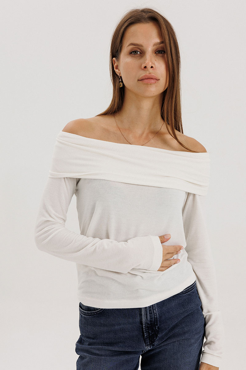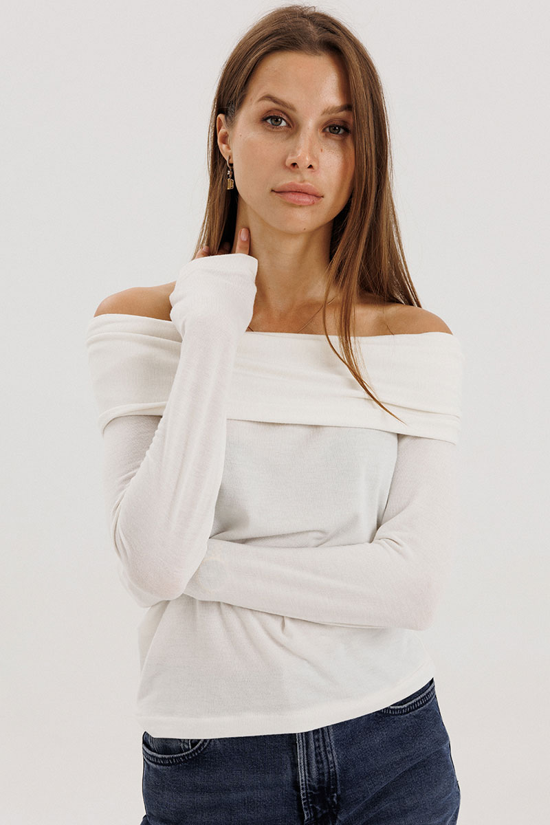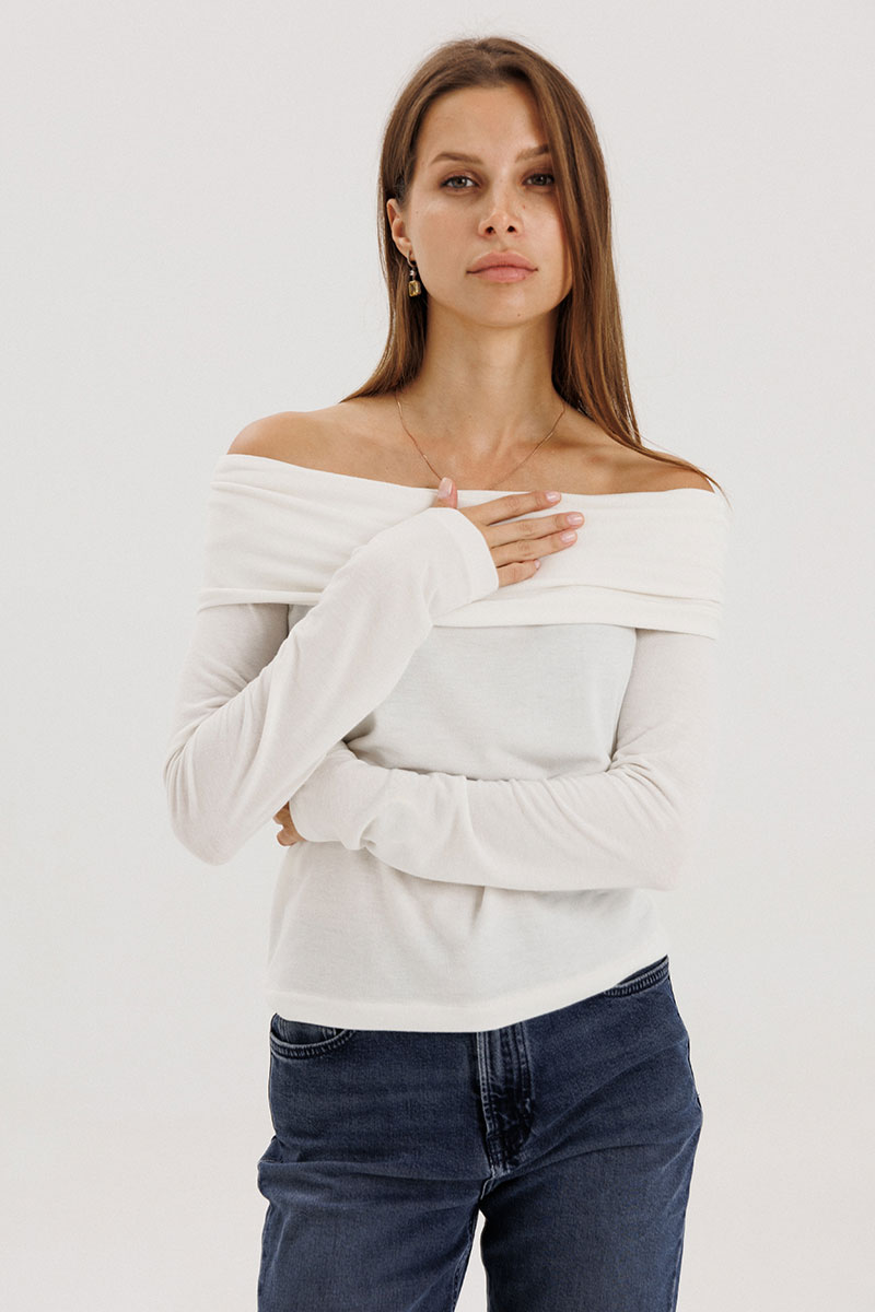 Базовый трикотажный джемперприлегающего силуэта выполнен из мягкой ткани молочного цвета,со спущенными плечами, рукав втачной. Ткань мягкая, ощущается как "вторая кожа" Джемпер отлично будет сочетаться с любыми повседневными вещами.