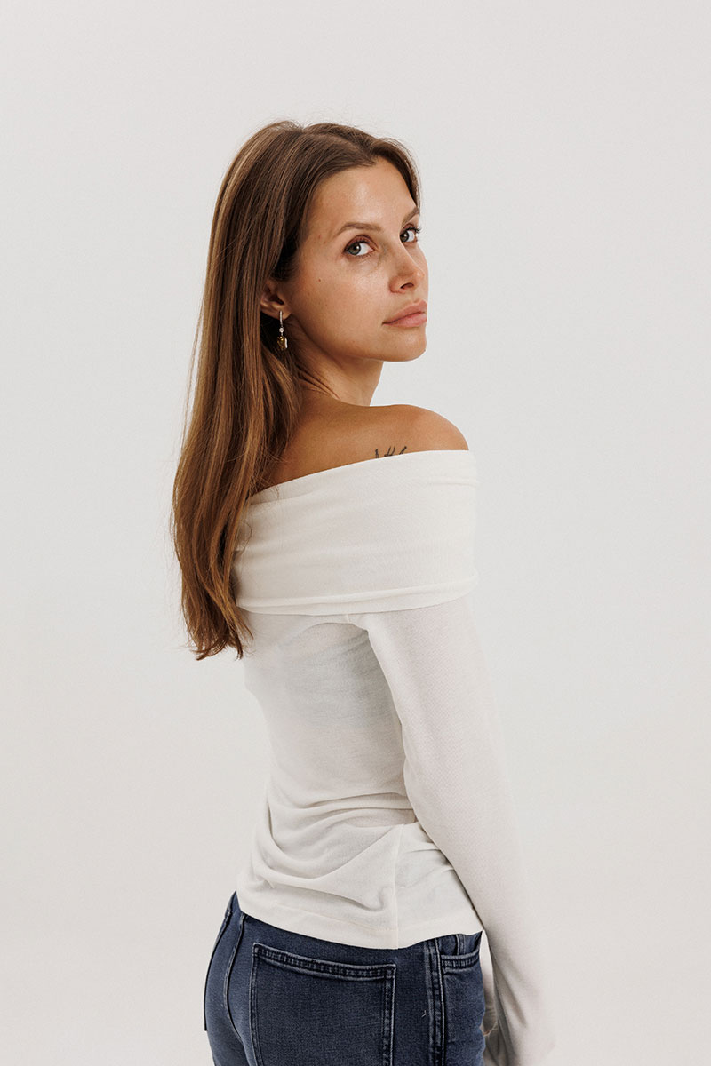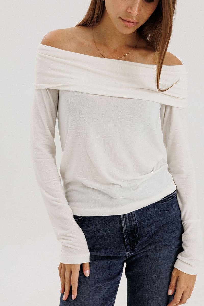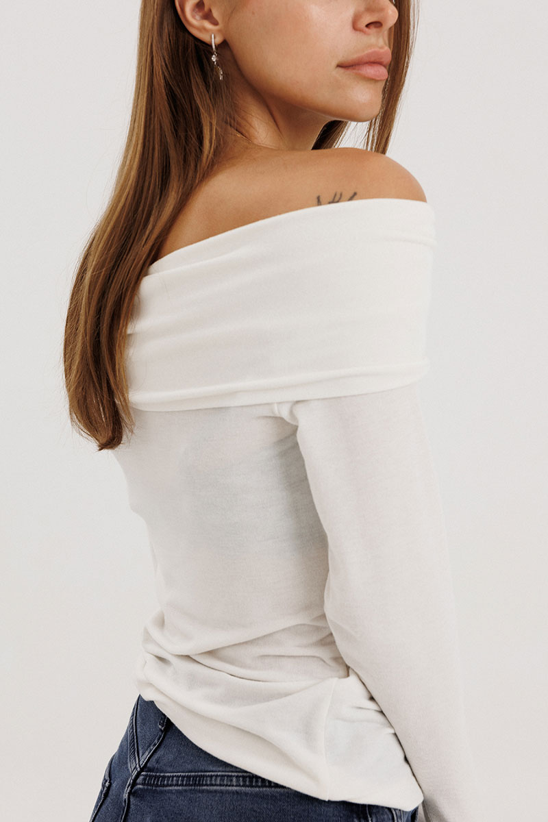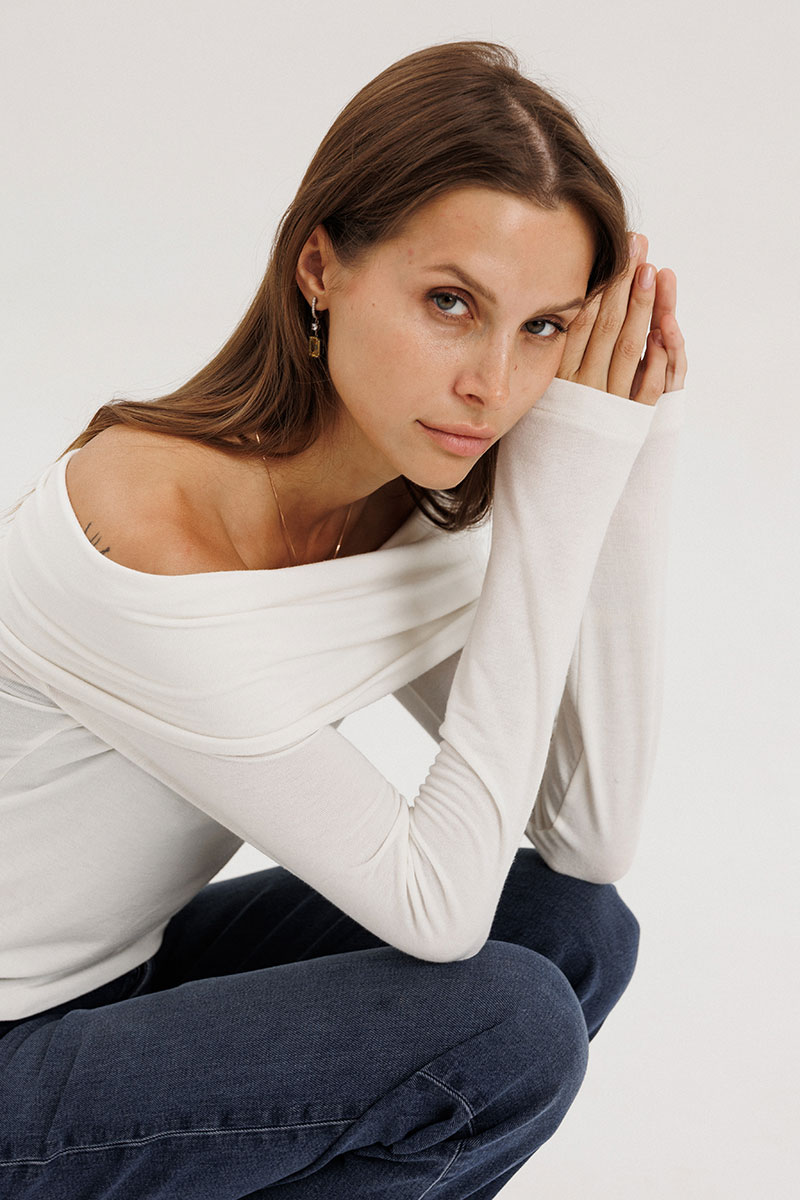 Базовый трикотажный джемперприлегающего силуэта выполнен из мягкой ткани молочного цвета,со спущенными плечами, рукав втачной. Ткань мягкая, ощущается как "вторая кожа" Джемпер отлично будет сочетаться с любыми повседневными вещами.