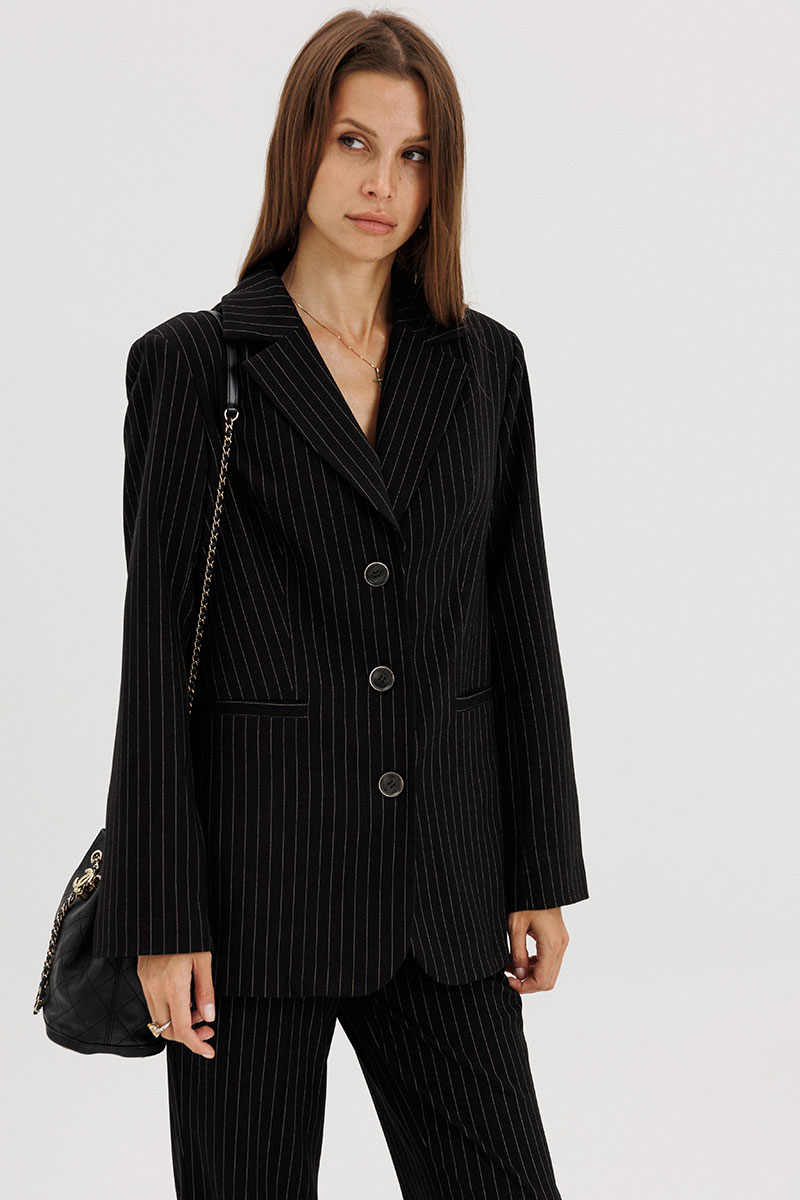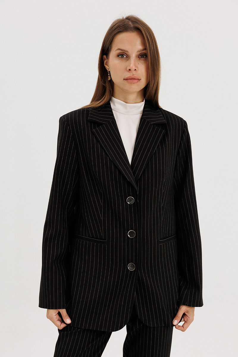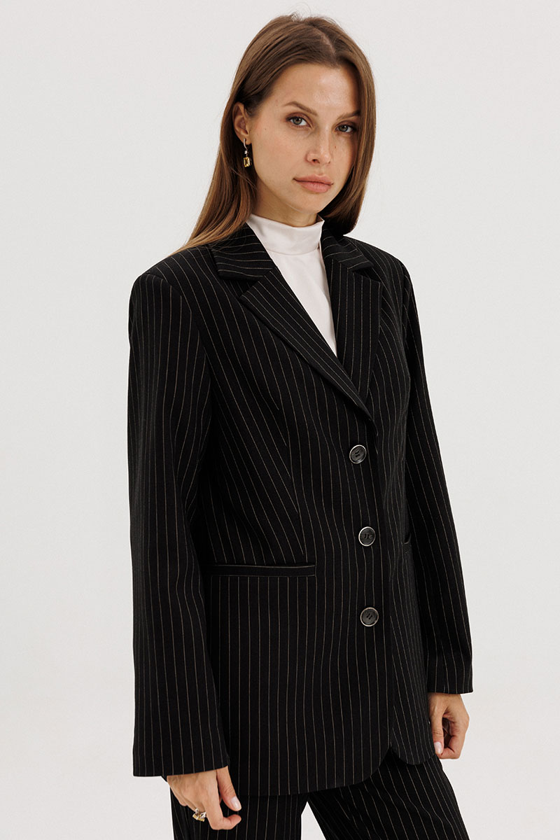 Жакет прямого силуэта, однобортный, выполнен из костюмной ткани черного цвета в полоску бежевого цвета, с застежкой на три петли-пуговицы, рукав втачной двухшовный, со шлицей, пуговицы на шлице функциональные. Перед пиджака обработан выточками, по бокам прорезные функциональные карманы с листочкой. Спинка со средним швом, сзади шлица. Жакет на подкладке, подкладка контрастная - бежевого цвета в тон полоске.