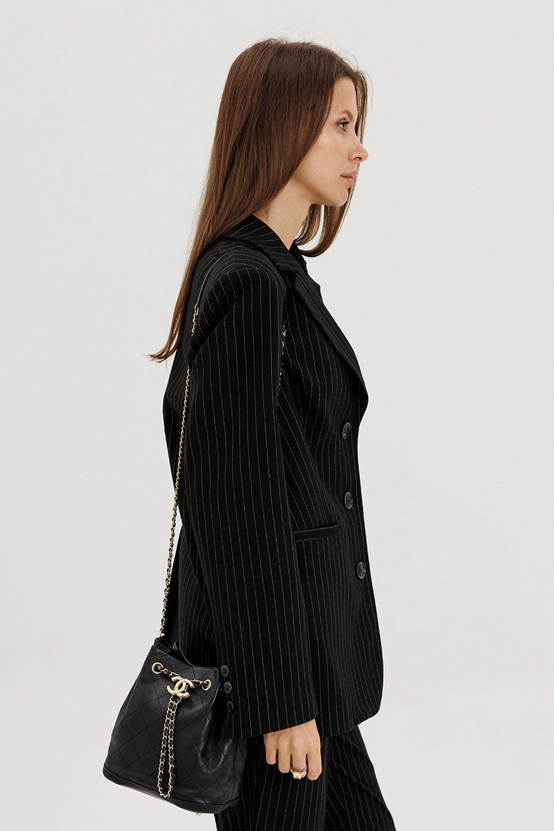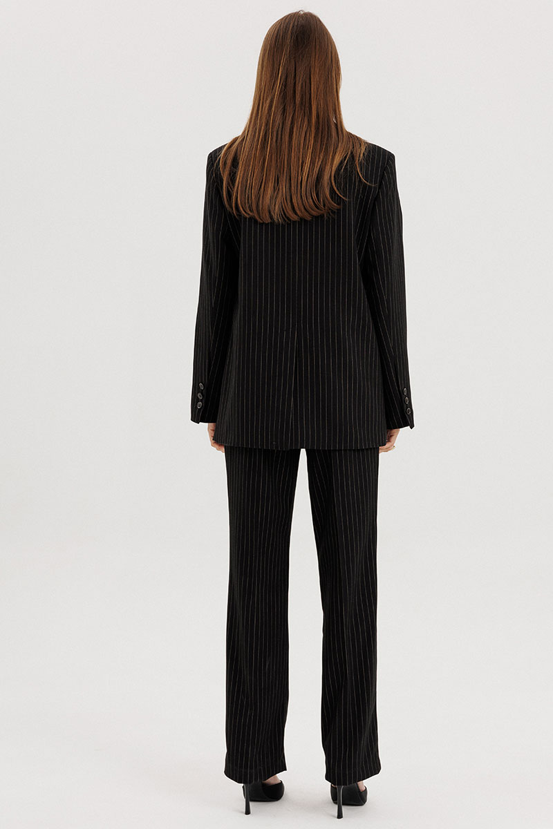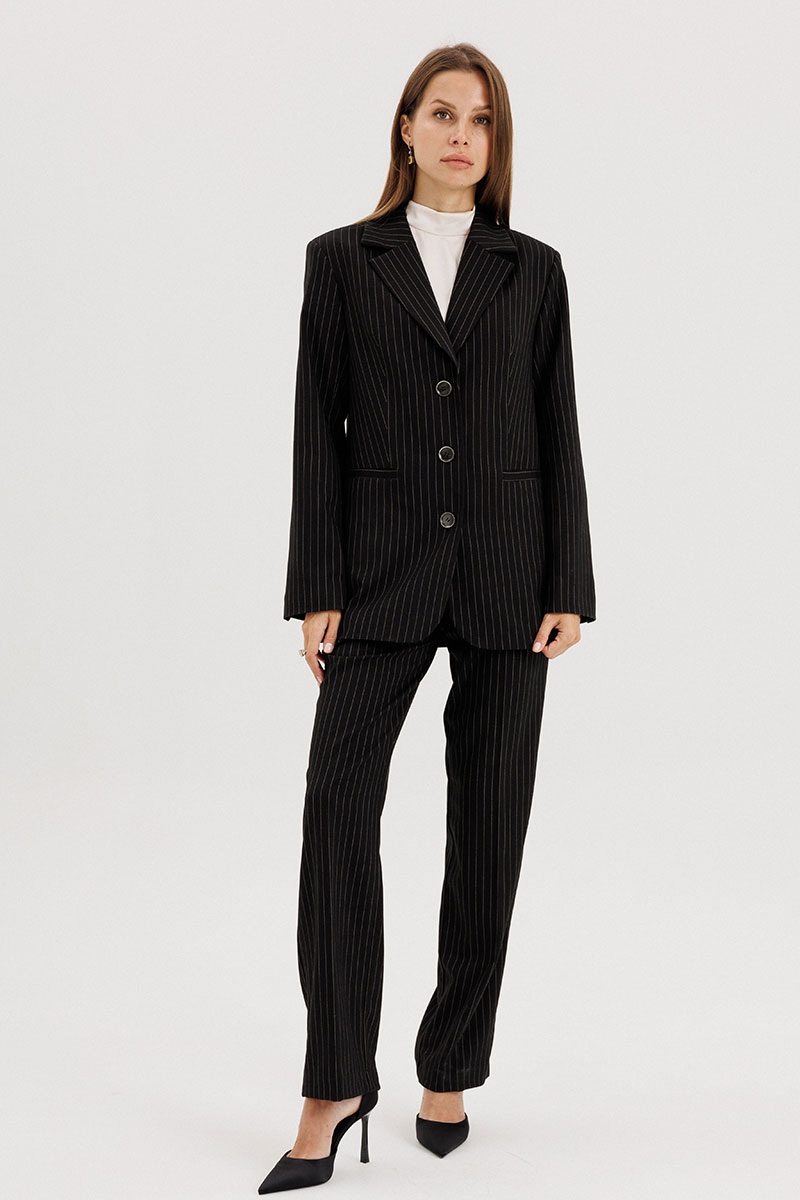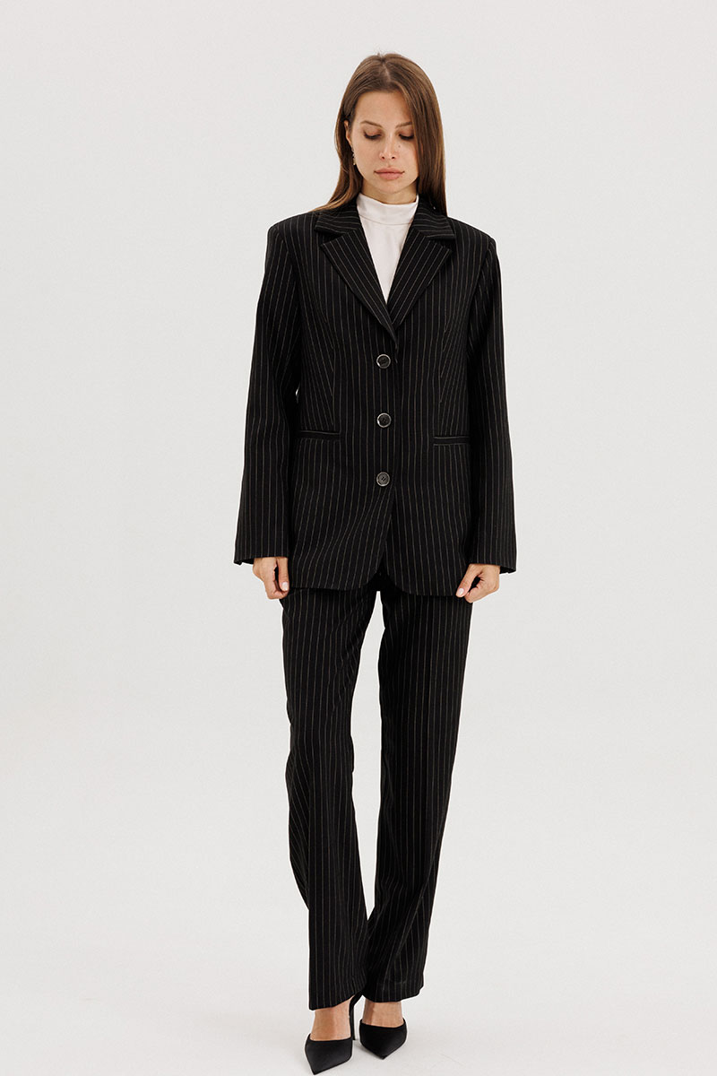 Жакет прямого силуэта, однобортный, выполнен из костюмной ткани черного цвета в полоску бежевого цвета, с застежкой на три петли-пуговицы, рукав втачной двухшовный, со шлицей, пуговицы на шлице функциональные. Перед пиджака обработан выточками, по бокам прорезные функциональные карманы с листочкой. Спинка со средним швом, сзади шлица. Жакет на подкладке, подкладка контрастная - бежевого цвета в тон полоске.