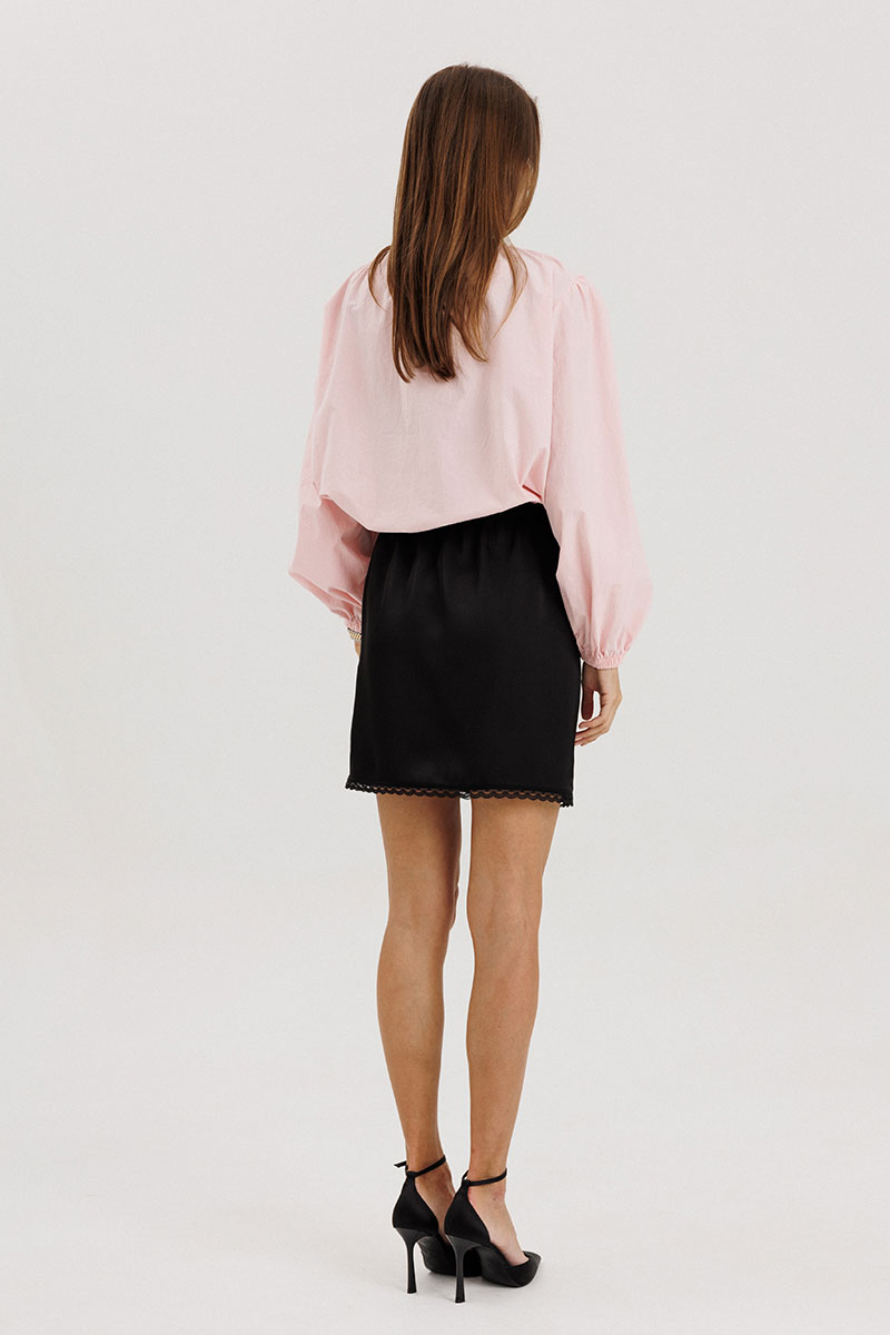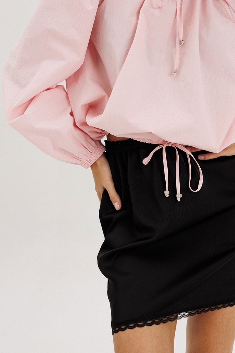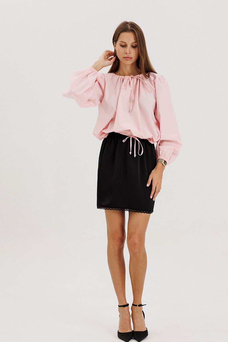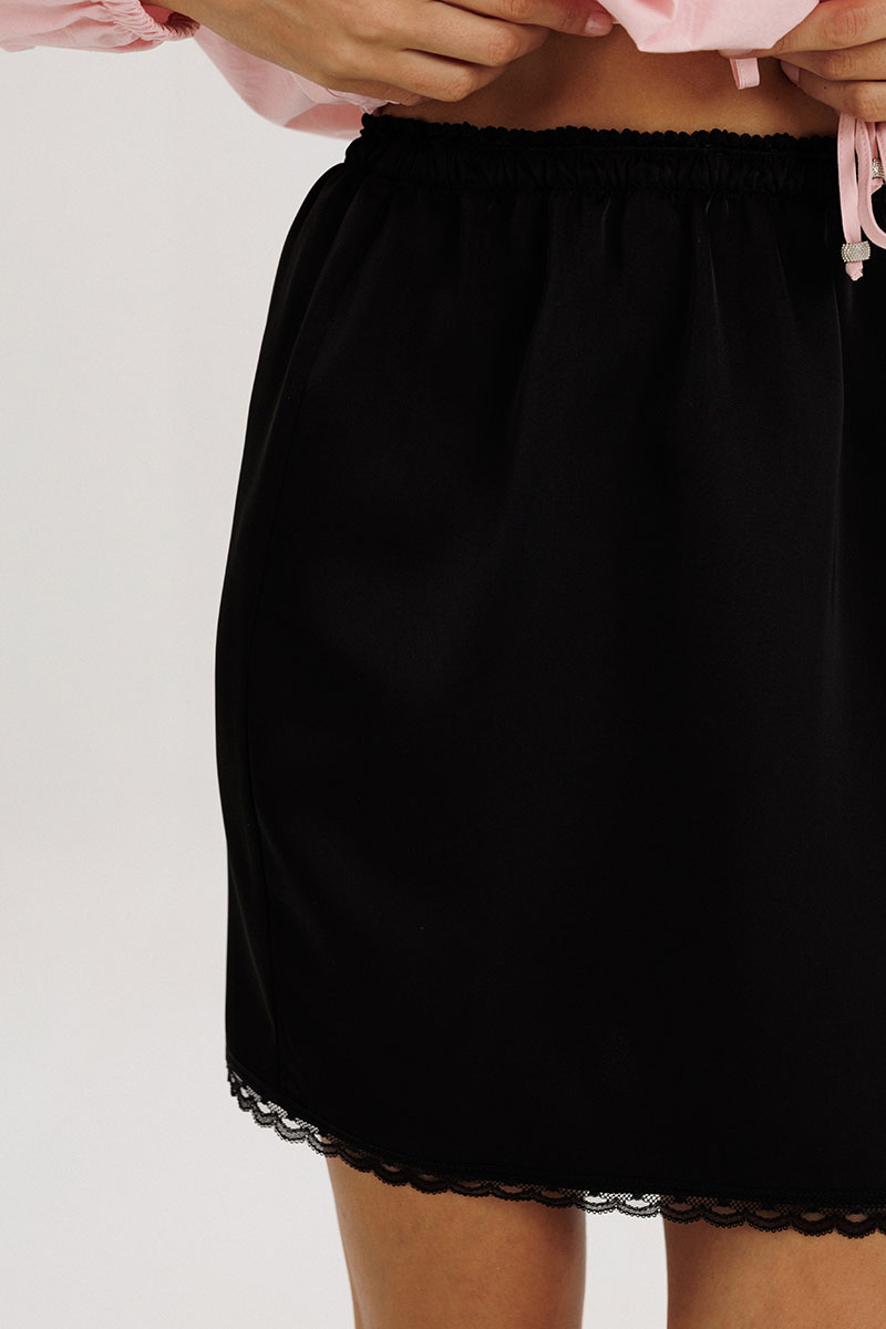 Атласная мини-юбка прямого кроя, на резинке, по низу кружево, пояс обработан декаративной тесьмой. Атлас плотный, не просвечивает. Юбку можно носить с топами, свитерами, жакетами, рубашками в любое время года.