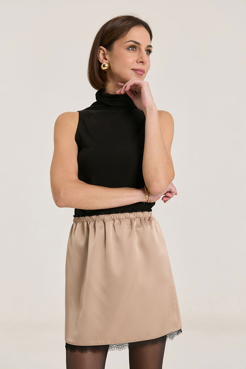 Атласная мини-юбка прямого кроя, на резинке, по низу кружево, пояс обработан декаративной тесьмой. Атлас плотный, не просвечивает. Юбку можно носить с топами, свитерами, жакетами, рубашками в любое время года.