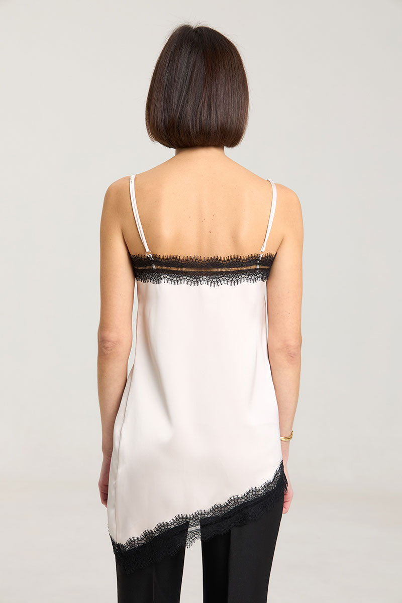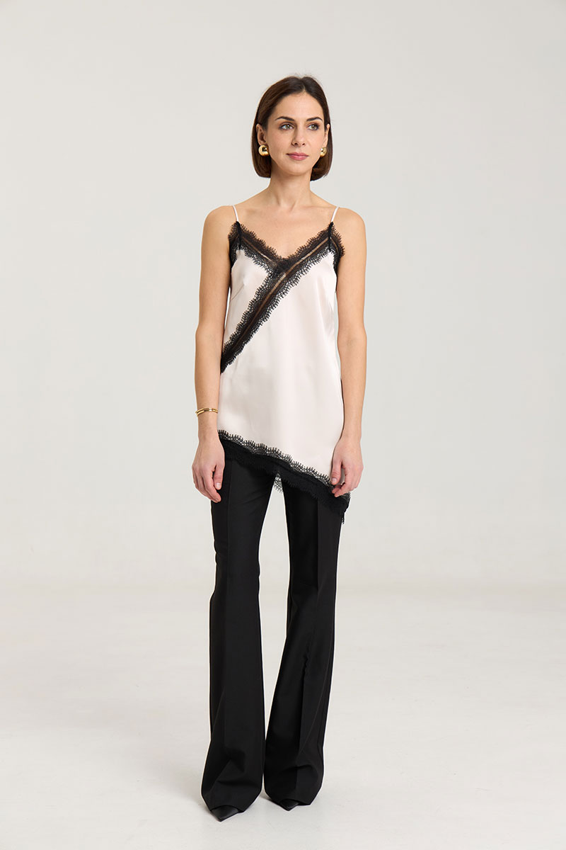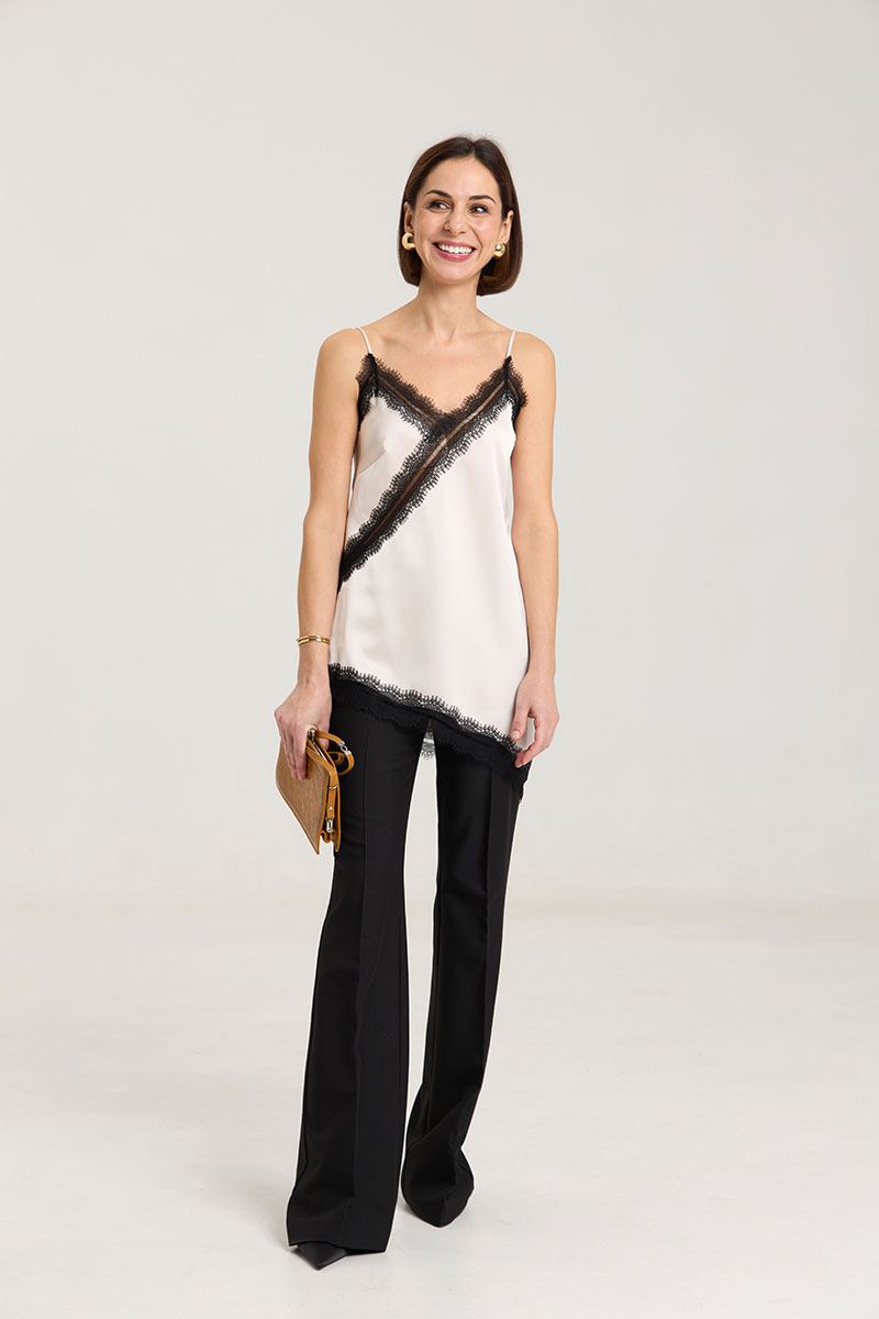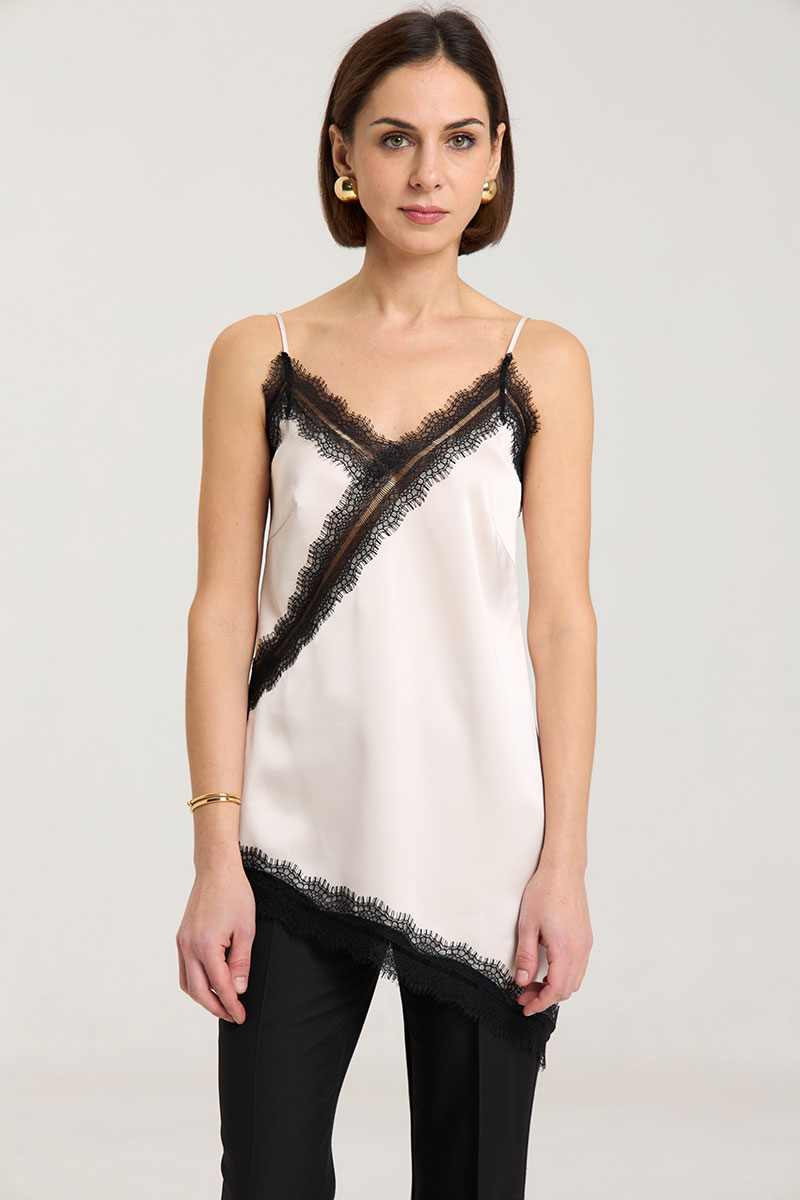 Ассиметричный топ с кружевом, топ на регулируемых бретелях, Топ станет дополнением к любому образу, будь то повседневный или нарядный. Можно сочетать с атласными черными брюками или юбкой из нашей коллекции. Атлас плотный, на груди вытачки.