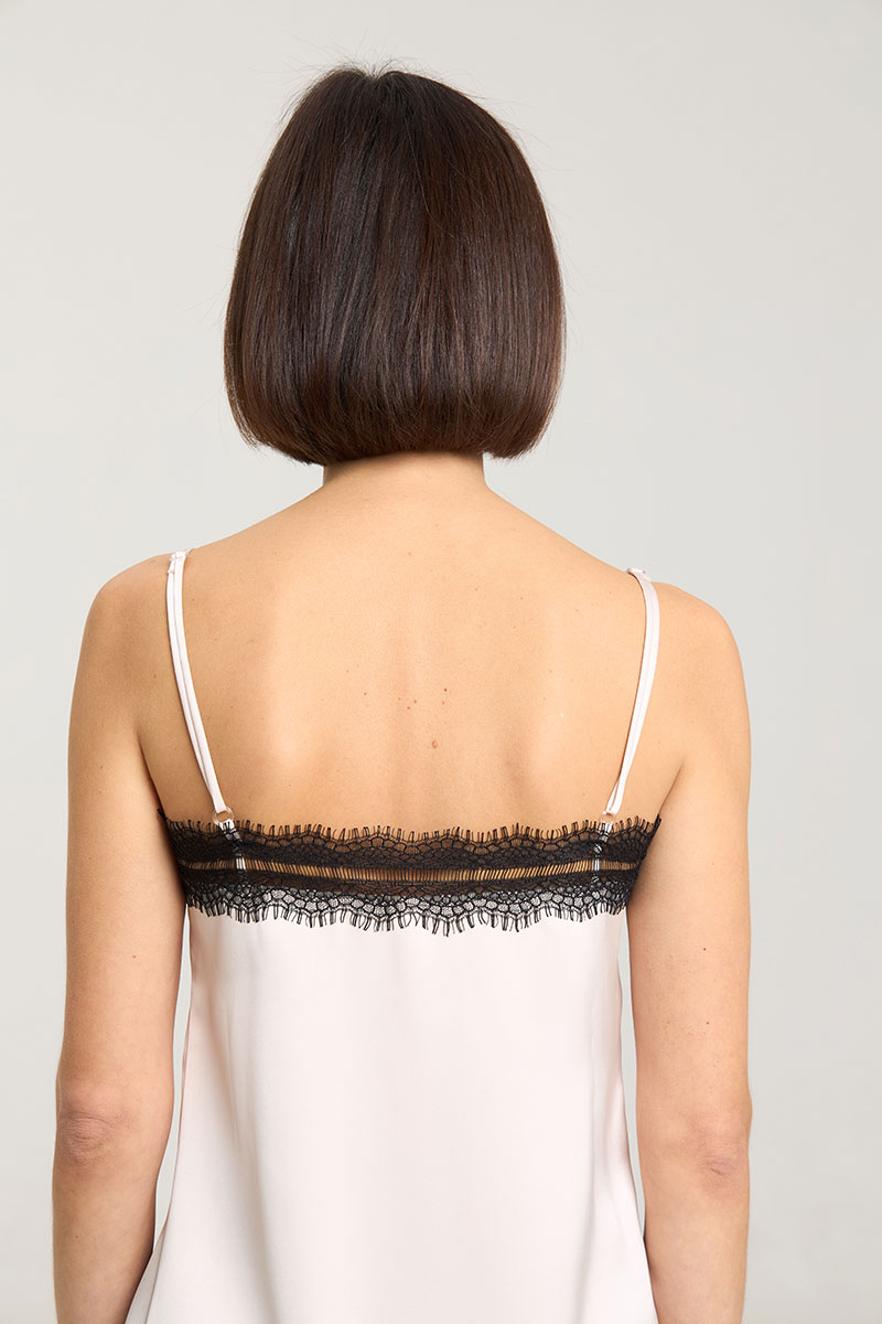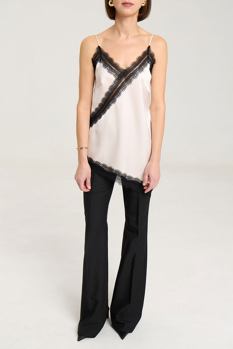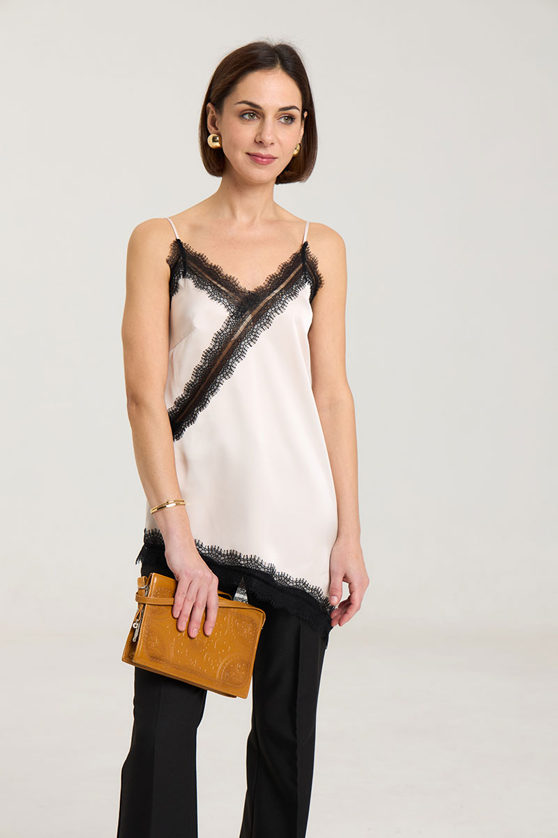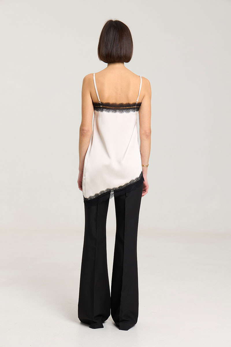 Ассиметричный топ с кружевом, топ на регулируемых бретелях, Топ станет дополнением к любому образу, будь то повседневный или нарядный. Можно сочетать с атласными черными брюками или юбкой из нашей коллекции. Атлас плотный, на груди вытачки.
