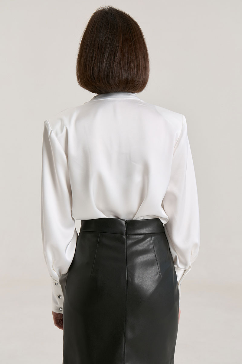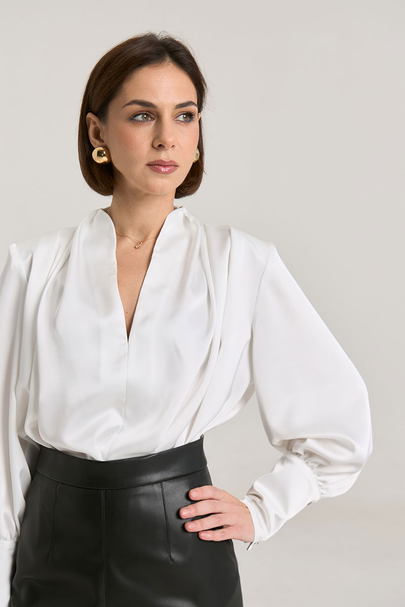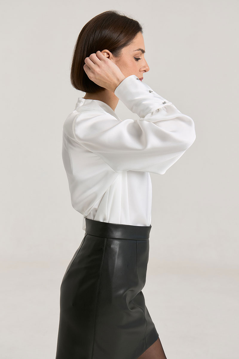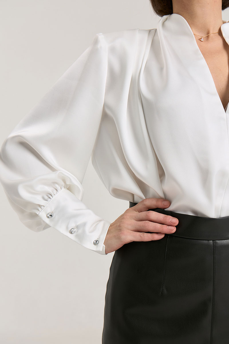 Блузка свободного силуэта, горловина V-образная, рукав притачной, линия плеча зафиксирована плечевыми вставками, манжета широкая, с застежкой на петли-пуговицы. Блуза выполнена из плотной атласной ткани красного цвета, ткань не просвечивает. Деликатный материал требует бережного обращения. Рост модели на фото 168 см.