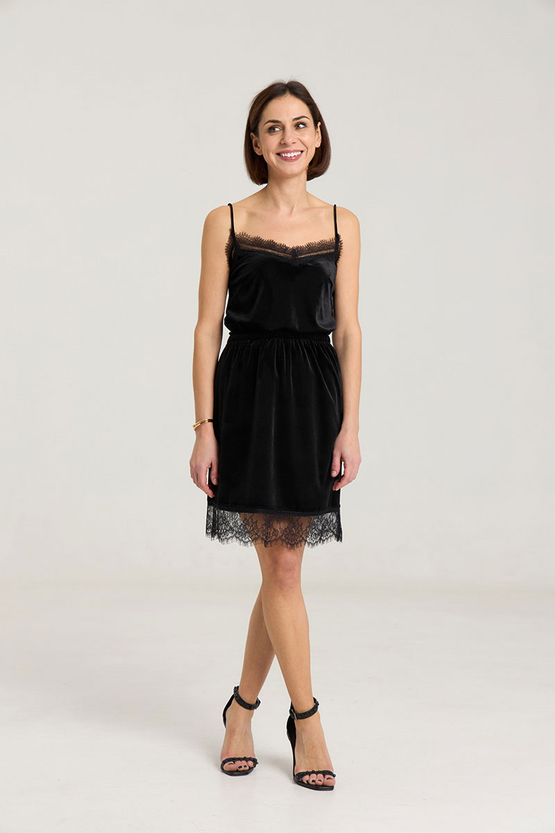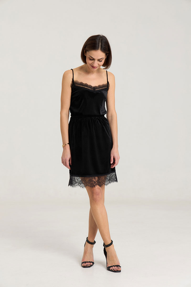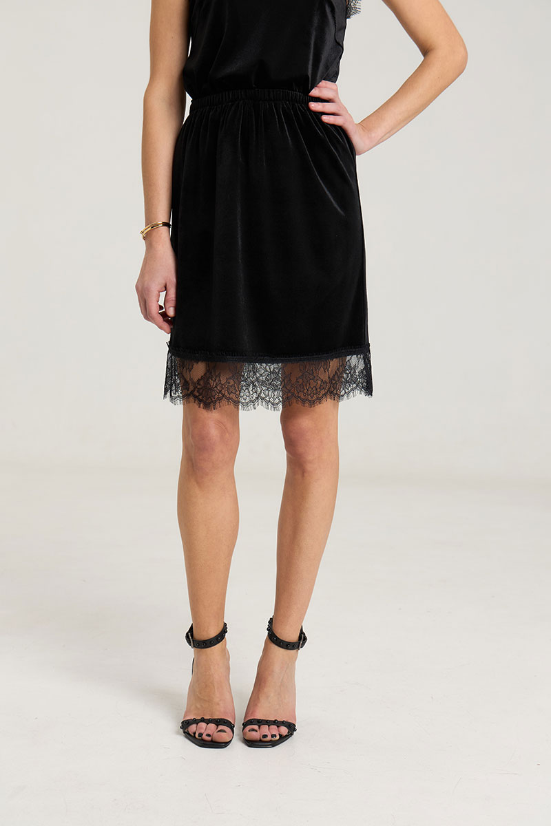 Юбка в длине миди выполнена из мягкой велюровой ткани черного цвета. Юбка на резинке, прямого силуэта, по низу отстрочено французким широким кружевом. Юбку можно сочетать вместе с топом из нащей коллекции, либо самостоятельно. Юбка без подлкадки.
