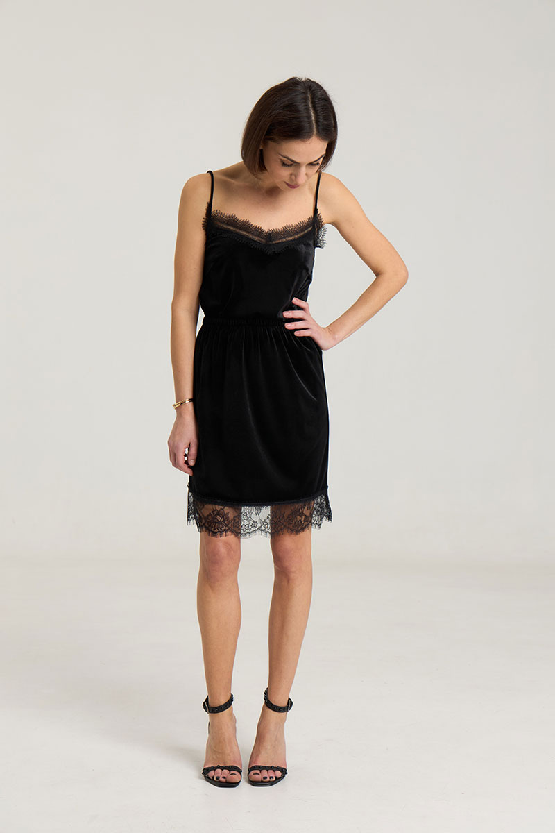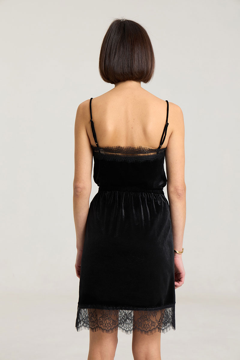 Топ выполнен из мягкой велюровой ткани, на регулируемых бретелях. Полуприлегающего силуэта, по переду и спинке отстрочено кружевом.