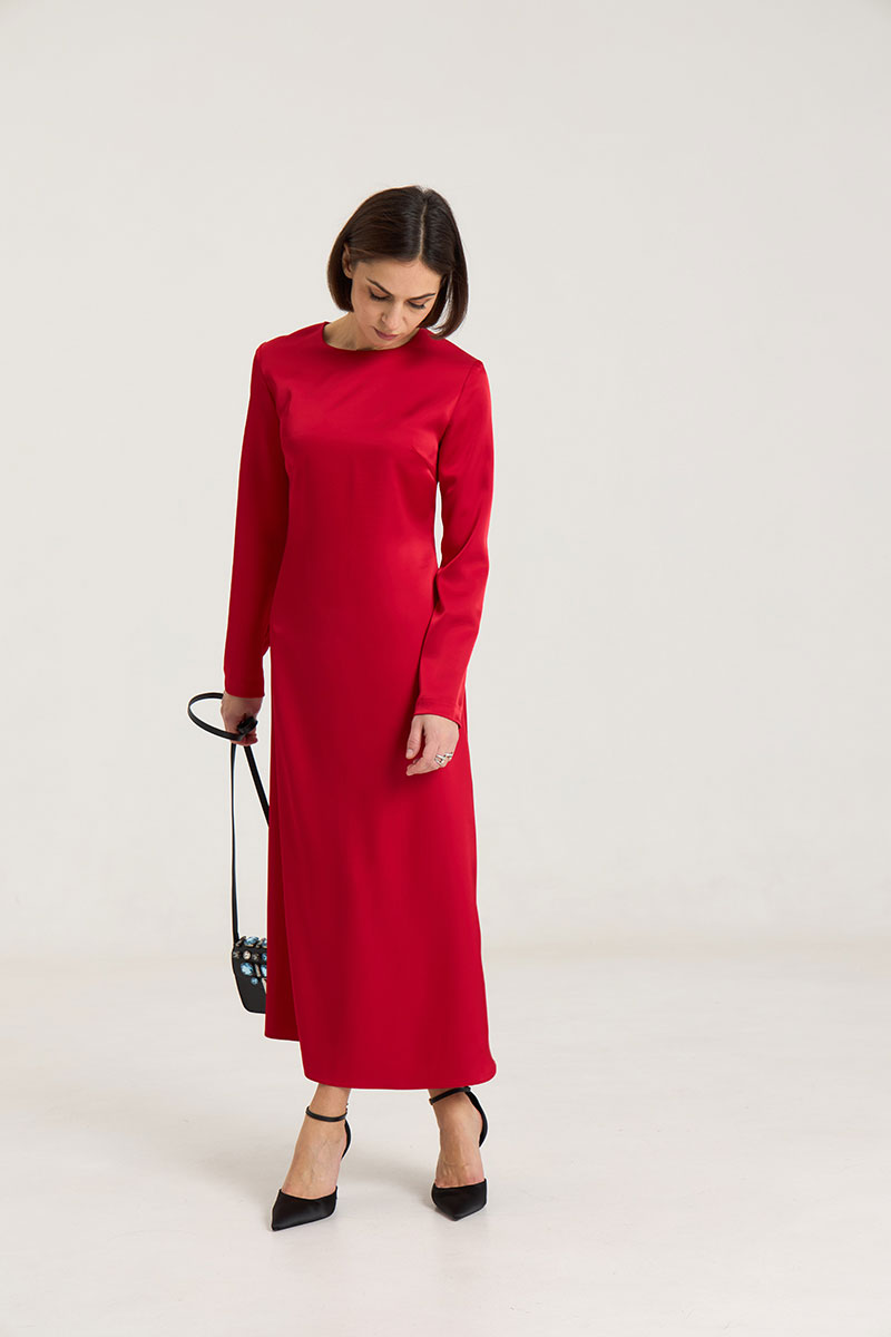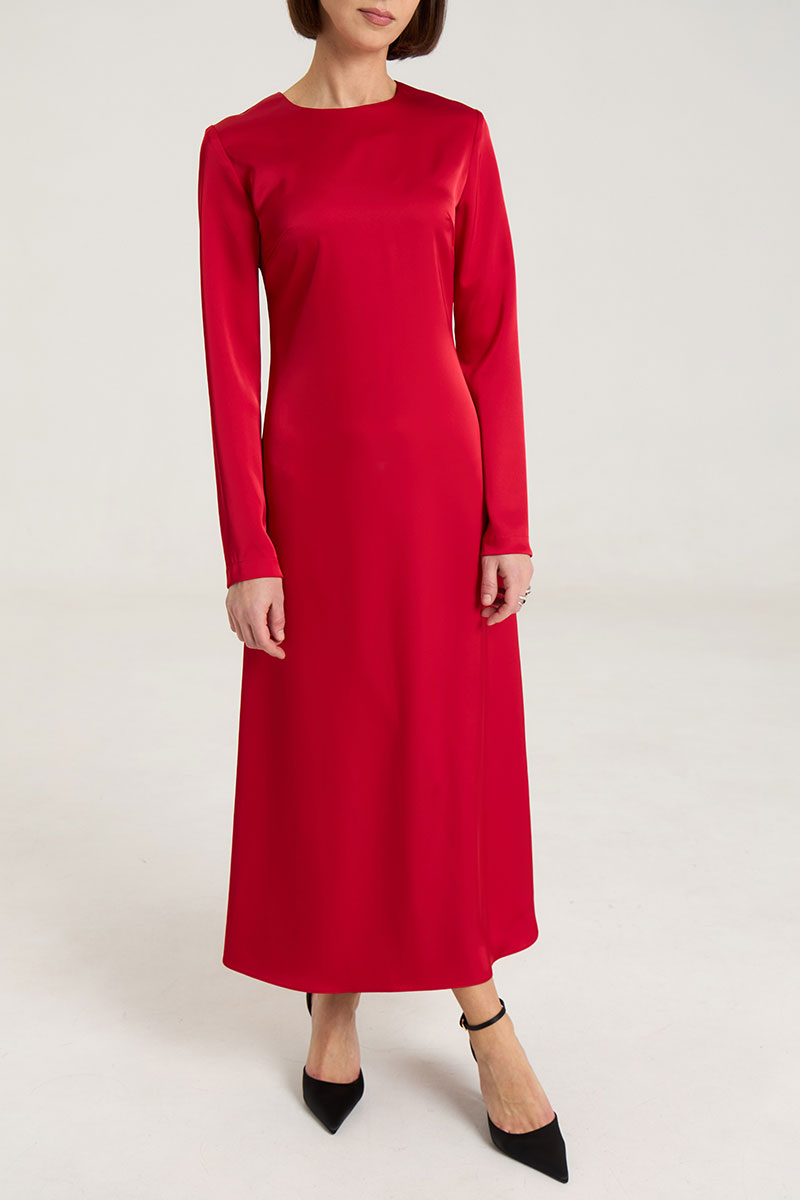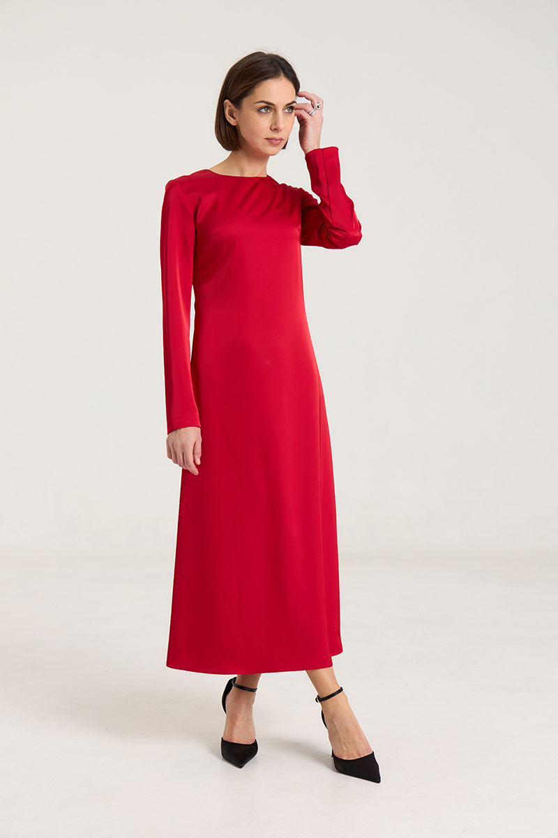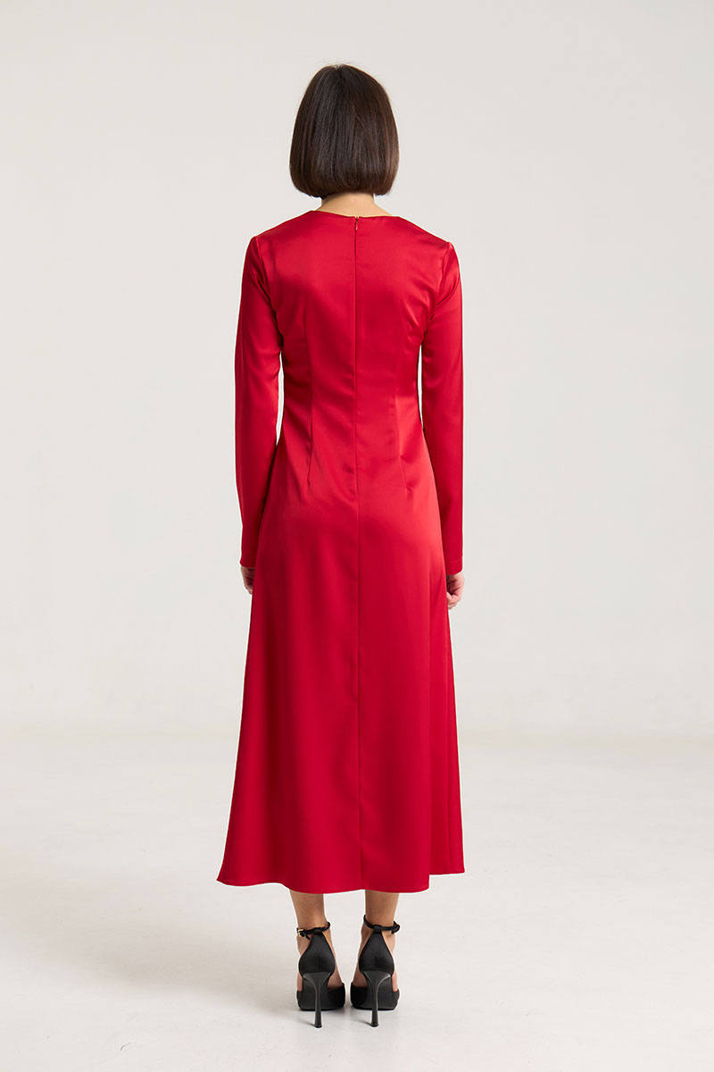 Атласное платье в "правильном" глубоком красном цвете, платье полуприлегающего силуэта,расклешенное к низу, застежка в среднем шве на потайную молнию. Рукав втачной, прямой, по спинке талиевые выточки, по переду нагрудные выточки.Платье без подкладки.