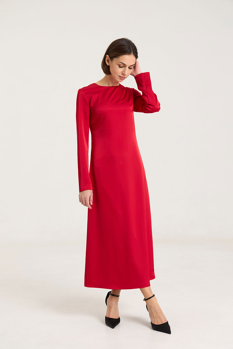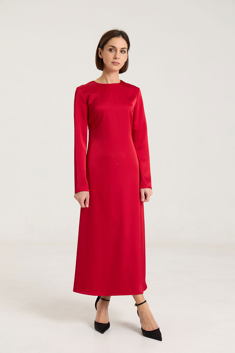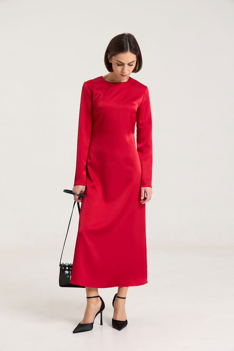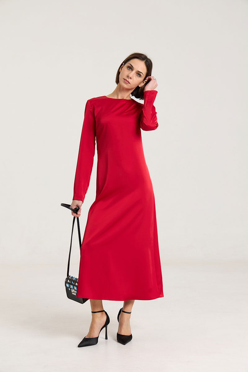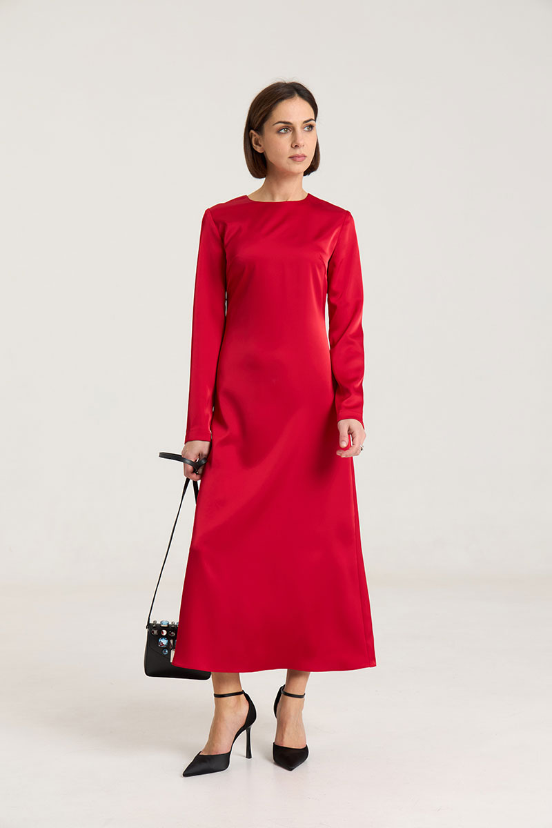 Атласное платье в "правильном" глубоком красном цвете, платье полуприлегающего силуэта,расклешенное к низу, застежка в среднем шве на потайную молнию. Рукав втачной, прямой, по спинке талиевые выточки, по переду нагрудные выточки.Платье без подкладки.