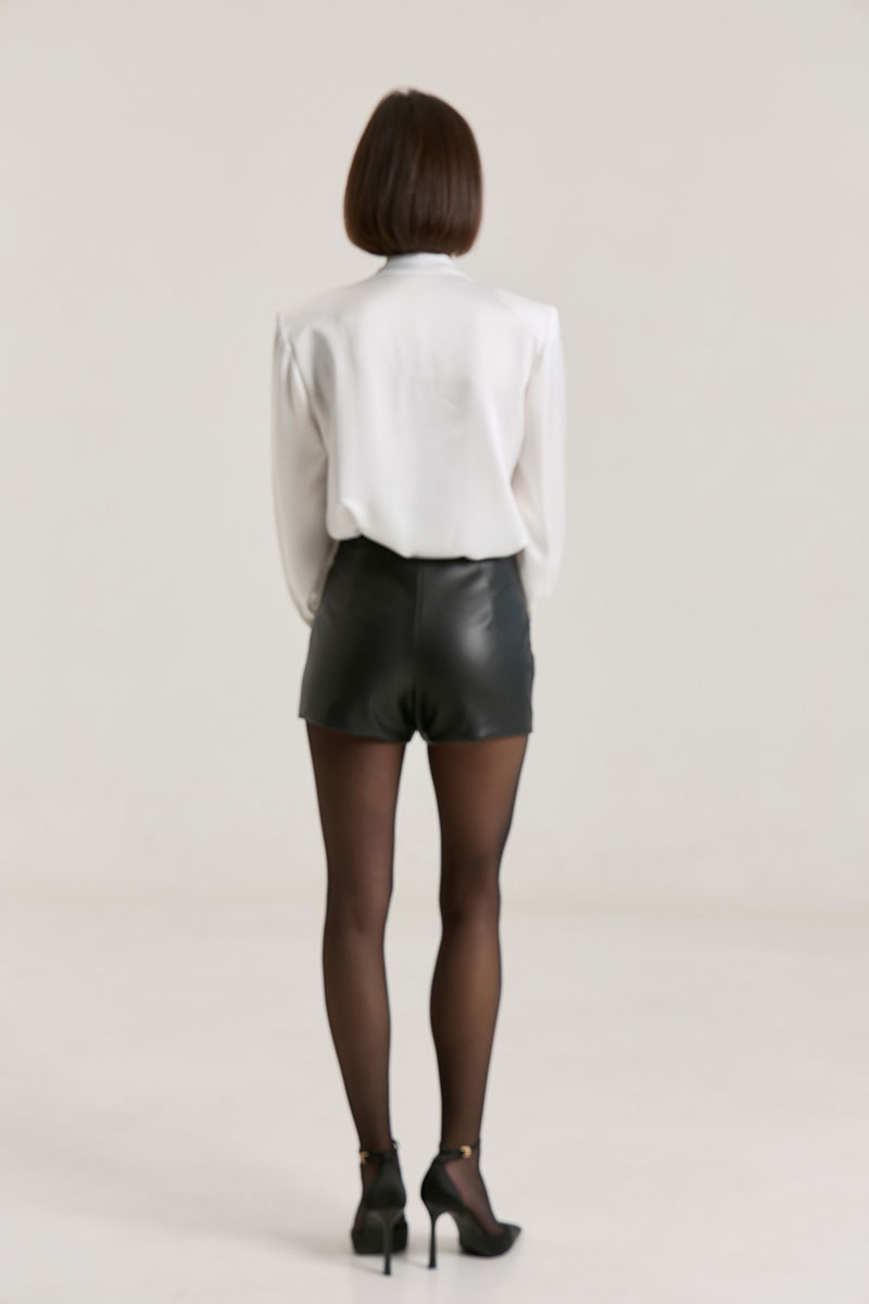 Шорты прилегащего силуэта, на подкладке, в боковом шве молния. Шорты выполнены из мягкой экокожи черного цвета.Шорты красвио сочетаются со свитерами, футболками, лонгами, летом можноносить с топами и босоножками. Можно носить в комплекте с нашим жакетом арт. 2463 из экокожи. Рост модели 168 см.