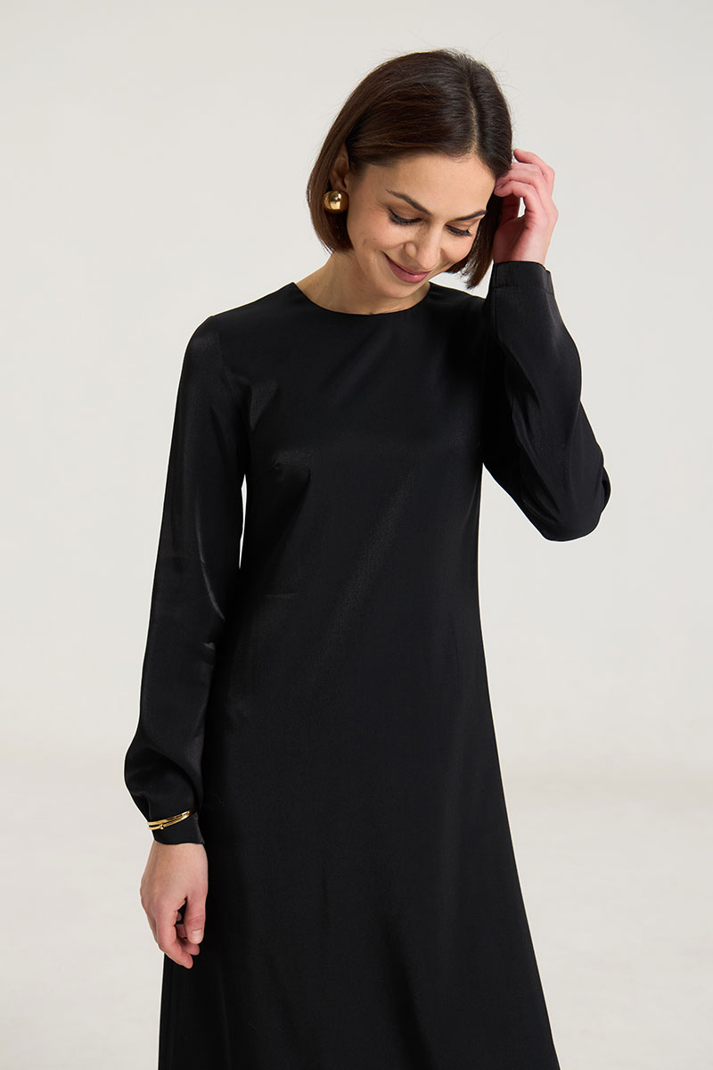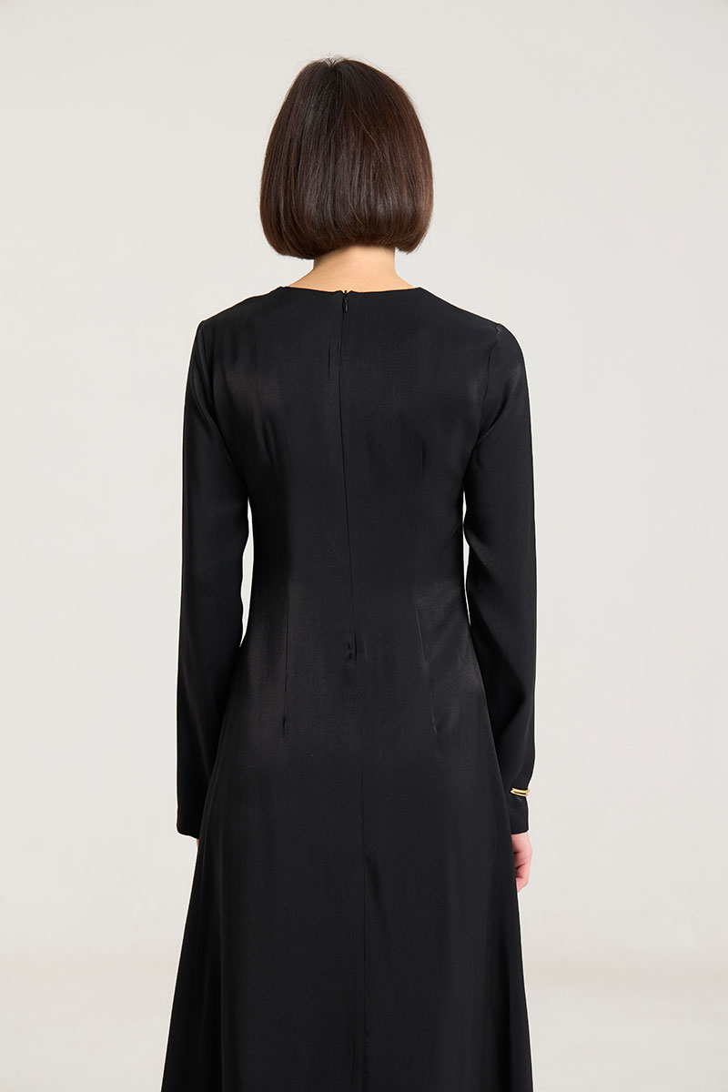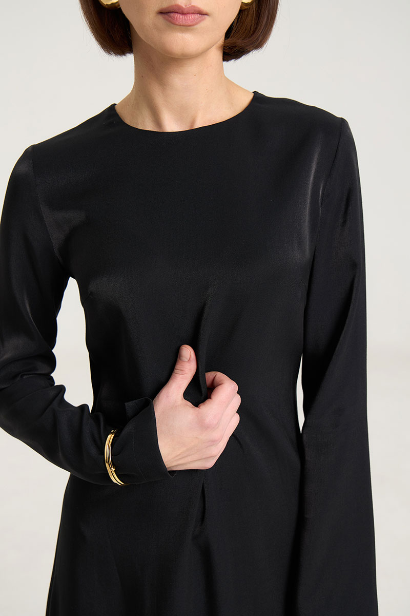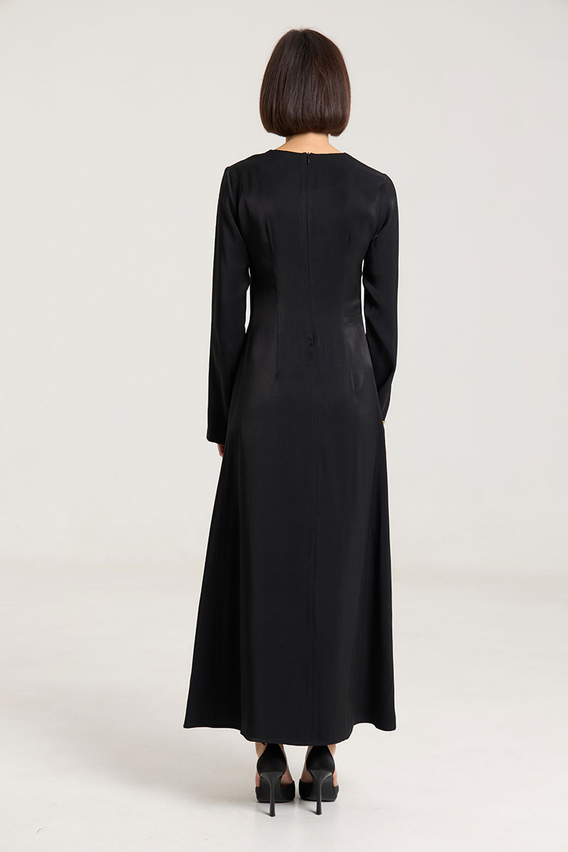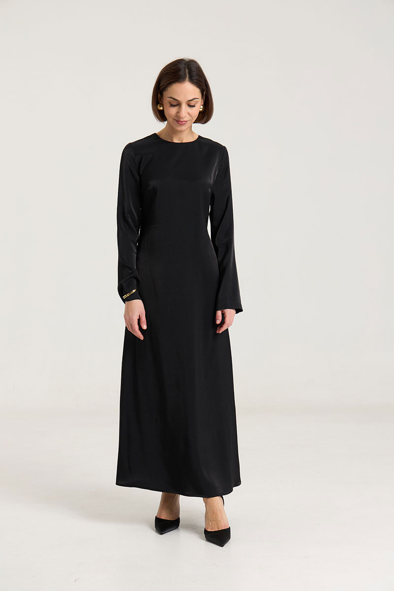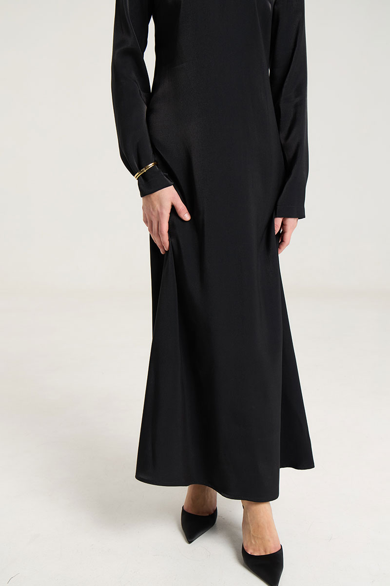 Платье в длине макси в черном цвете , полуприлегающего силуэта,расклешенное к низу, застежка в среднем шве на потайную молнию. Рукав втачной, прямой, по спинке талиевые выточки, по переду нагрудные выточки. Выполнено из лекой ткани с блеском, очень красиво передивается и придает образу изысканность и лоск. Платье без подкладки.