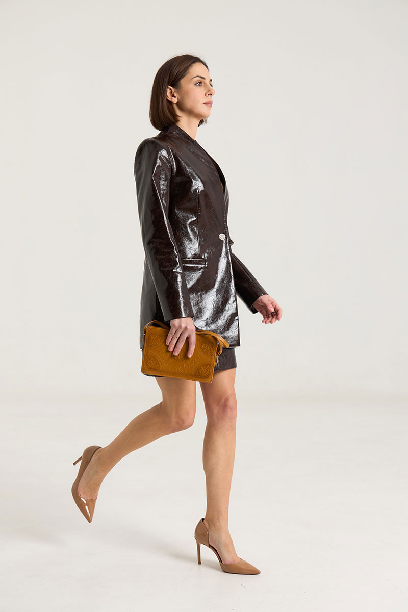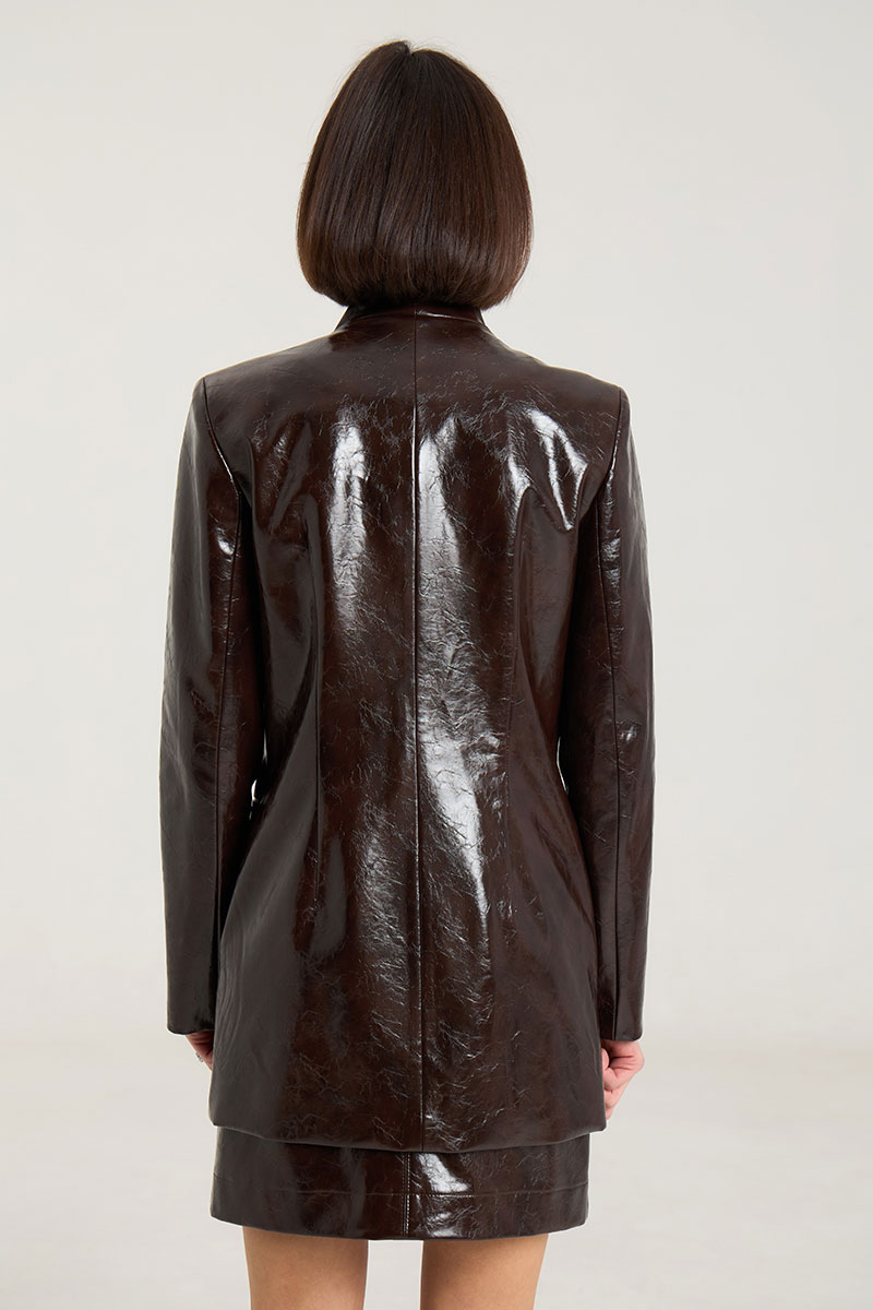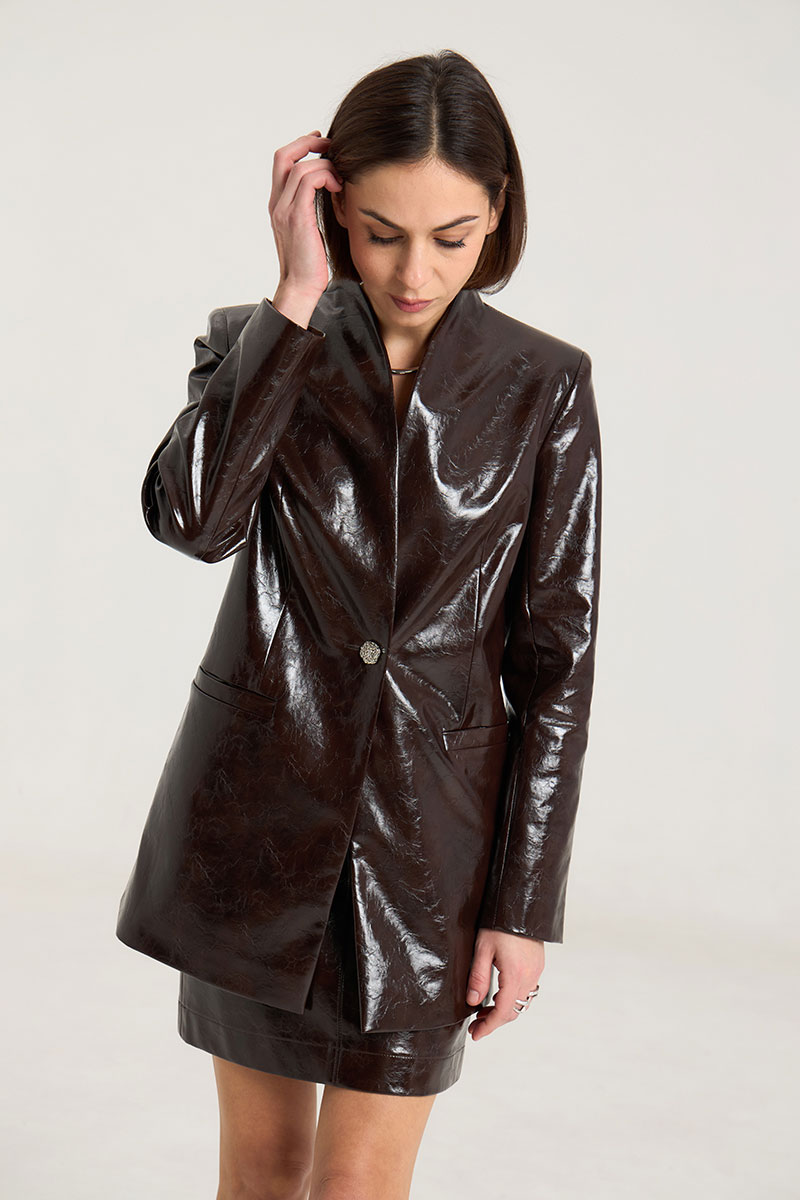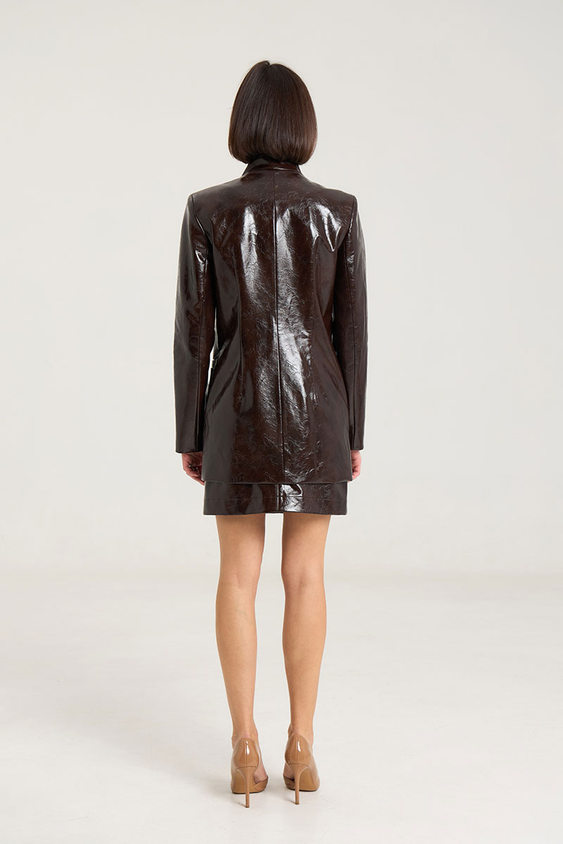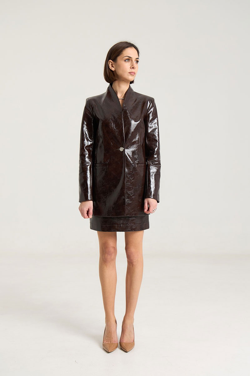 Комплект двухпредметный, состоит из жакета и юбки. Жакет однобортный на однй центральную петлю-пуговицу, на подкладке, полуприлегающего силуэтас прорезными карманами в рамку по переду. Воротник втачной-стойка, рукав двухшовный, спинка жакета разрезная по центру с талиевыми выточками. Жакет выполнен их плотной лаковой экокожи премиум качества шоколадного цвета. Юбка прилегающего силуэта на притачном поясе, посадка высокая , юбка на подкладке, изделие имеет центральный шов спереди и сзади. В среднем шве застежка на потайную молнию. Юбка выполнена из плотной лаковой экокожи шоколадного цвета. Рост модели на фото 168 см.