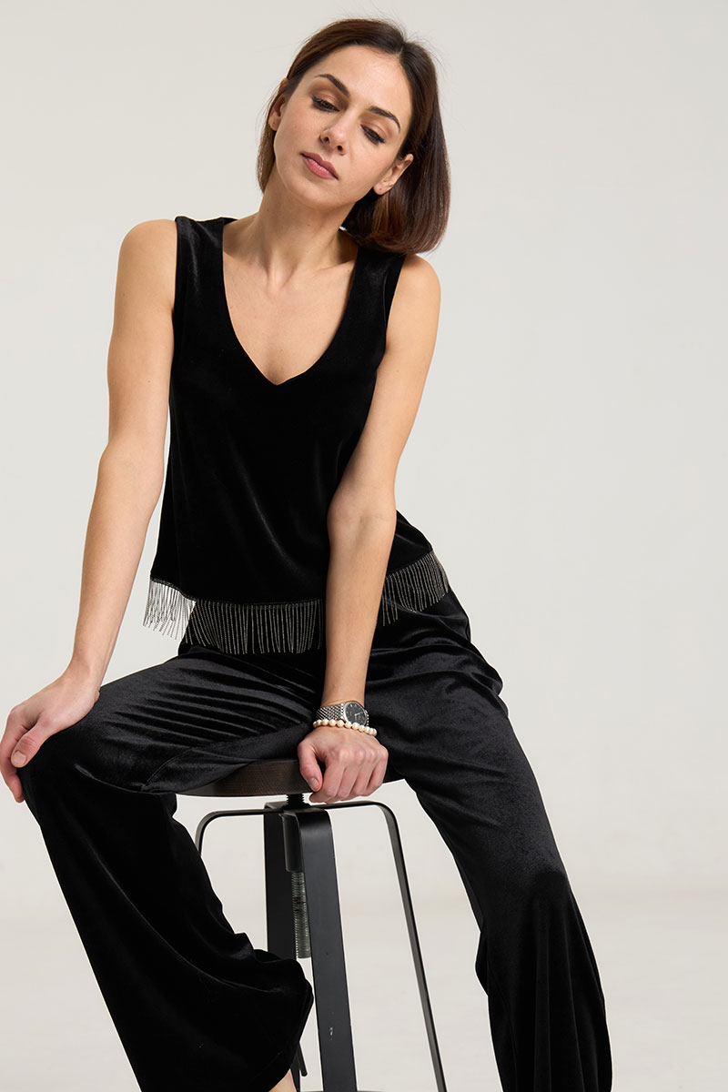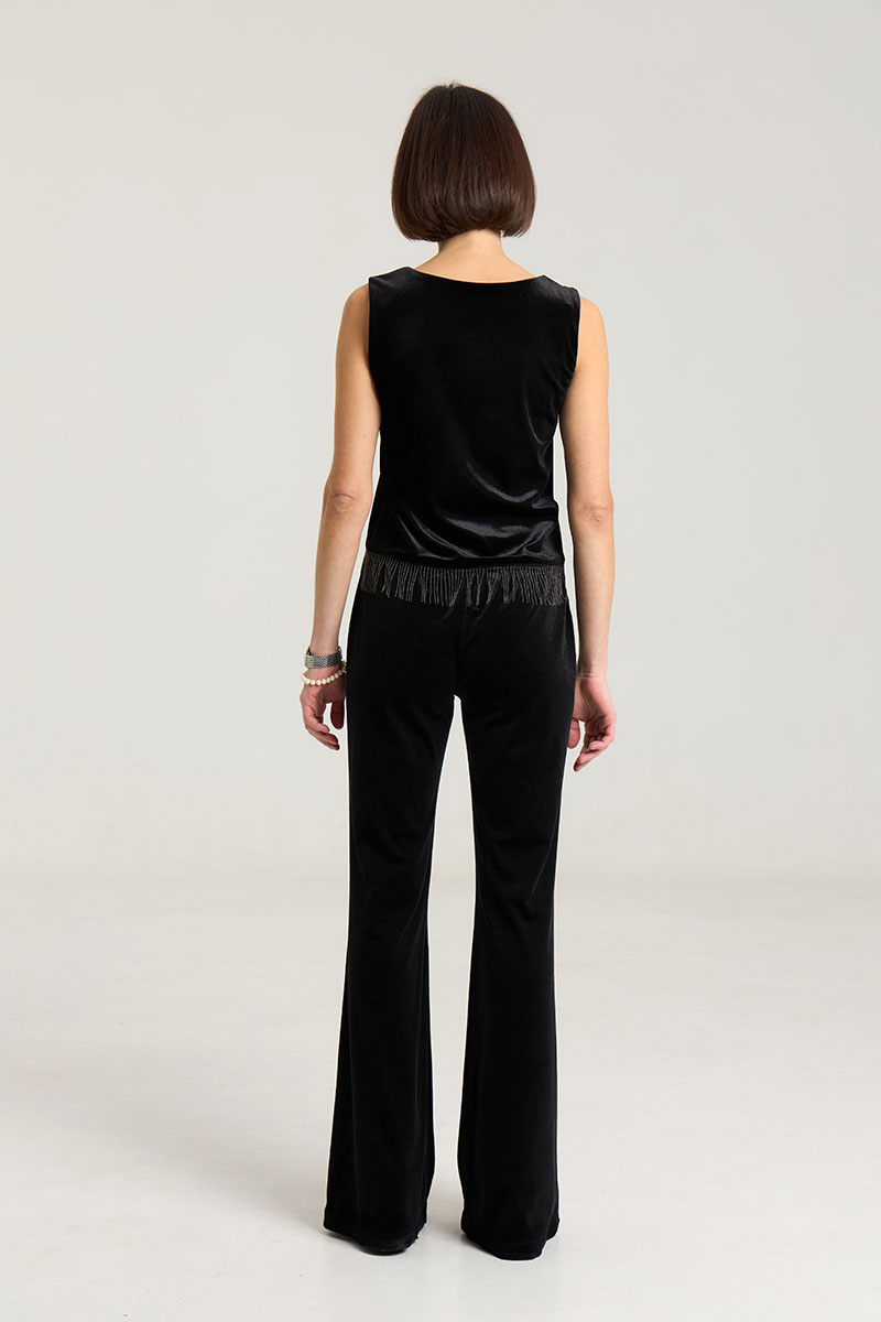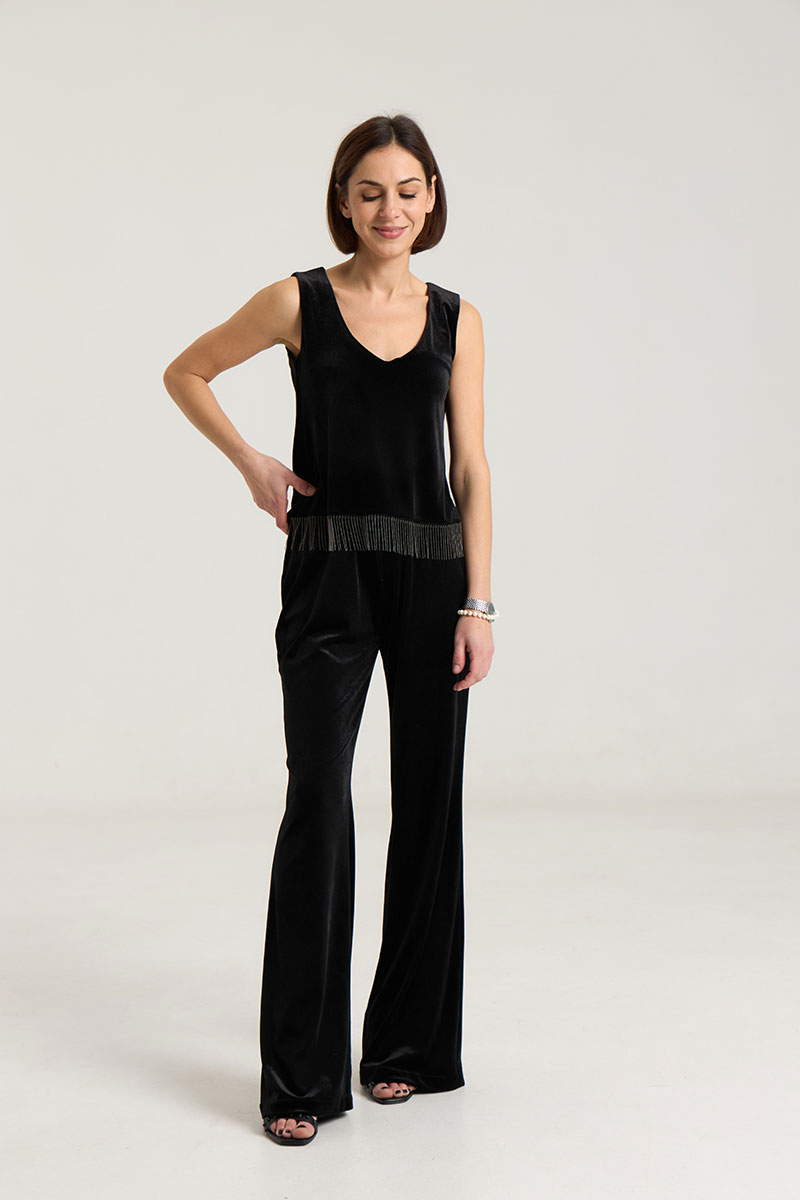 Комплект из топа и брюк.Брюки расклешенные свободного кроя из велюровой ткани - это не только модель для праздника. Талия высокая, брюки на резинке.