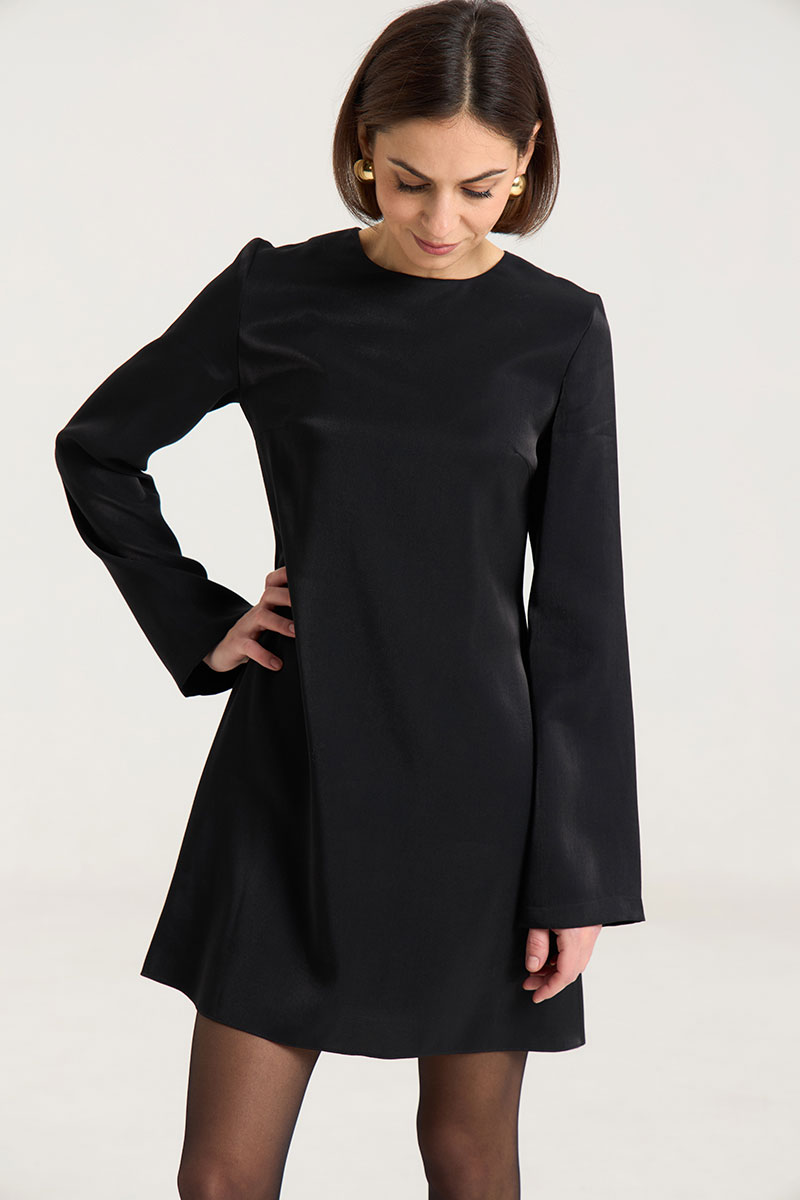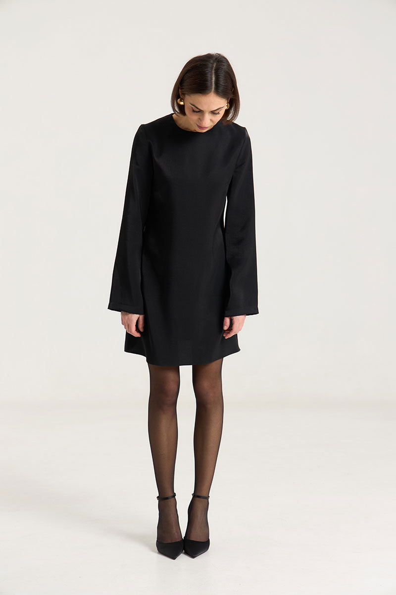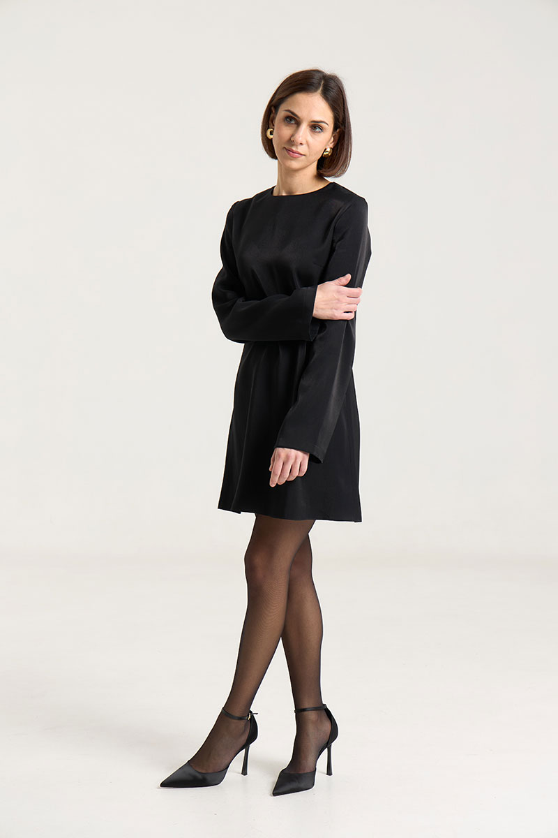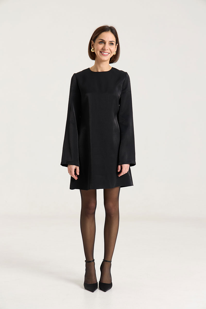 Платье полуприлегающего силуэта, расклешнное к низу, рукав свободный, втачной. По груди нагрудные выточки, по спинке талиевые выточки, застежка на потайную молнию в среднем шве. Платье выполнено из плотной атласной ткани красного цвета. Платье без подкладки. Рост модели на фото 168 см.