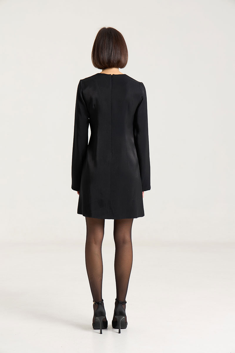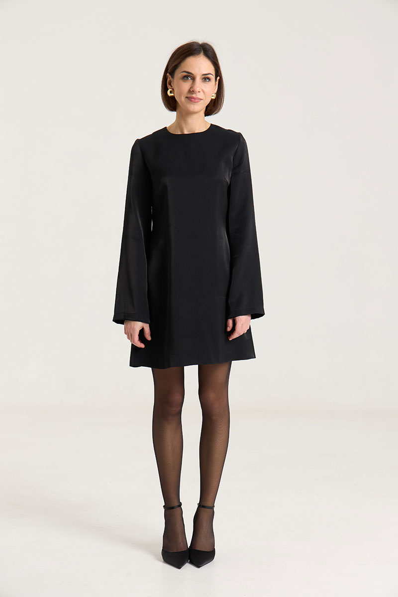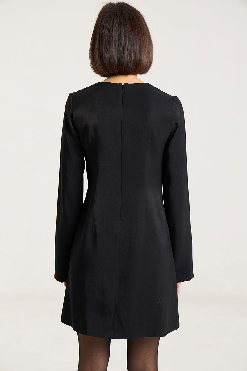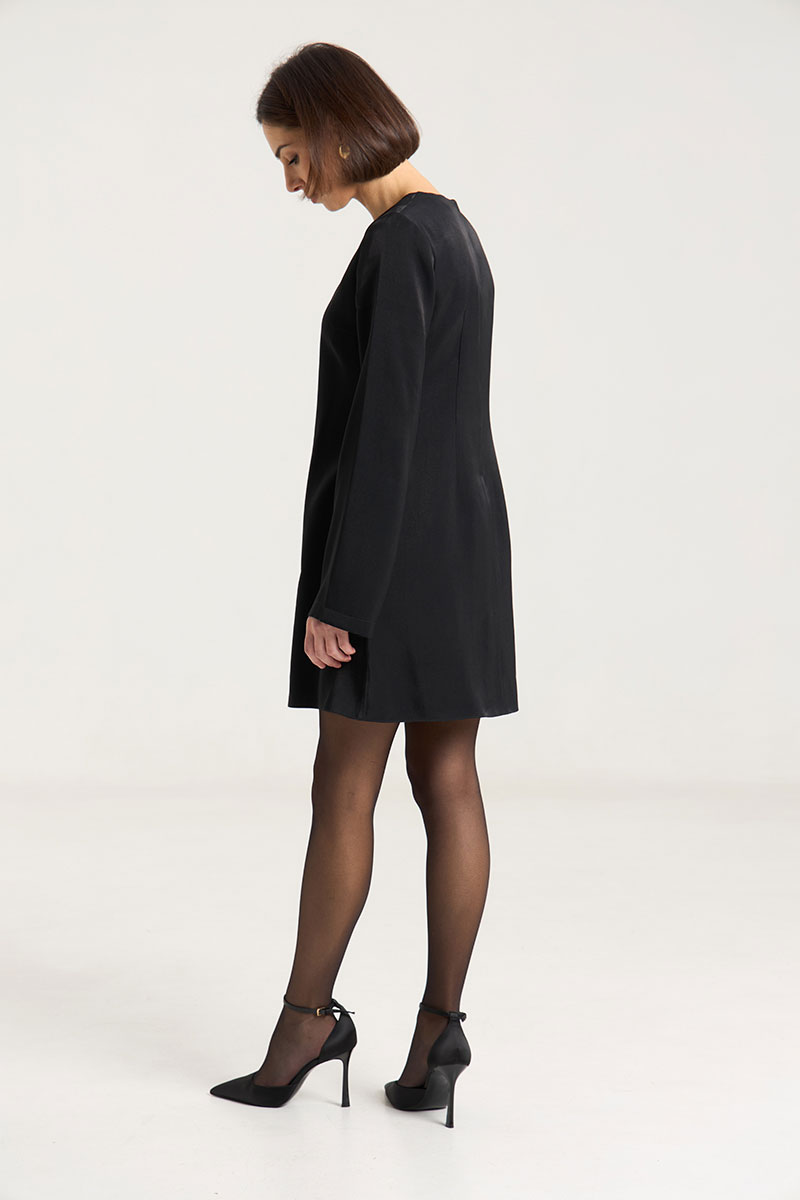 Платье полуприлегающего силуэта, расклешнное к низу, рукав свободный, втачной. По груди нагрудные выточки, по спинке талиевые выточки, застежка на потайную молнию в среднем шве. Платье выполнено из плотной атласной ткани красного цвета. Платье без подкладки. Рост модели на фото 168 см.