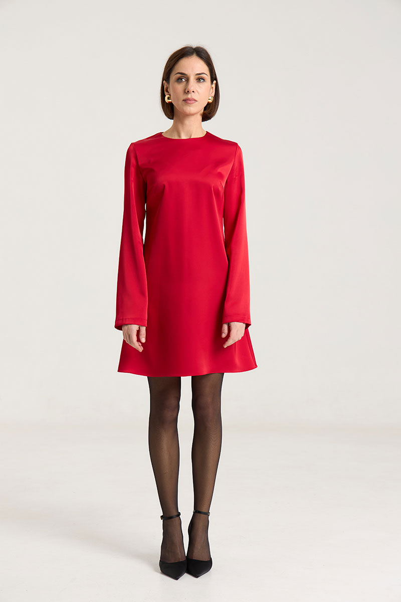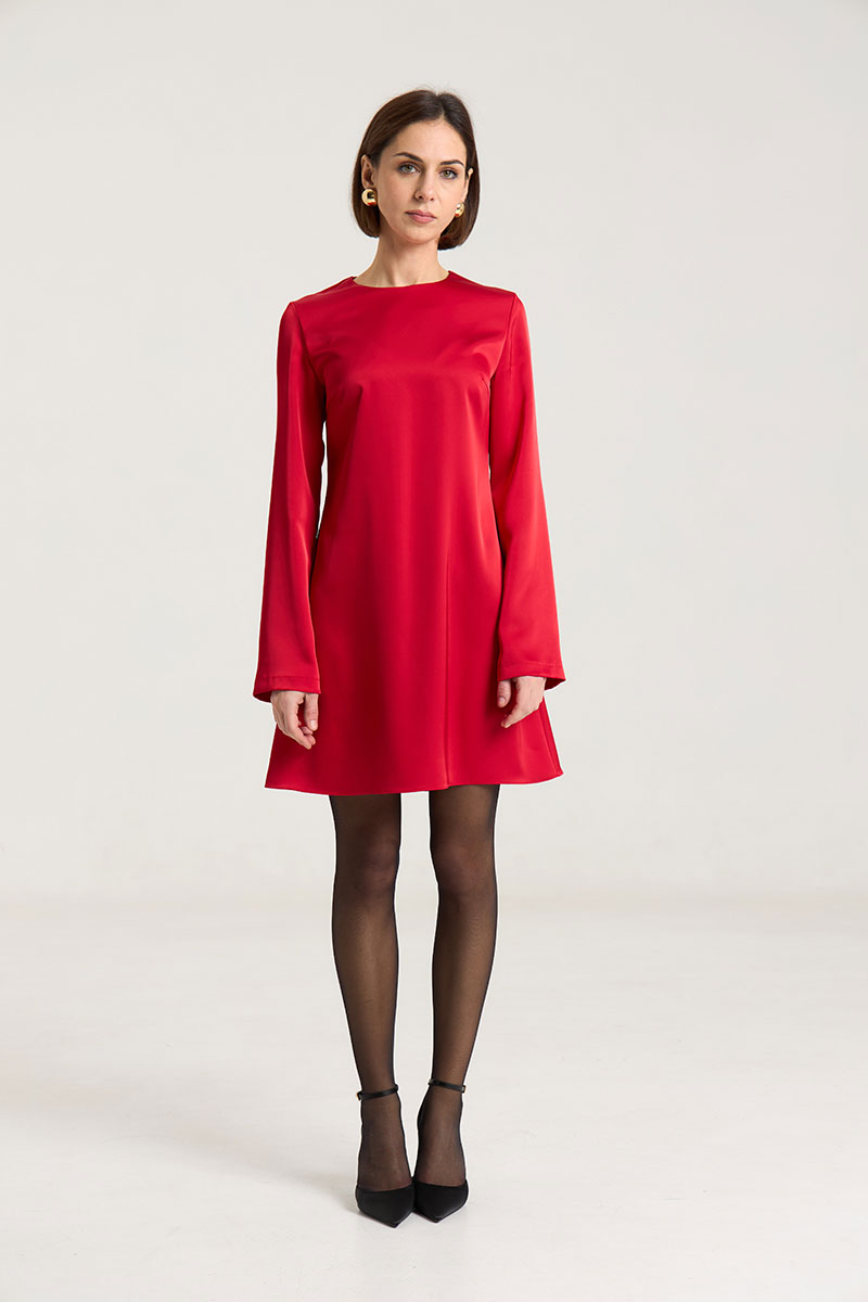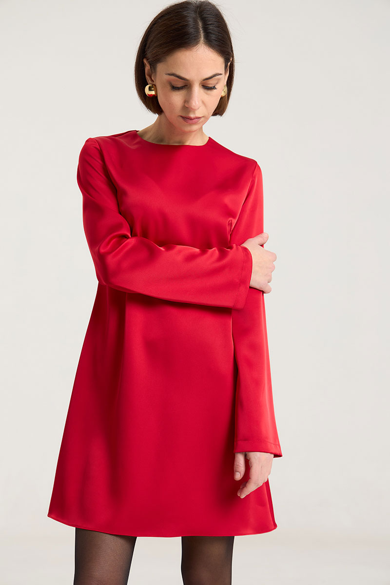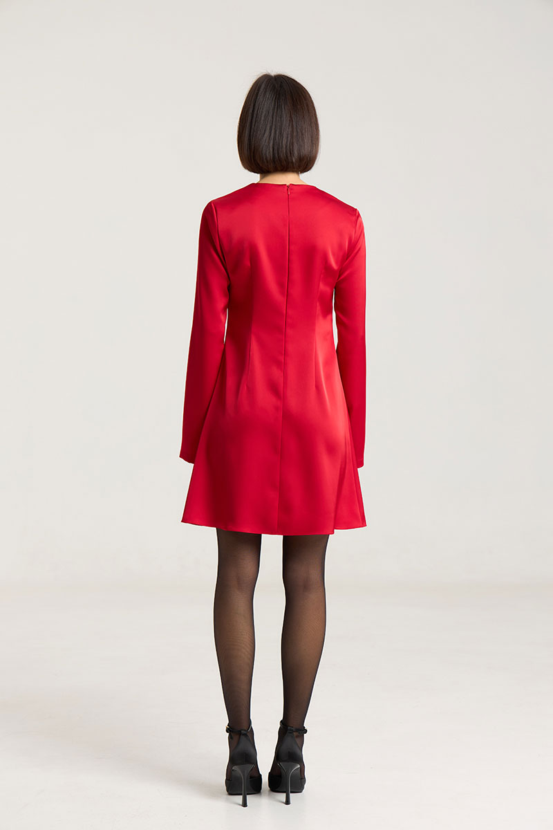 Платье полуприлегающего силуэта, расклешнное к низу, рукав свободный, втачной. По груди нагрудные выточки, по спинке талиевые выточки, застежка на потайную молнию в среднем шве. Платье выполнено из плотной атласной ткани красного цвета. Платье без подкладки. Рост модели на фото 168 см.
