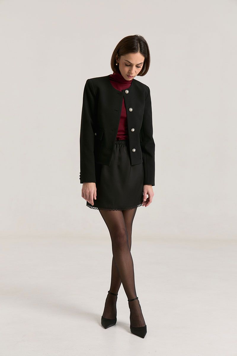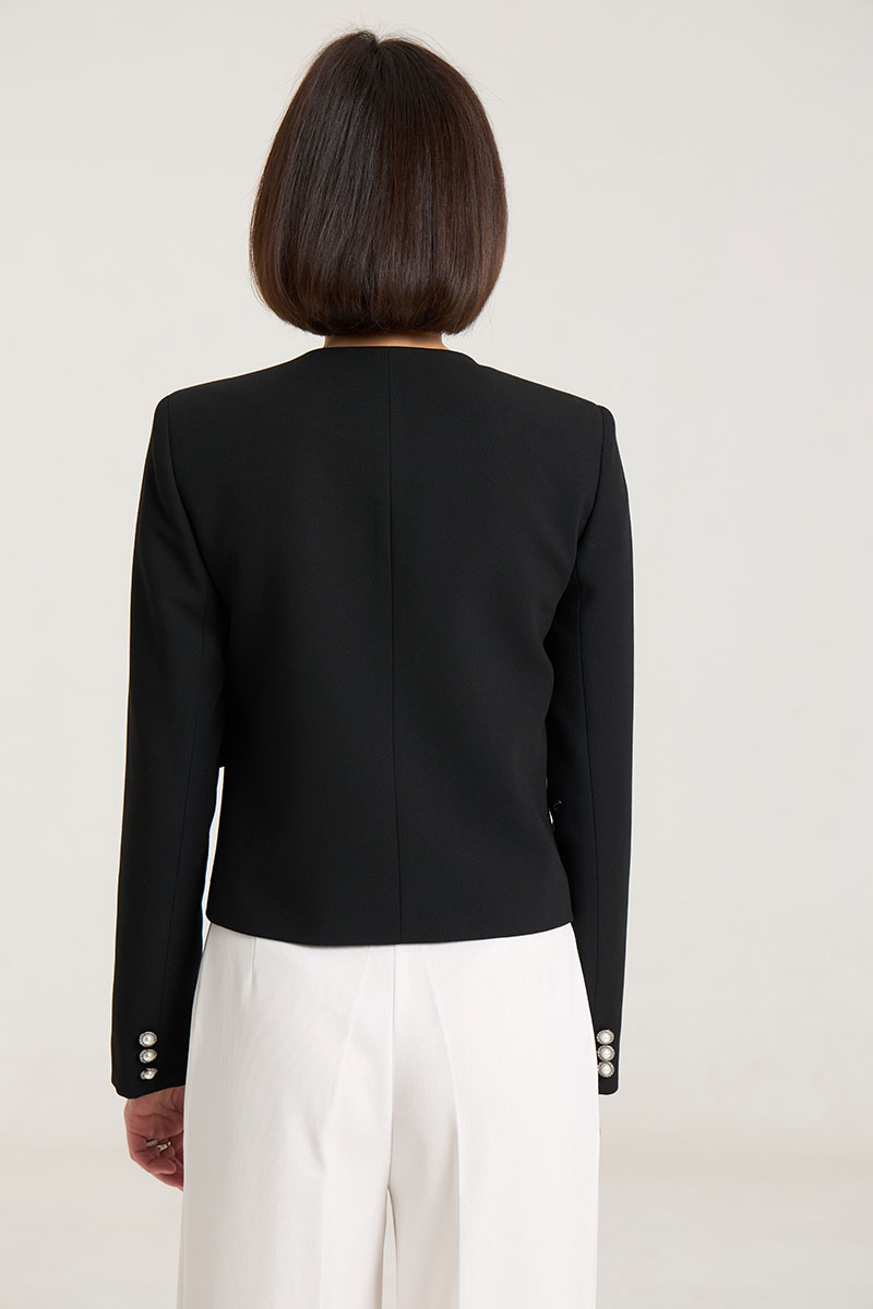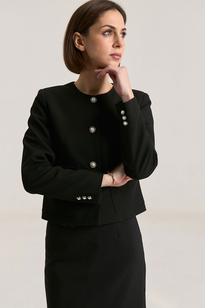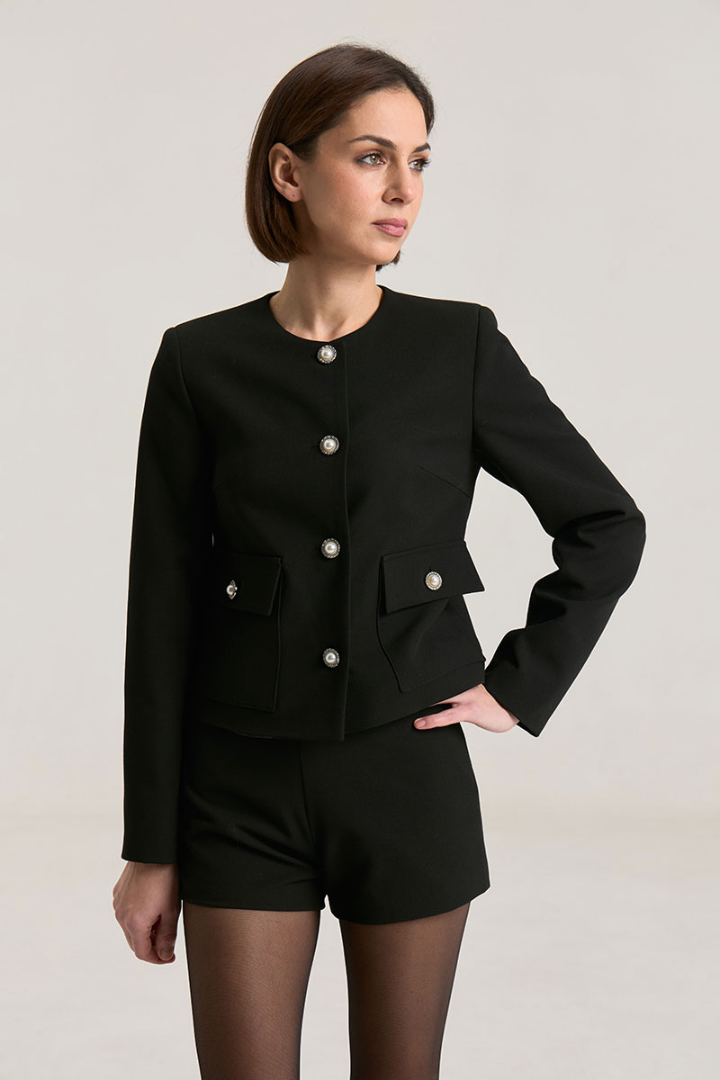 Жакет укороченный, , прямого силуэта, с втачными рукавами , горловина округлой формы, без воротника.По бокам накладные функциональные карманы с застежкой на петлю-пуговицу. Застёжка