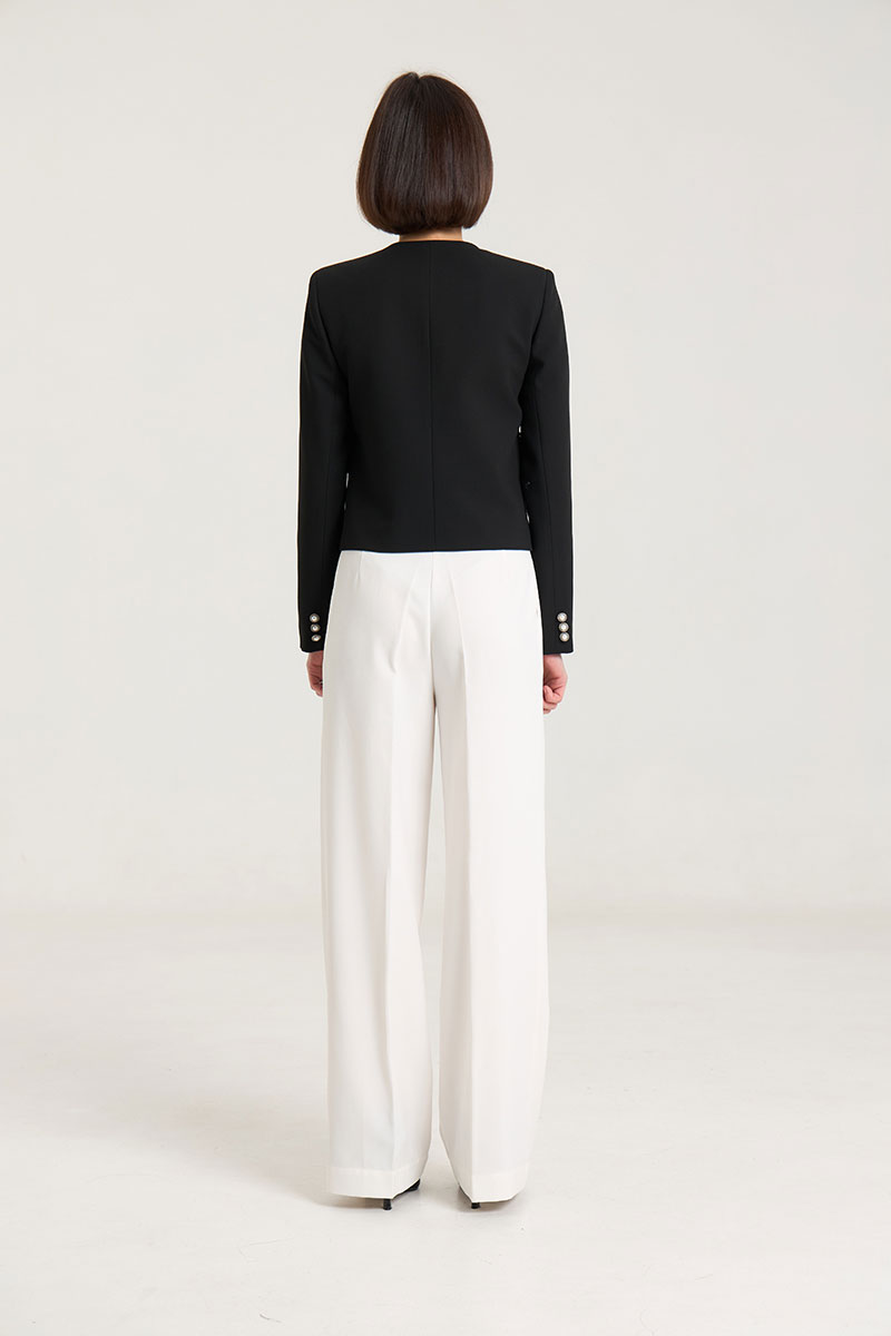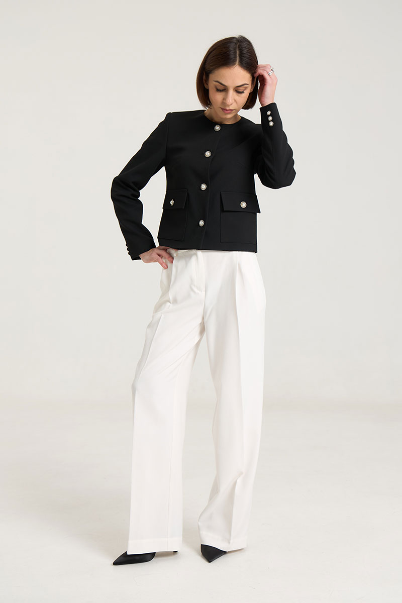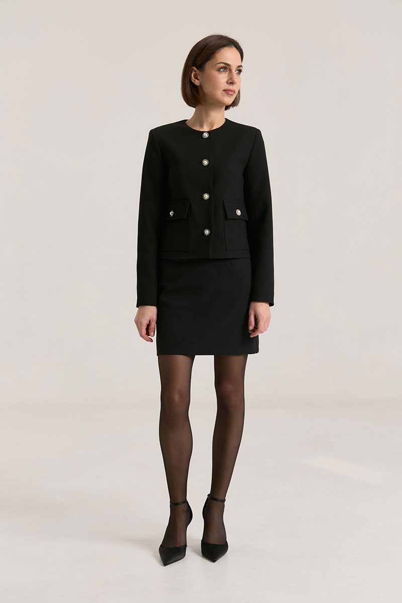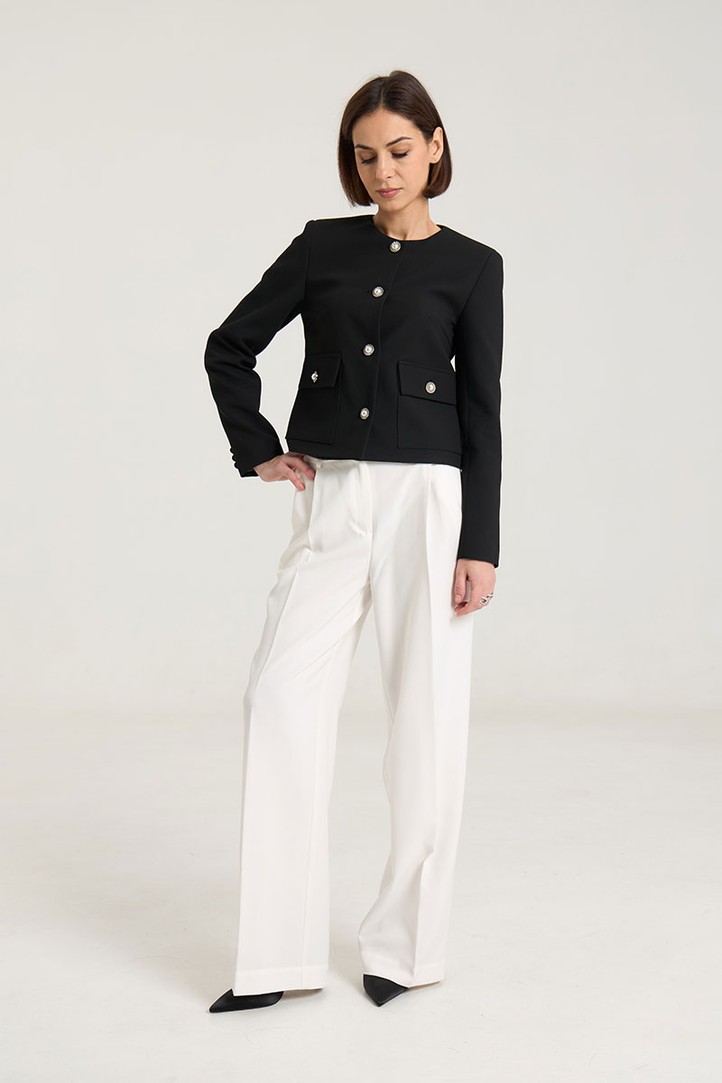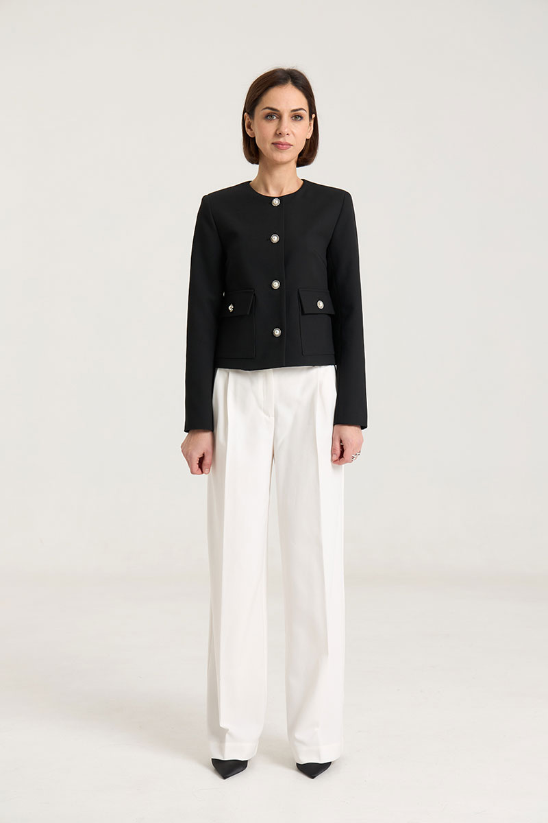 Жакет укороченный, , прямого силуэта, с втачными рукавами , горловина округлой формы, без воротника.По бокам накладные функциональные карманы с застежкой на петлю-пуговицу. Застёжка