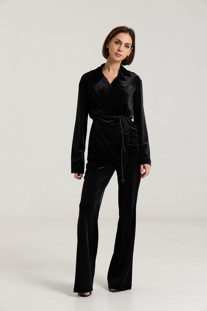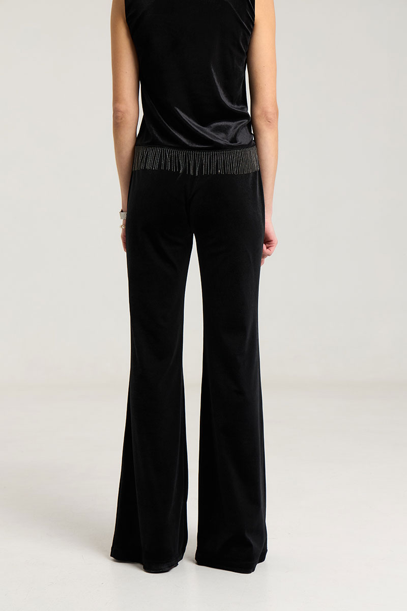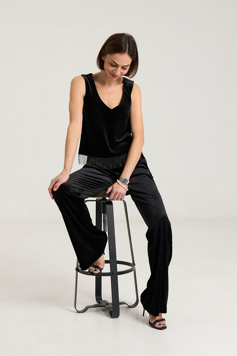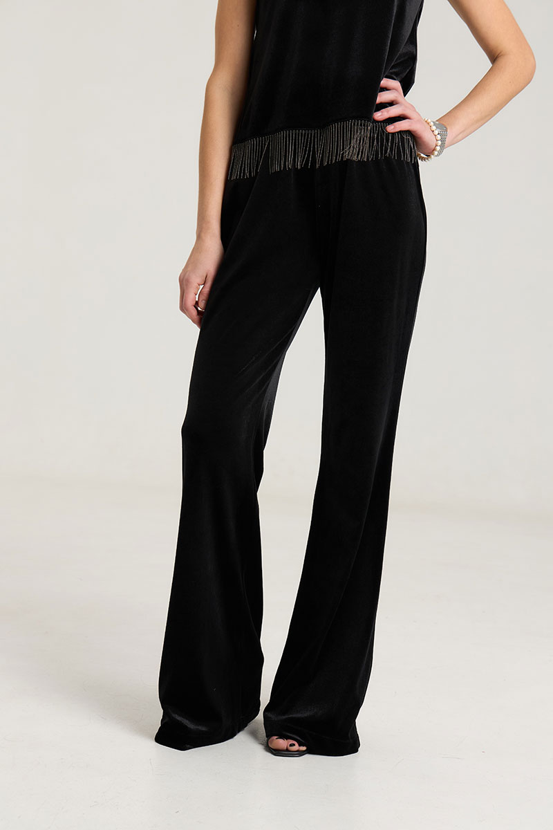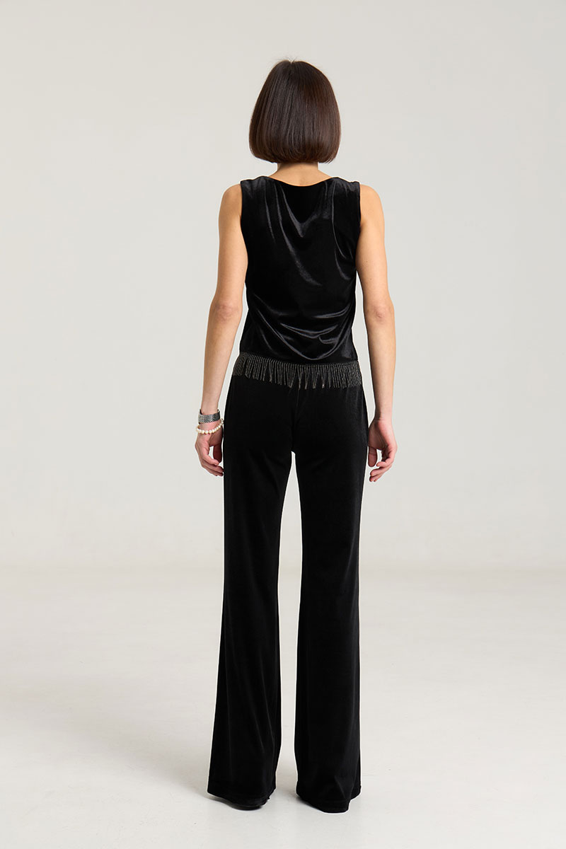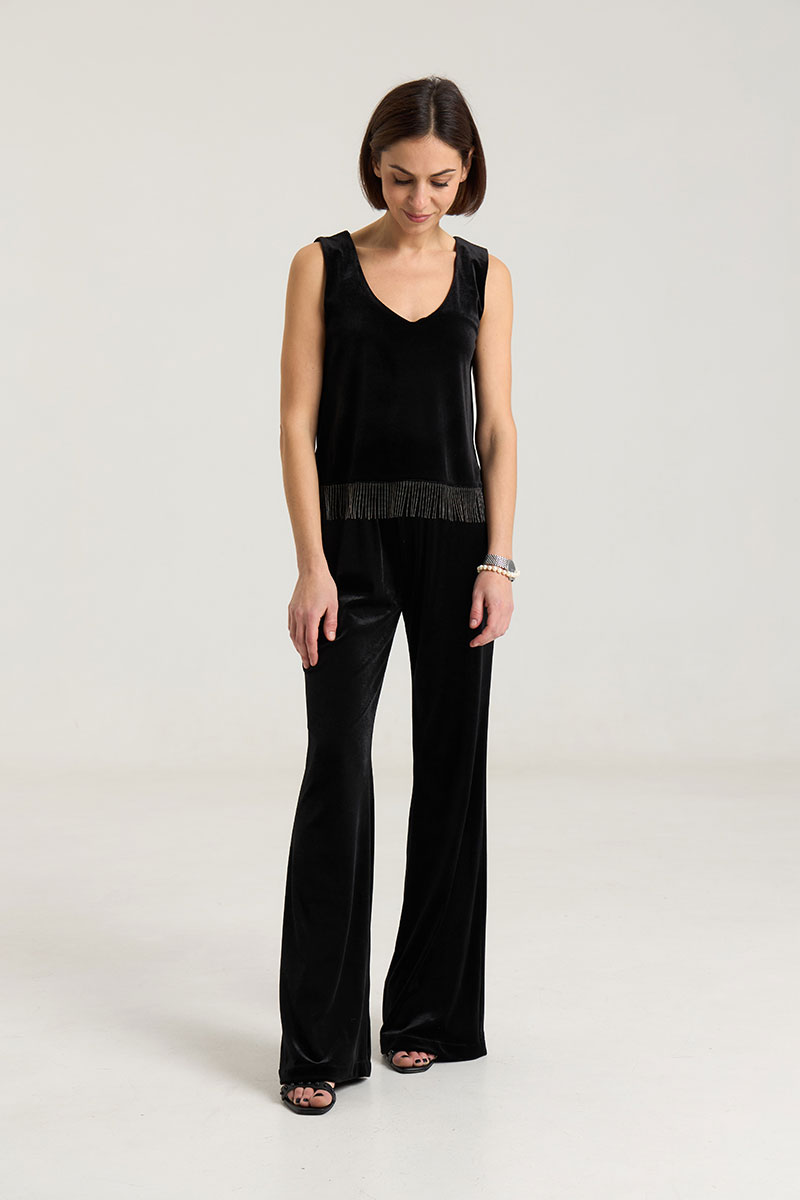 Брюки расклешенные свободного кроя из велюровой ткани - это не только модель для праздника. Данную модель можно сочетать с рубашкой, блузкой, жакетом из бархата арт. 2474 , топом арт. 2468 дополнить образ различными аксессуарами, обувью на плоской подошве, обувью на шпильке ,также подойдут кеды или кроссовки для более повседневных образов в сочетании с футболкой и кожаной курткой. Талия высокая, брюки на резинке.