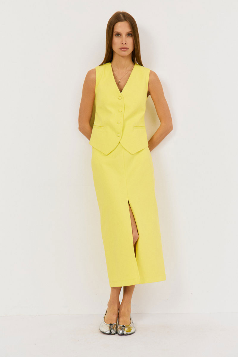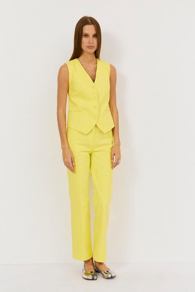 Жилет выполнен из хлопковой джинсовой ткани в ярком лимонном цвете, жилетка приталенного силуэта с застежками по переду на петли-пуговицы. По переду талиевые выточки, карманы прорезные в рамку, вырез V-образный, спинка разрезная по центру с одной талиевыми выточками. Жилет на подкладке из хлопка.