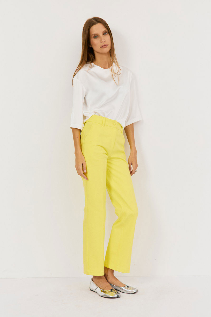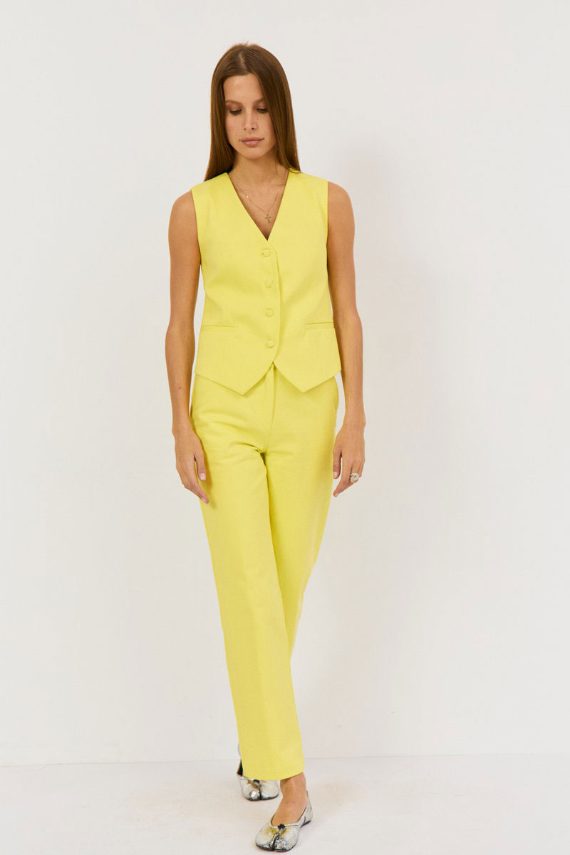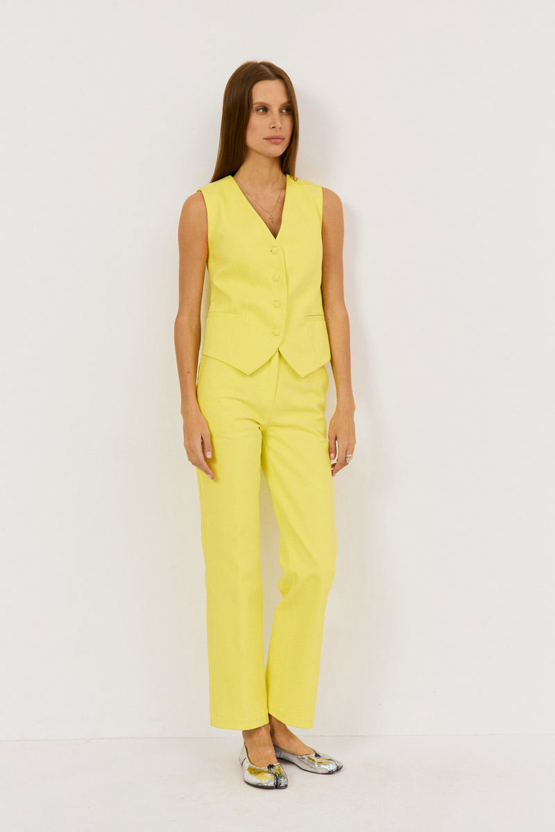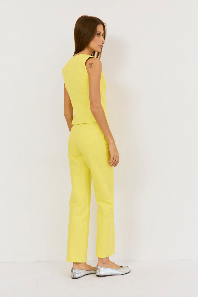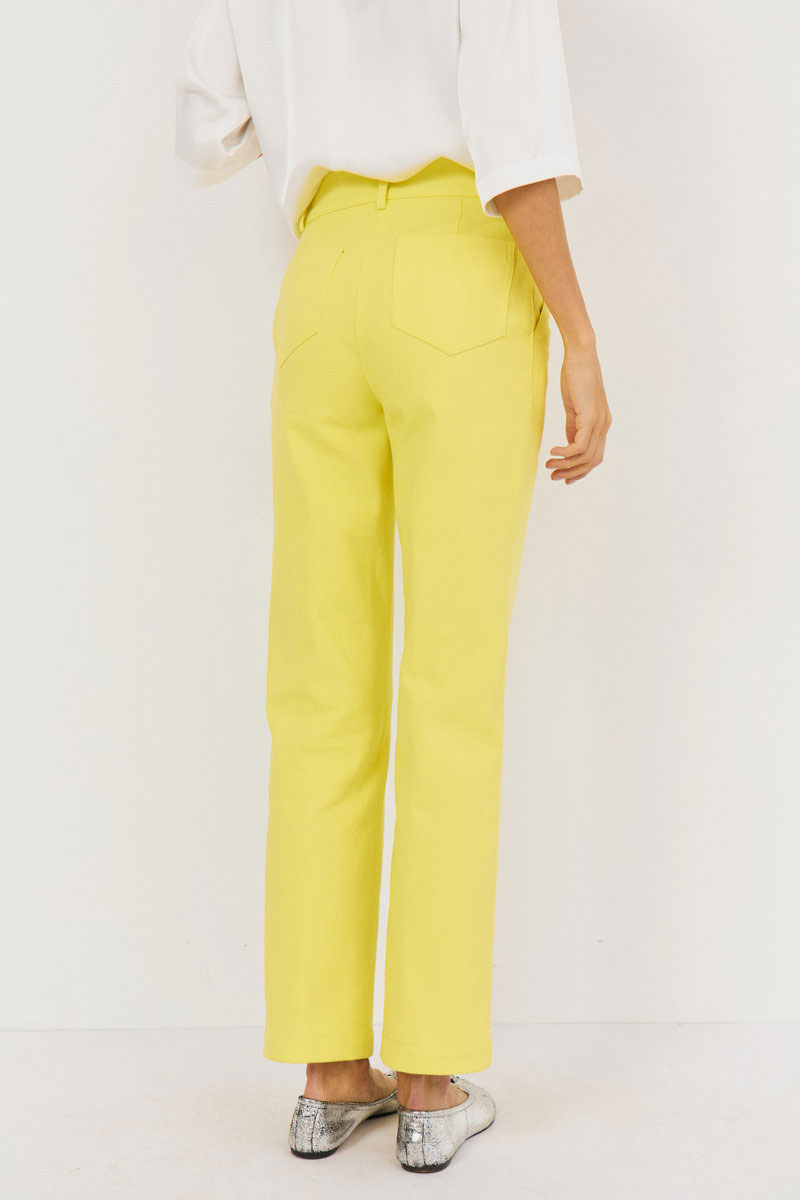 Брюки прямые,выполнены из хлопковой джинсовой ткани в лимонном цвете, пояс притачной со шлевками, застежка на петлю-пуговицу, по переду гульфик с застежкой на молнию, сзади на задних половинках брюк карманы , спереди боковые функциональные карманы, посадка высокая.Брюки красиво сочетаются с любым светлым или черным верхом.