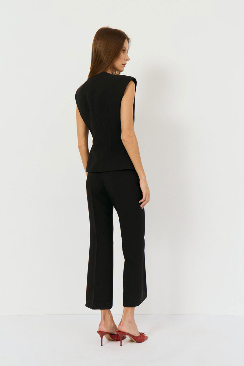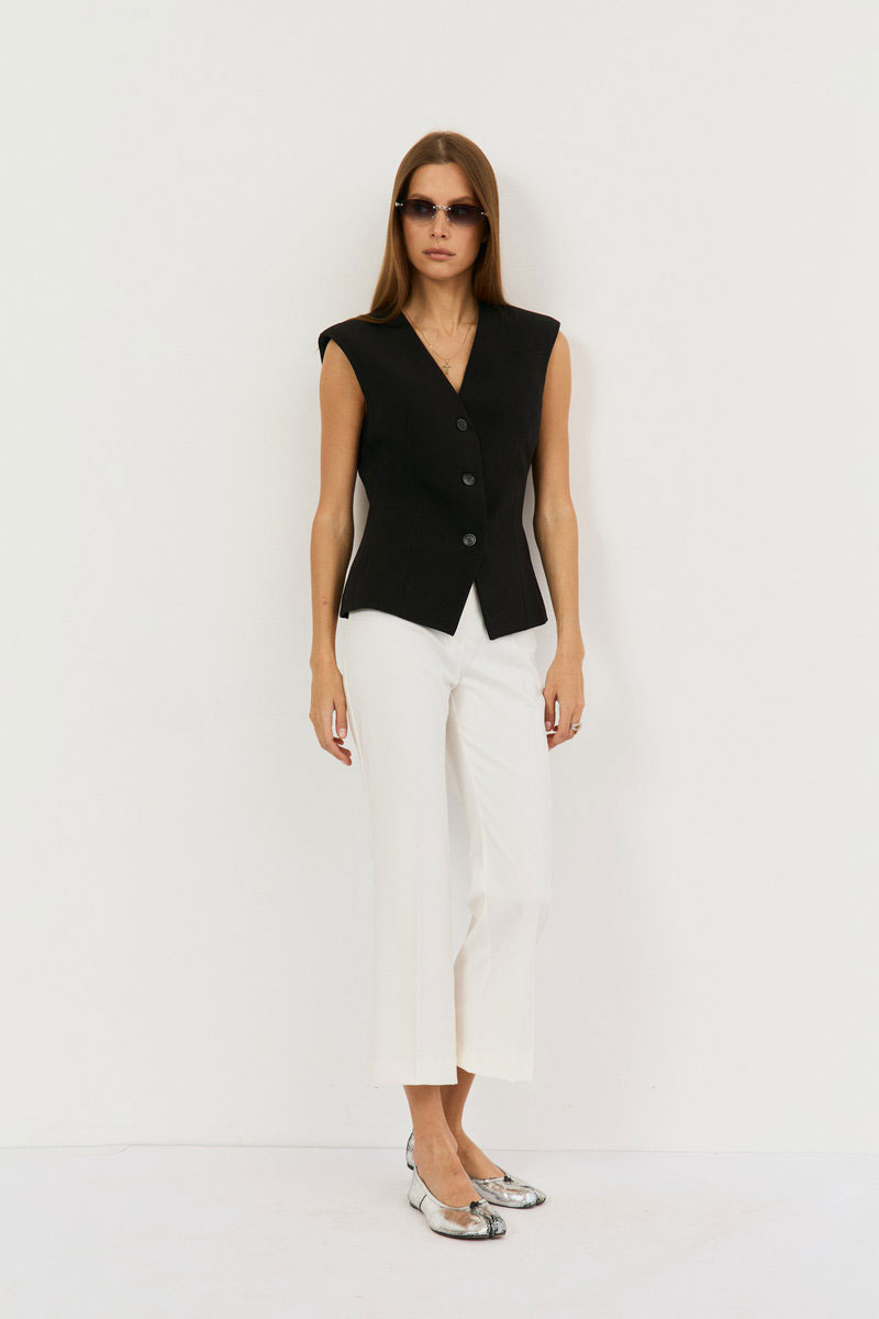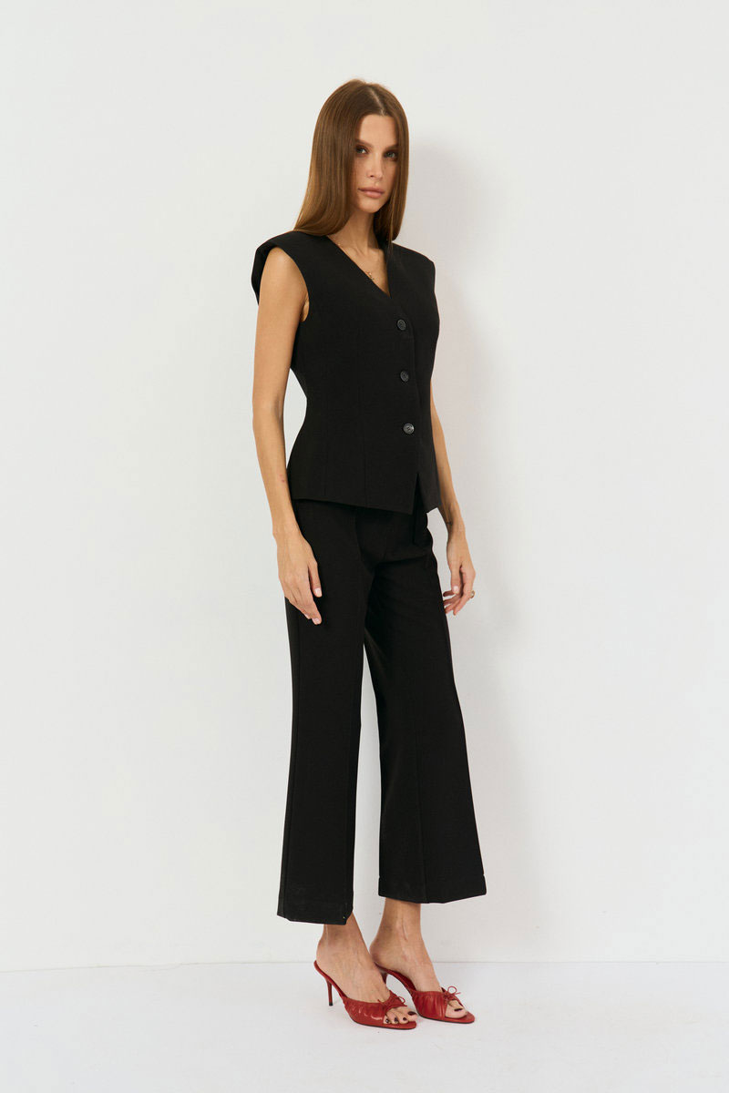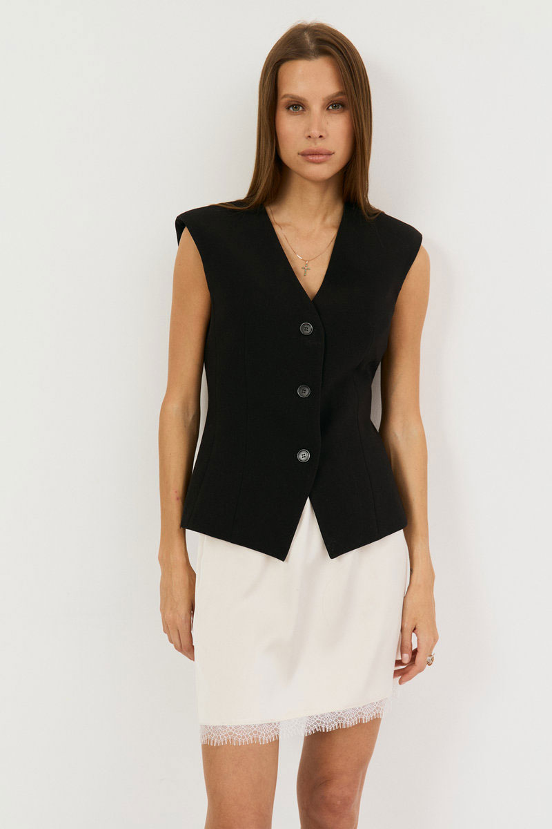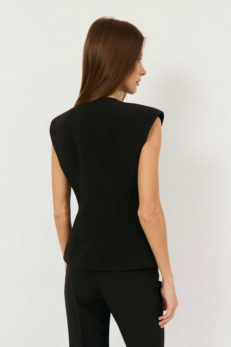 Жилетка выполнена из костюмной ткани, приталенного силуэта. По переду две талиевые выточки, вырез V-образный, спинка разрезная по центру сдвумя талиевыми выточками. Жилетка на подкладке с плечевыми накладками. Застежка по переду на функциональные три петли-пуговицы.