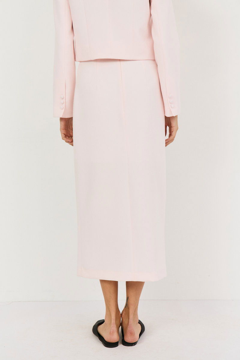 Юбка выполнена из костюмной ткани в нежном розовом цвете. Юбка на притачном поясе со шлевками,сзади застежка на потайную молнию, по переду высокий разрез.Юбка на подкладке. Юбку можно сочетать с любым верхом: топы, футболки, блузы, жилетки, жакеты.