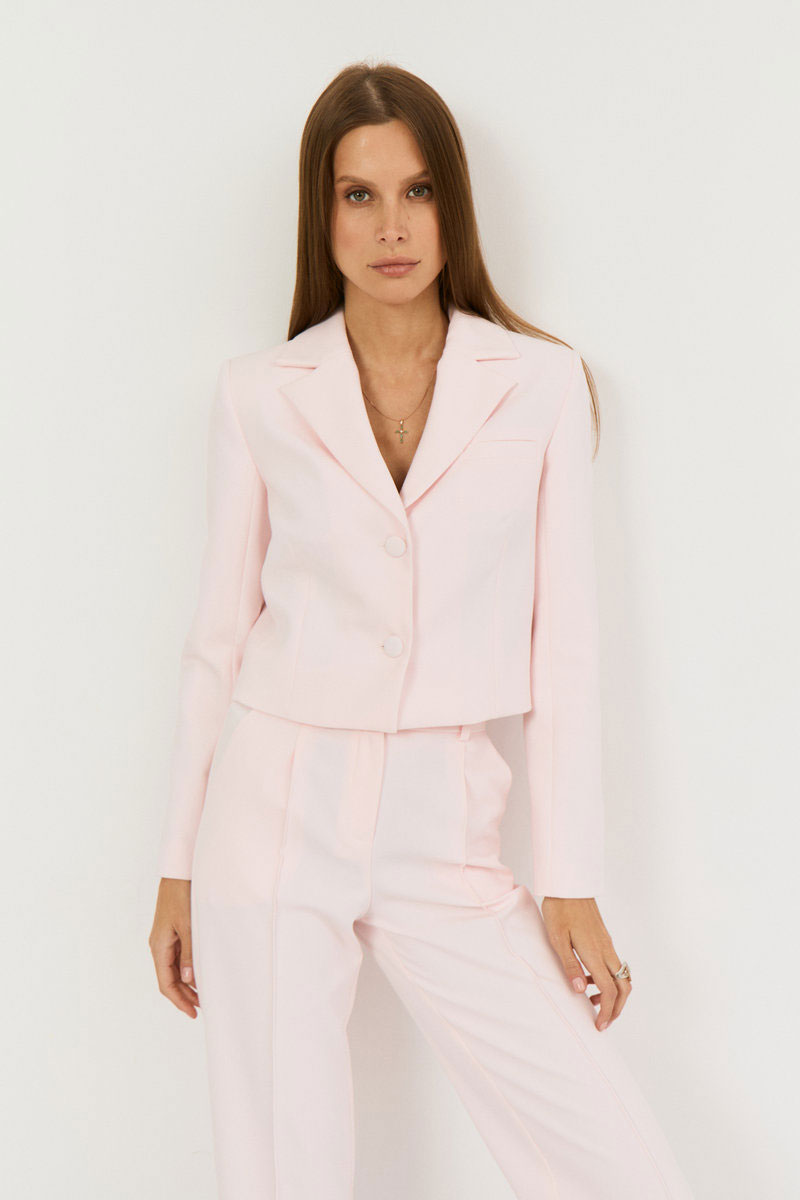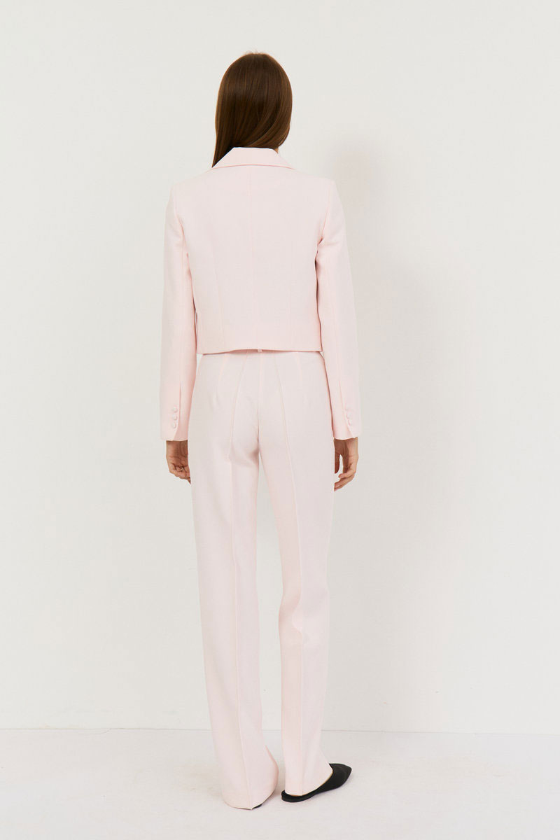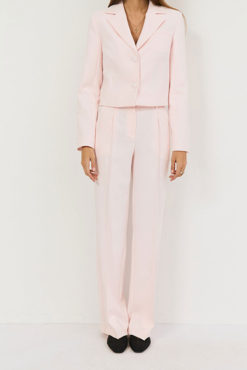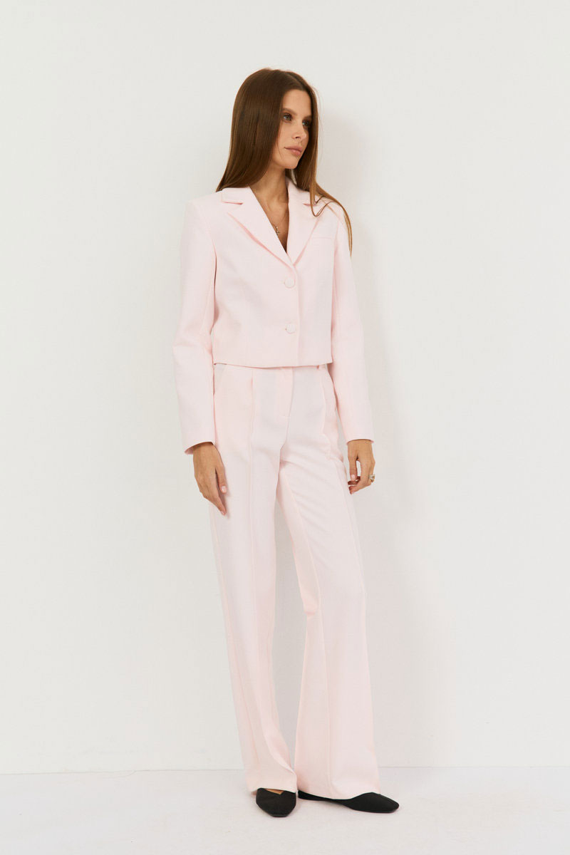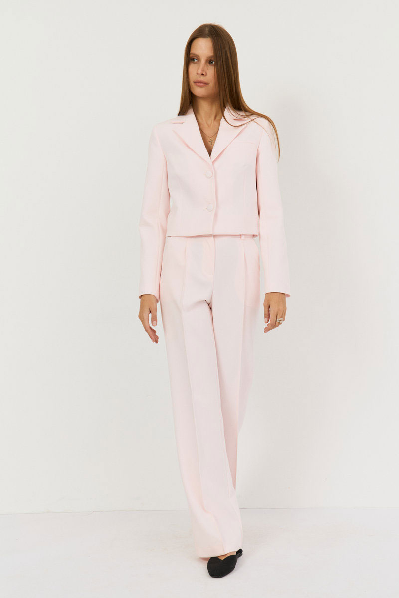 Брюки прямые, выполнены из костюмной ткани в нежном розовом цвете, пояс притачной со шлевками, застежка на петлю-пуговицу, по переду гульфик с застежкой на молнию.Посадка высокая. По переду и сзади отстроченные стрелки, спереди боковые функциональные карманы.